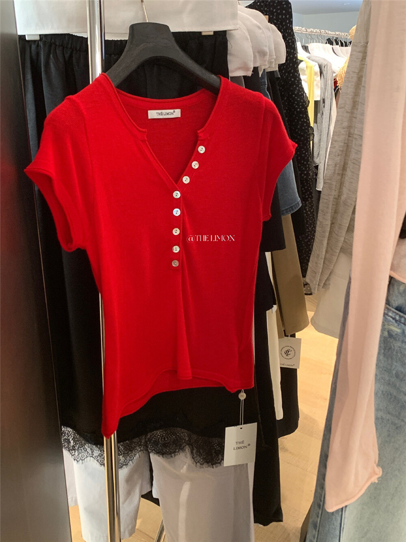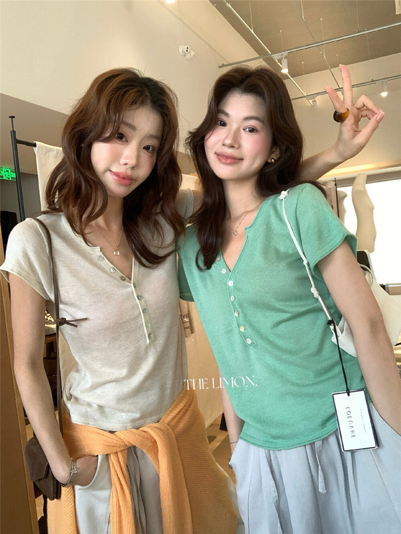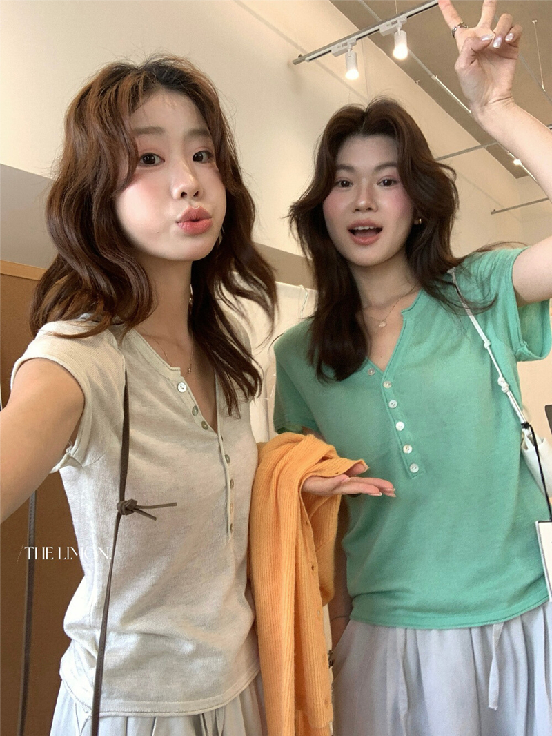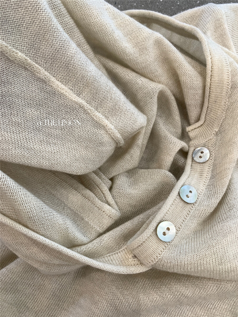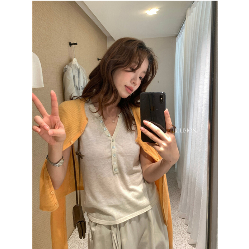 헨리 셔츠 레몬 녹차 반 개방 칼라 단추 긍정적 인 어깨 몸매 가꾸기 슬림해 보이는 니트 스웨터 다용도 디자인 센스 맨위