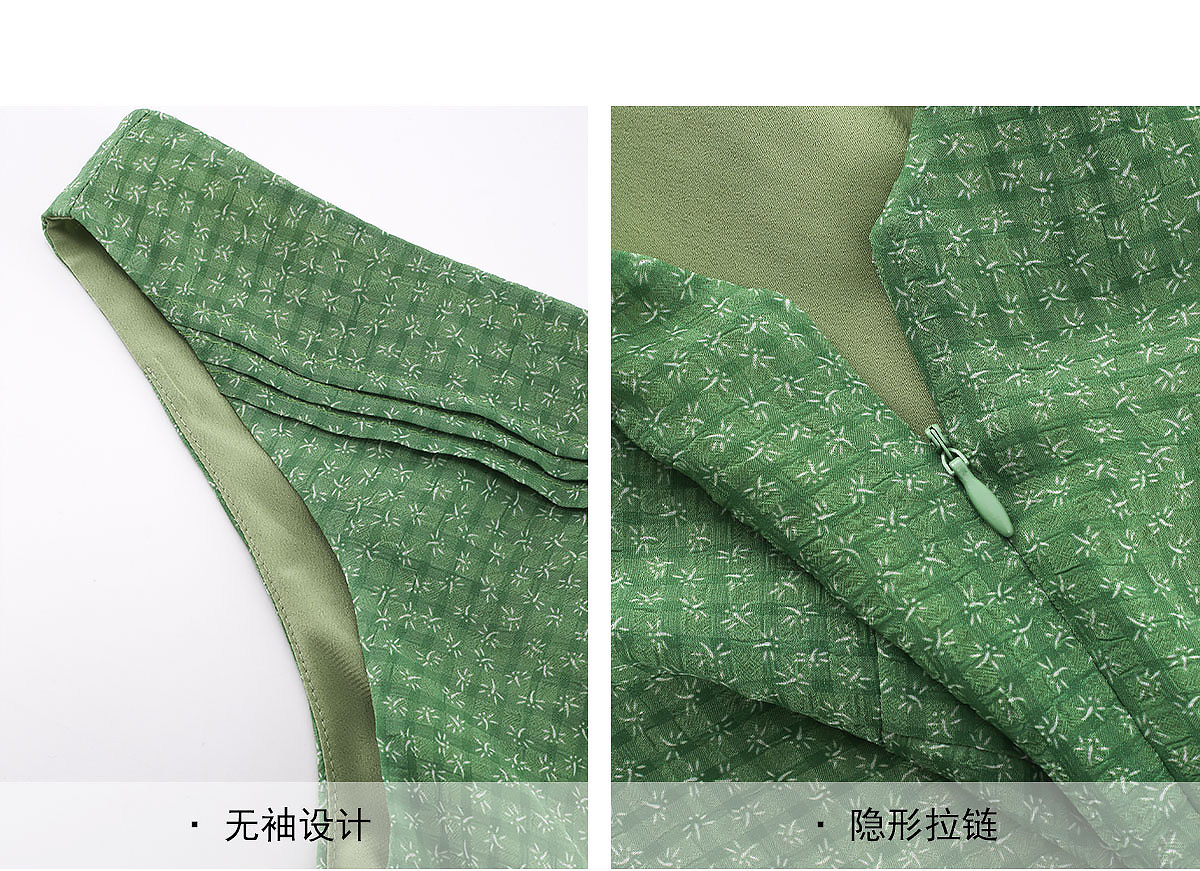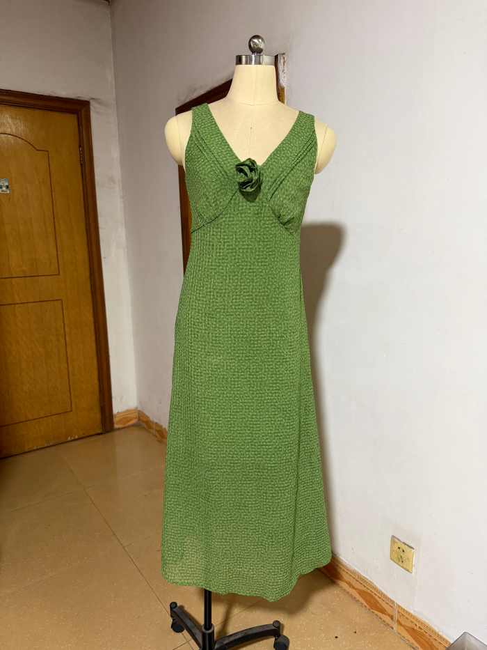 dh 대 꽃 남자 와일드 녹색 상황 프랑스식 레트로 센스 3 차원 꽃 체크무늬 허리 수축 V넥 민소매 여성 드레스