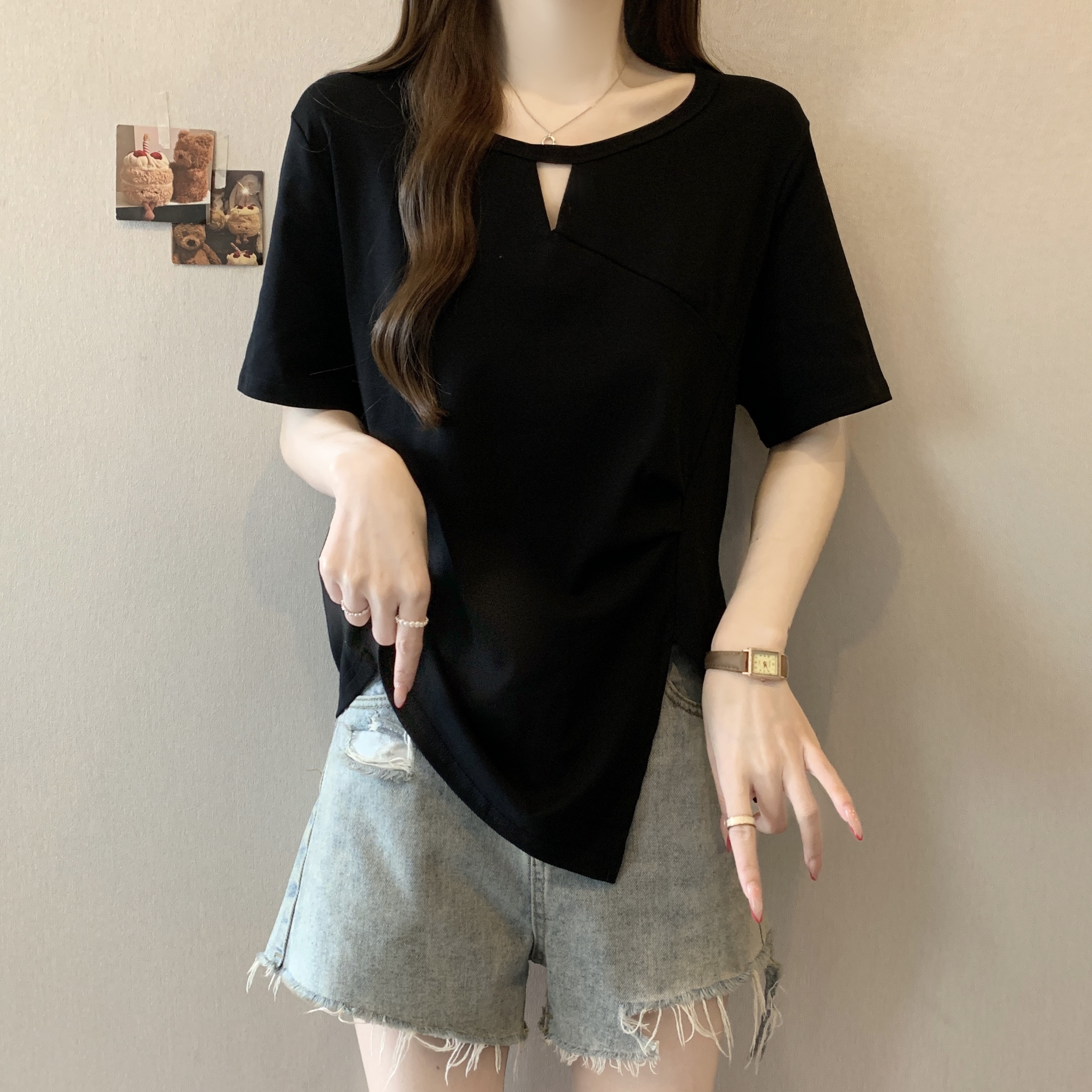 빅 사이즈 불규칙 비스듬한 칼라 반팔 티셔츠 여성 여름 새로운 지방 m 루즈핏 슬림해 보이는 다용도 외국 가스 디자인 센스 맨위