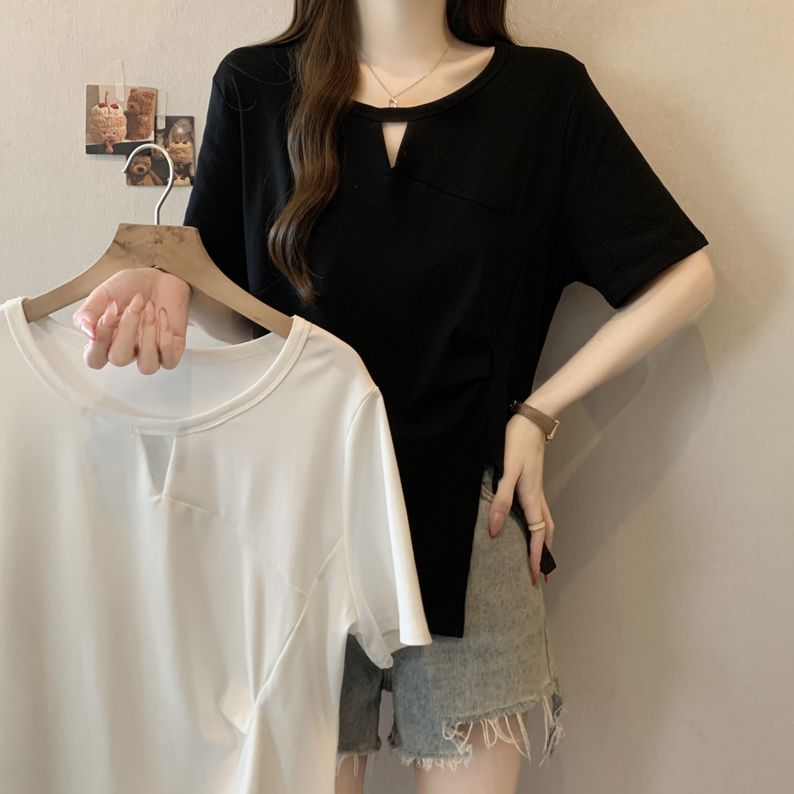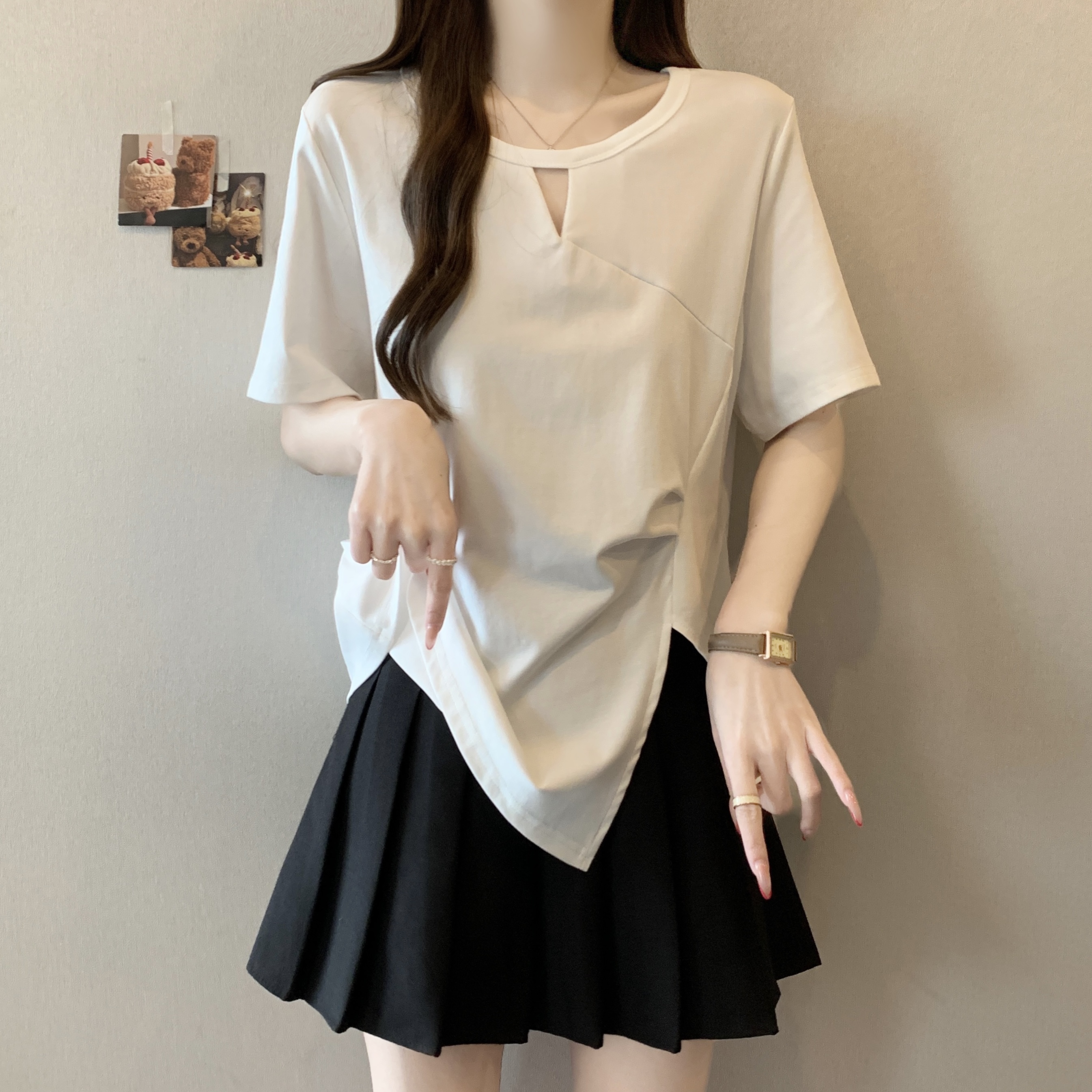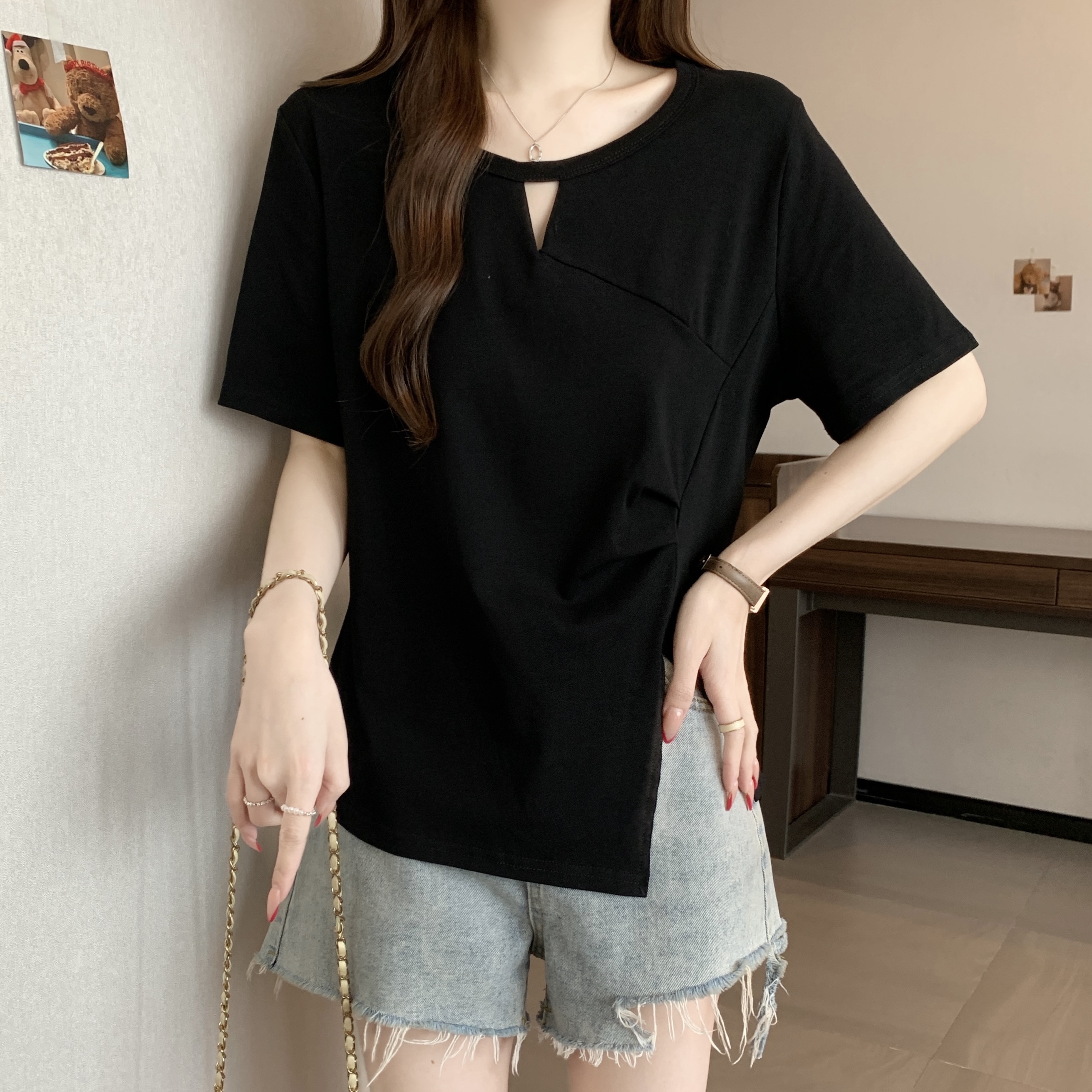 실사 빅 사이즈 불규칙 홀로우 아웃 디자인 센스 주름 티셔츠 지방 mm 슬림해 보이는 긍정적 인 어깨 반팔 허리 수축 맨위 여성 여름