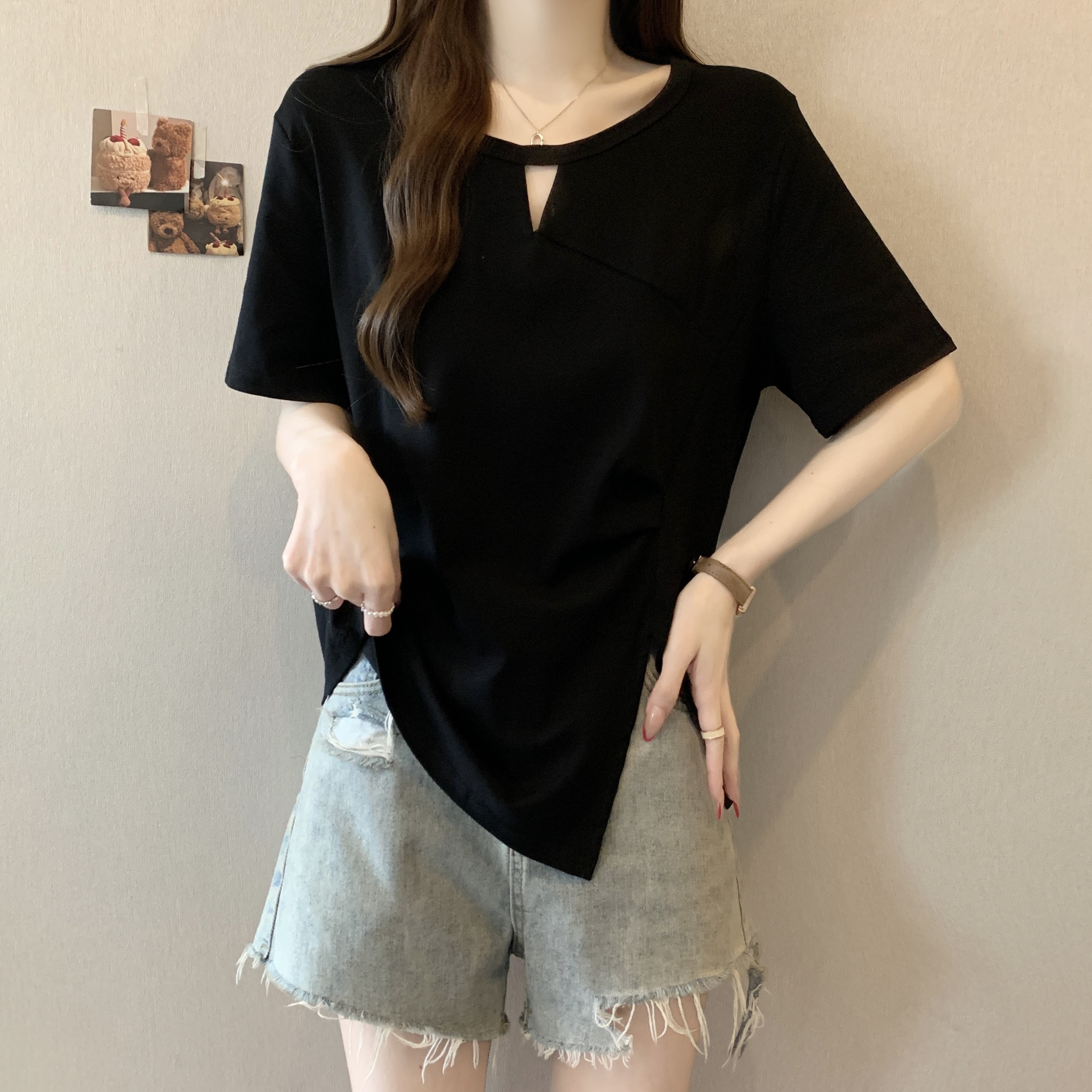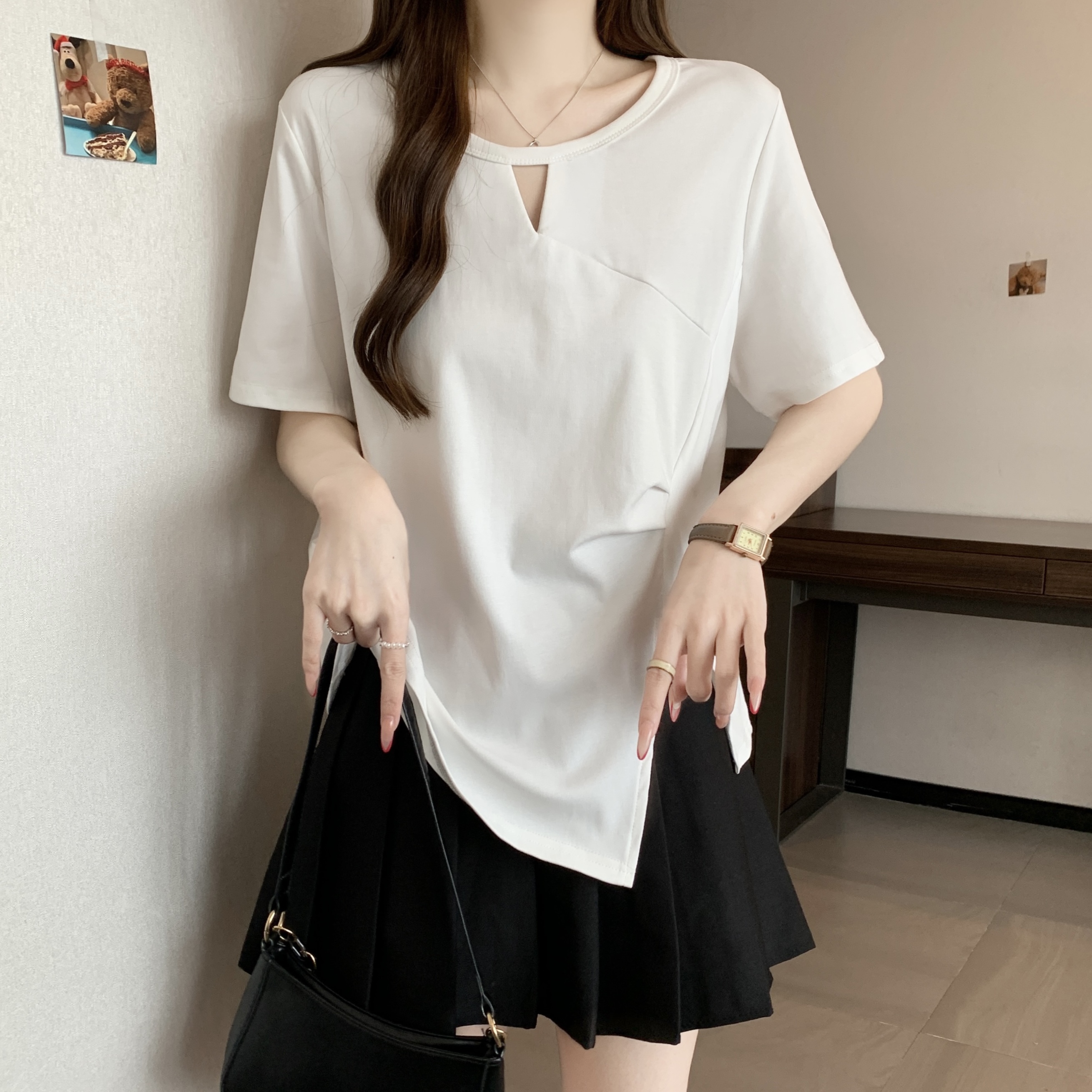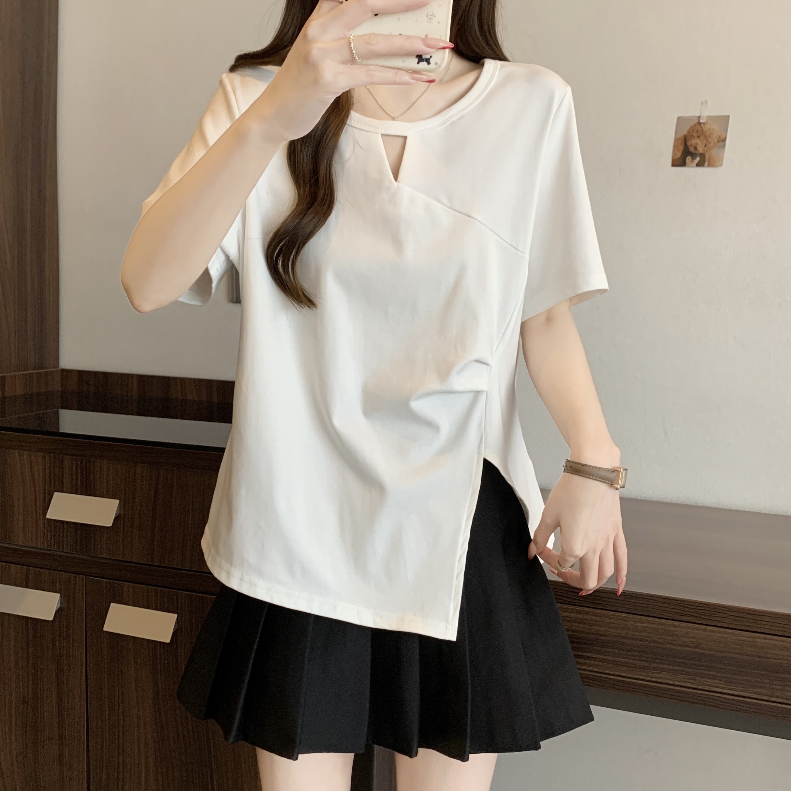 실사 빅 사이즈 불규칙 홀로우 아웃 디자인 센스 주름 티셔츠 지방 mm 슬림해 보이는 긍정적 인 어깨 반팔 허리 수축 맨위 여성 여름