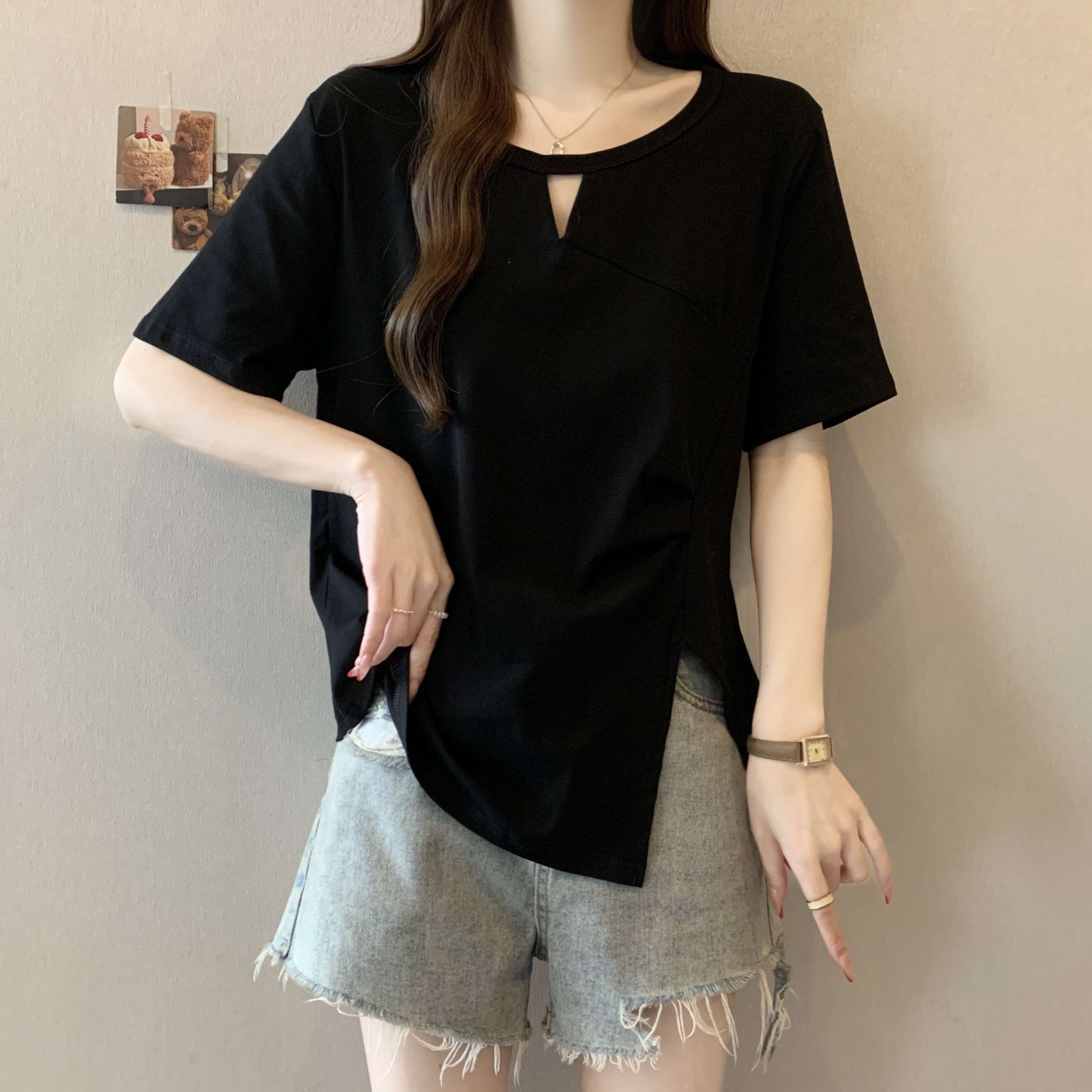 실사 빅 사이즈 지방 mm 디자인 센스 작은 심장 기계 행침 목 홀로우 아웃 오프숄더 외국 가스 다용도 티셔츠 맨위