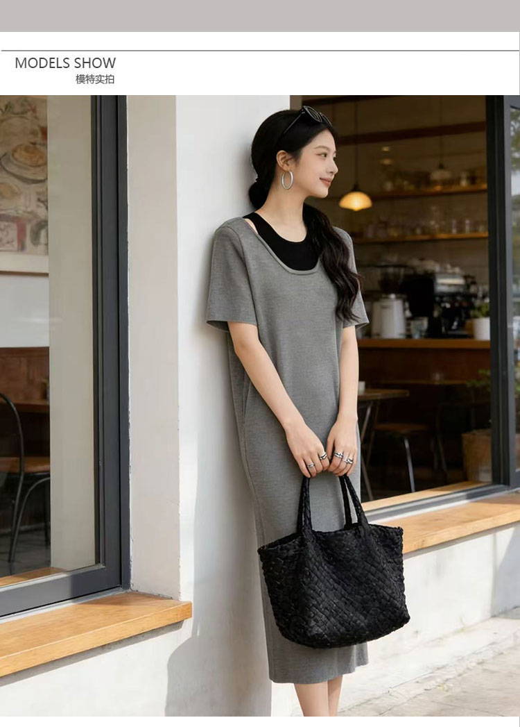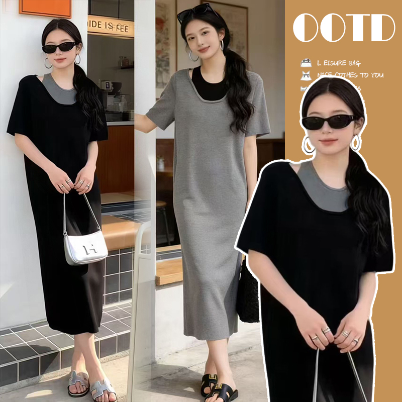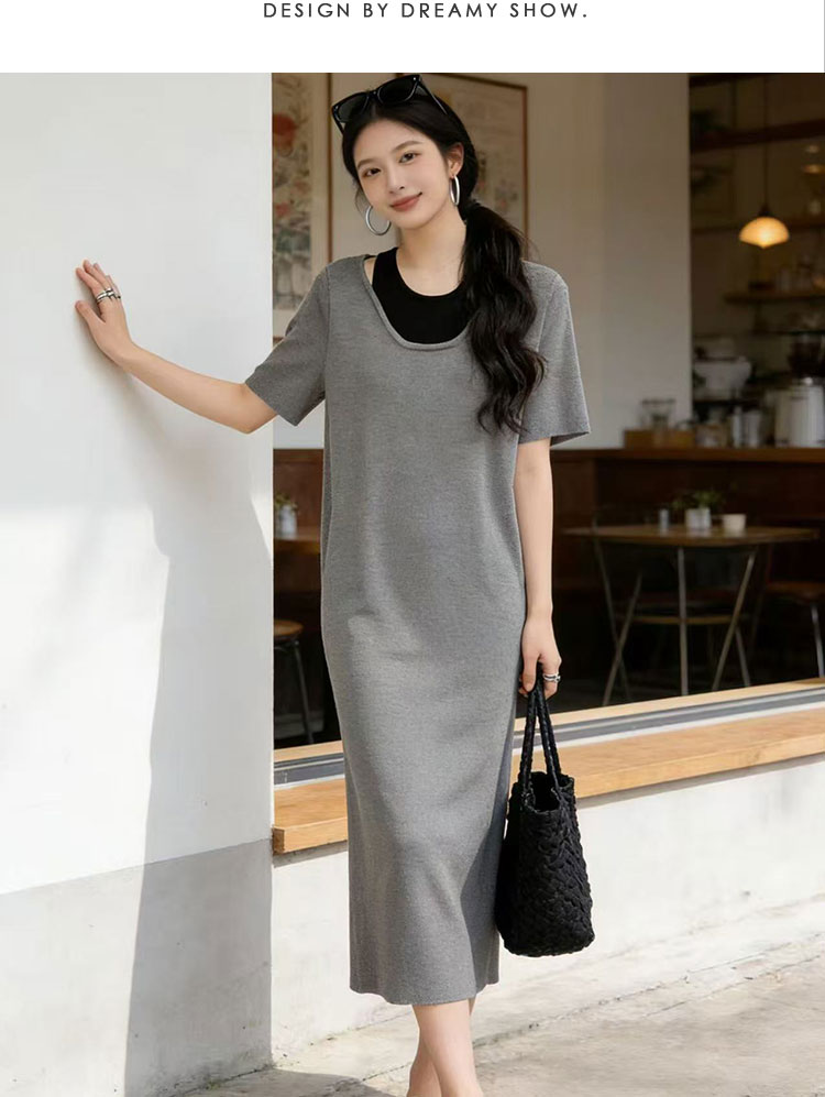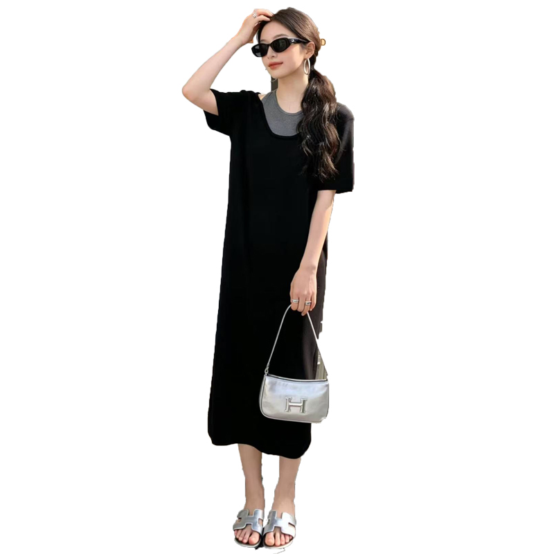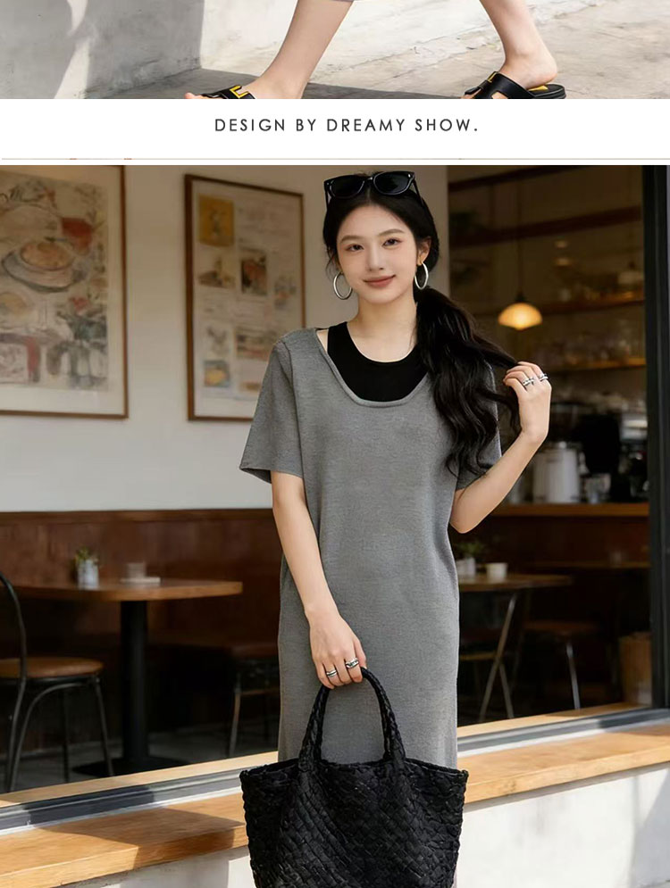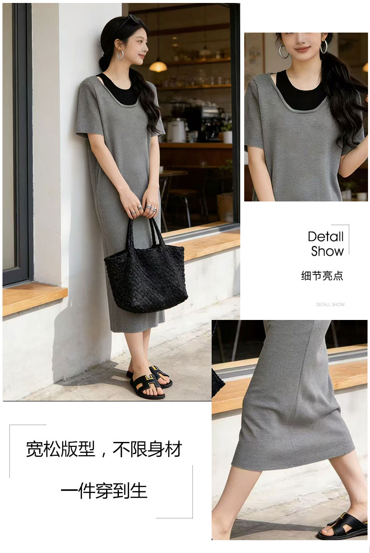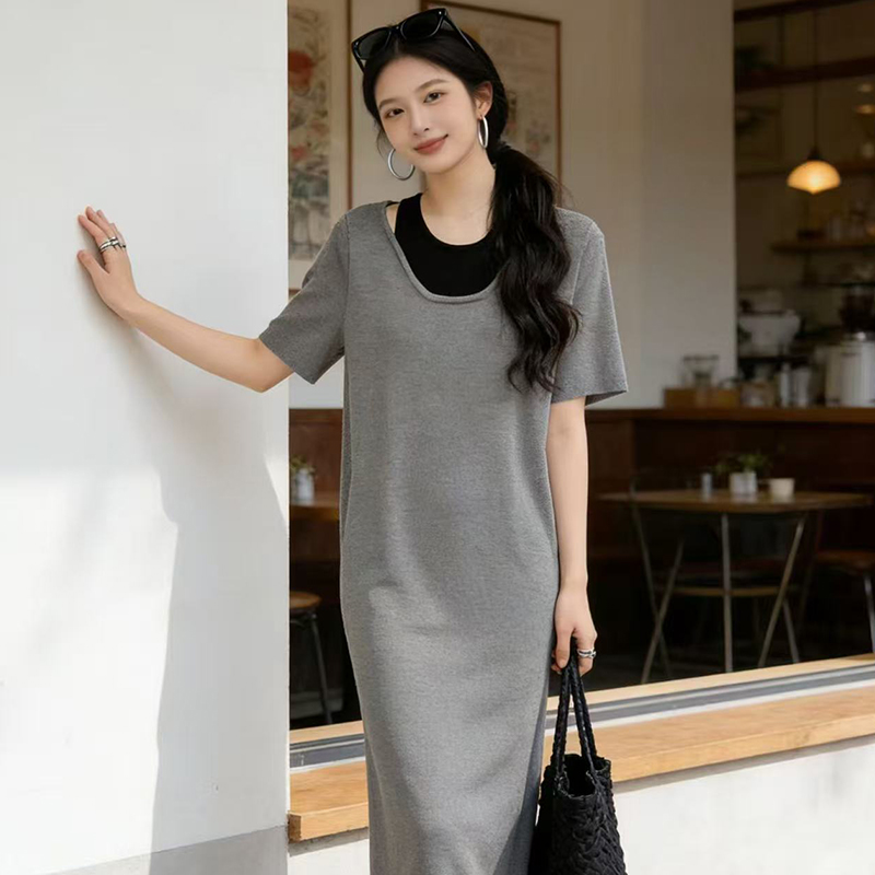 임산부 드레스 2026 여름 새로운 니트 망사 패치워크 루즈핏 페이크 레이어드 임산부 드레스