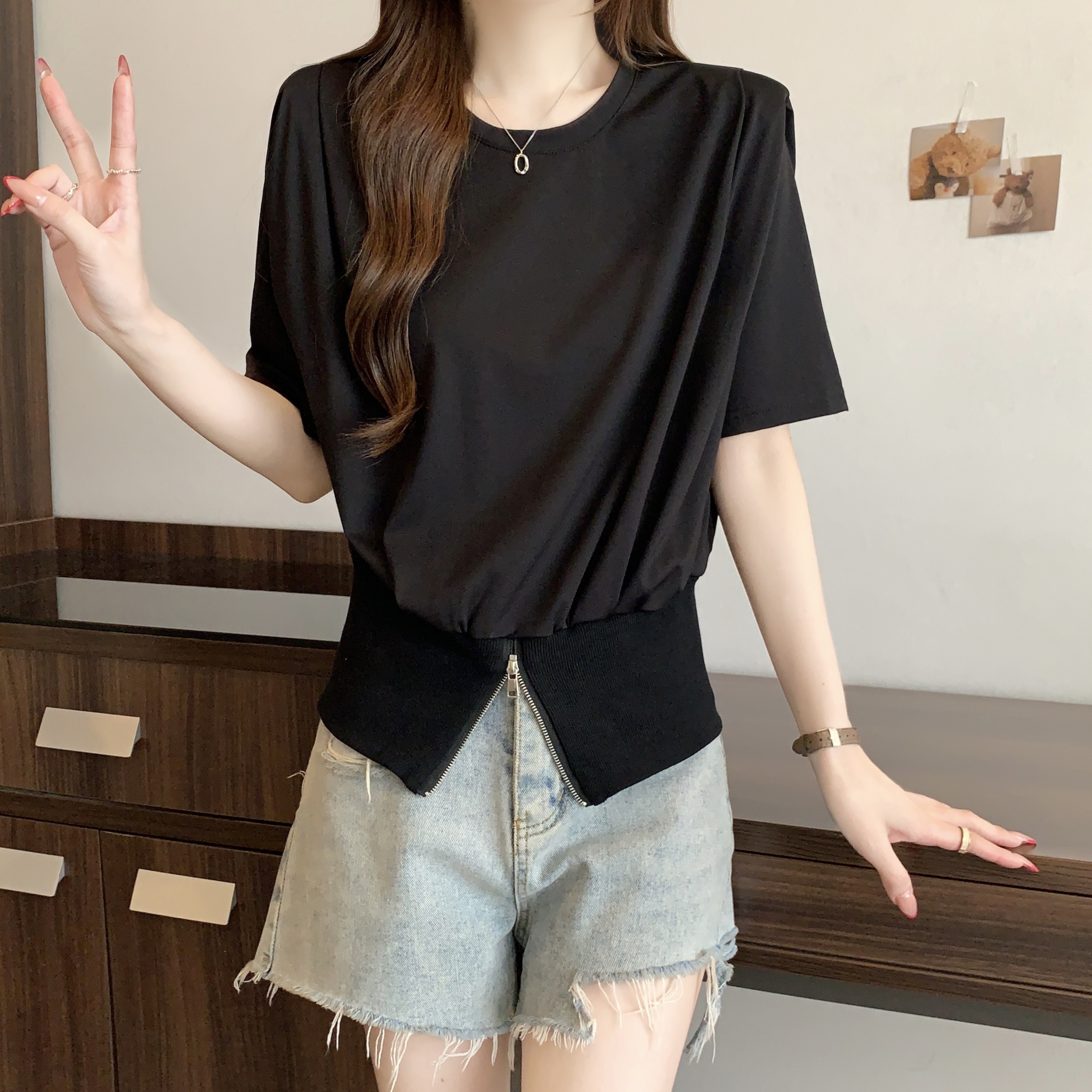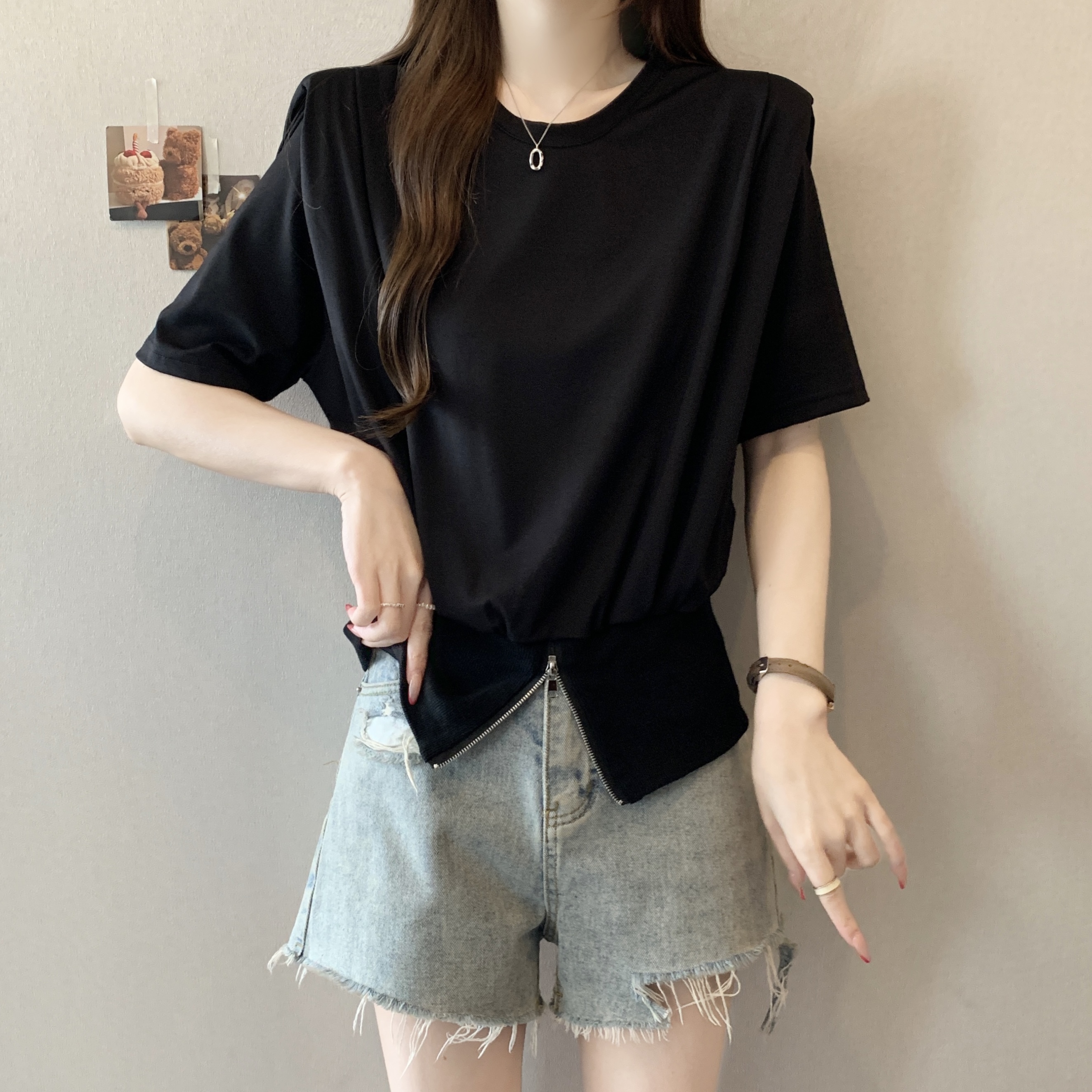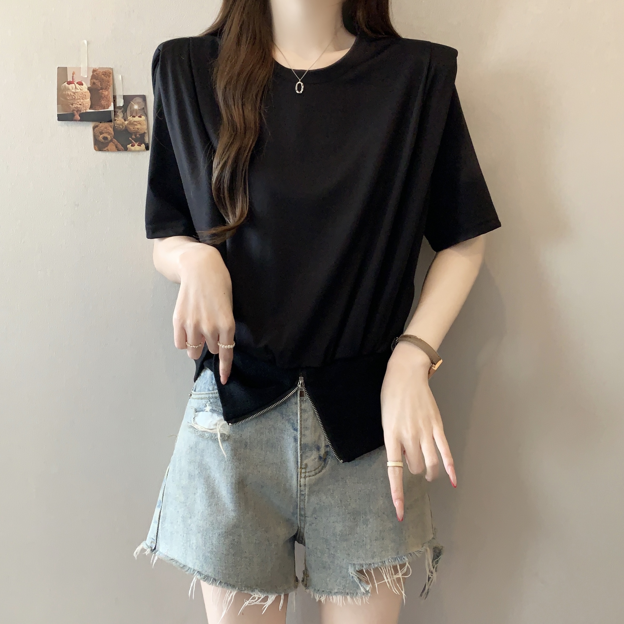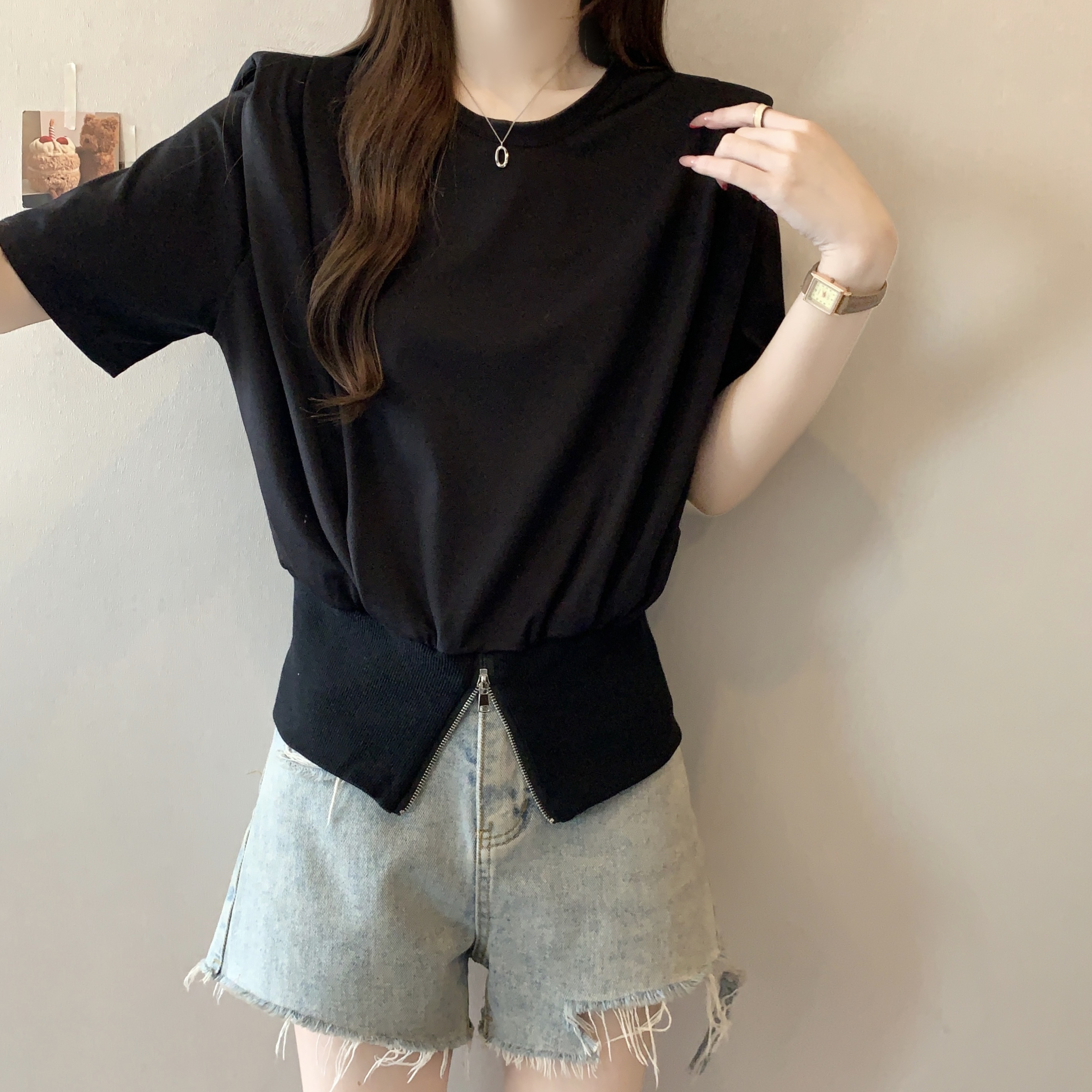 실사 2026 여름 새로운 품격 지퍼 쇼트 스타일 맨위 디자인 센스 작은 대중 외국 가스 루즈핏 반팔 티셔츠 여성