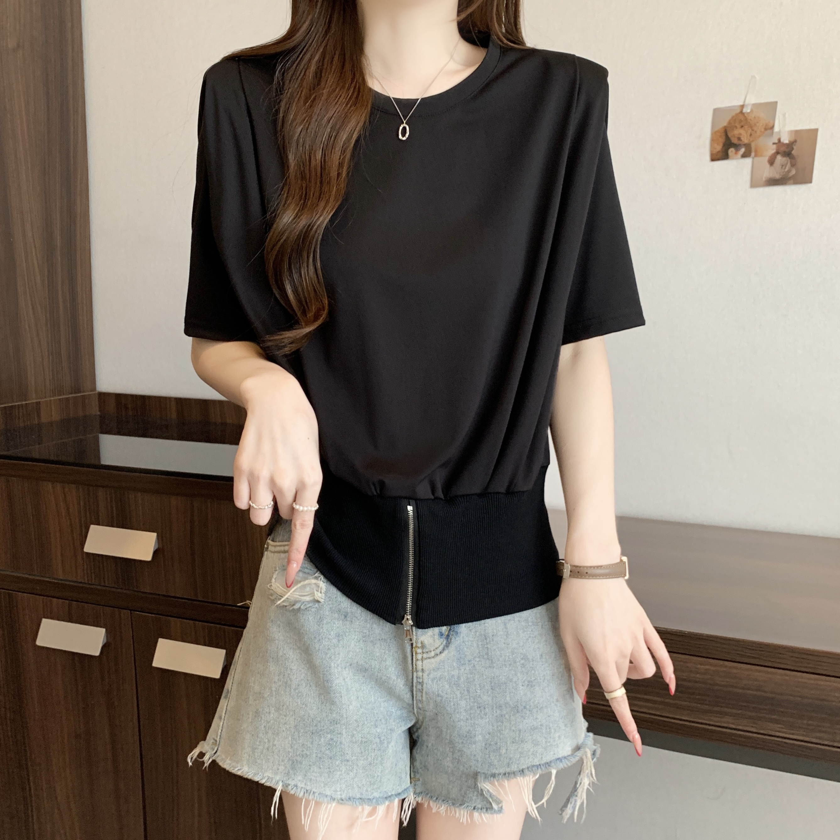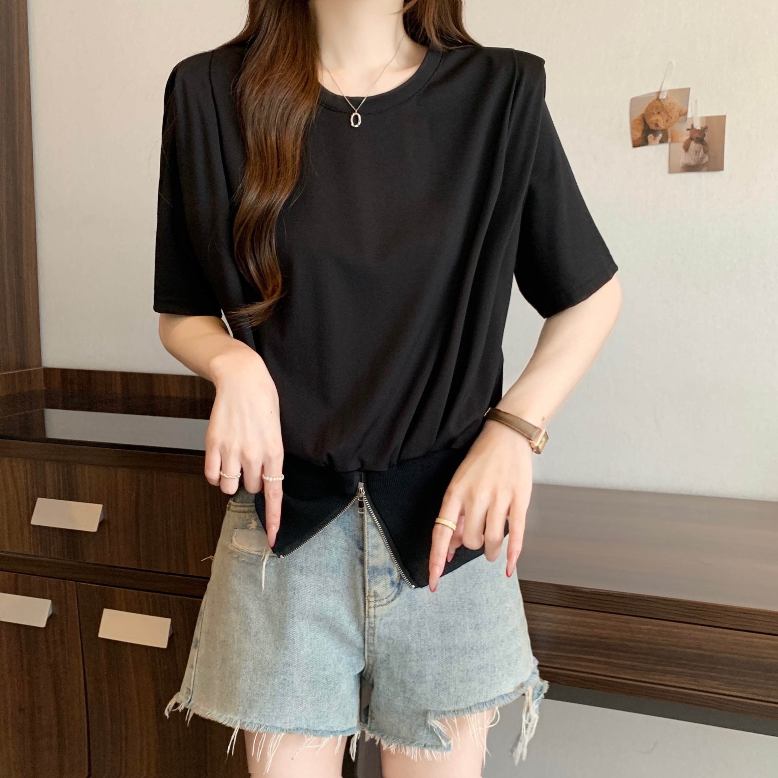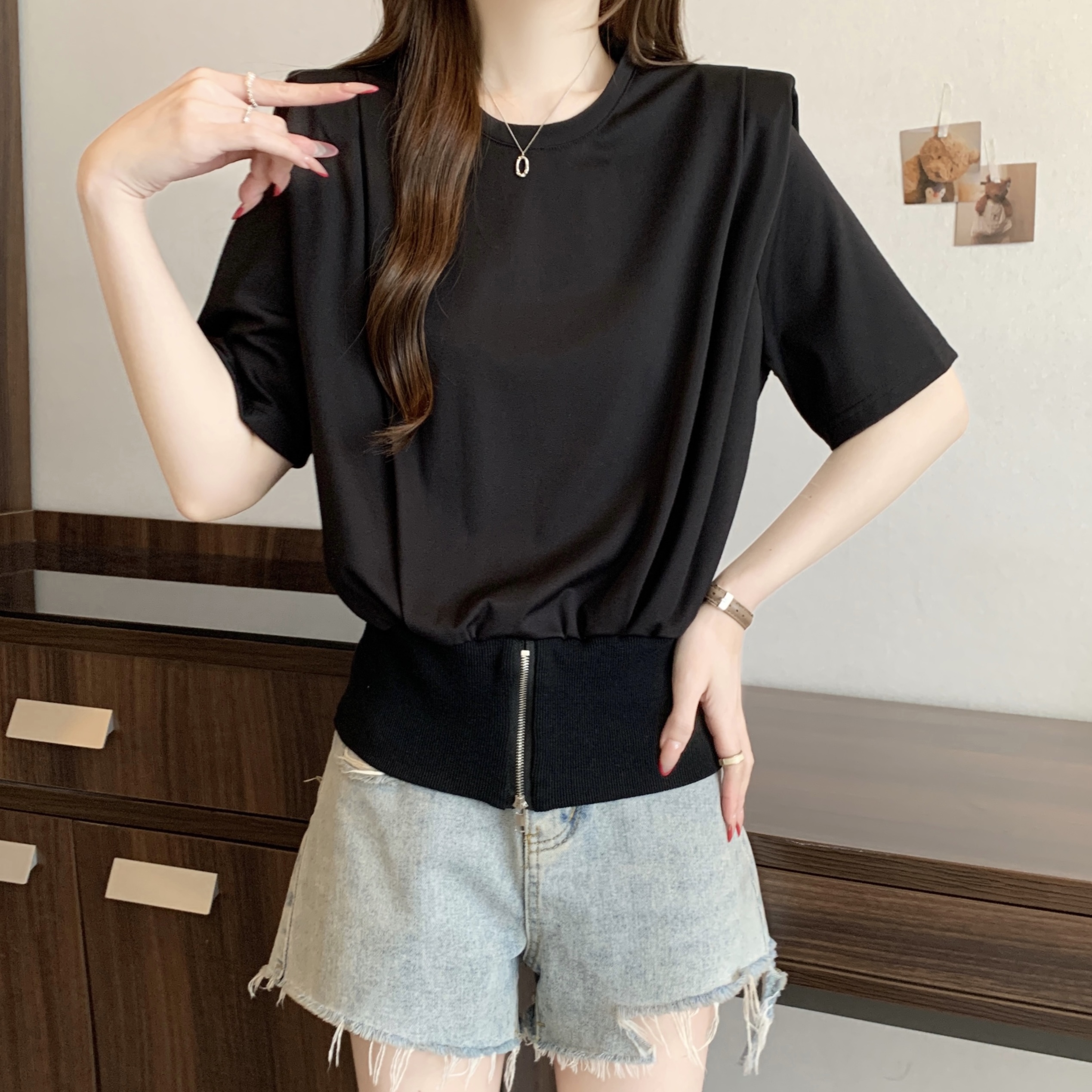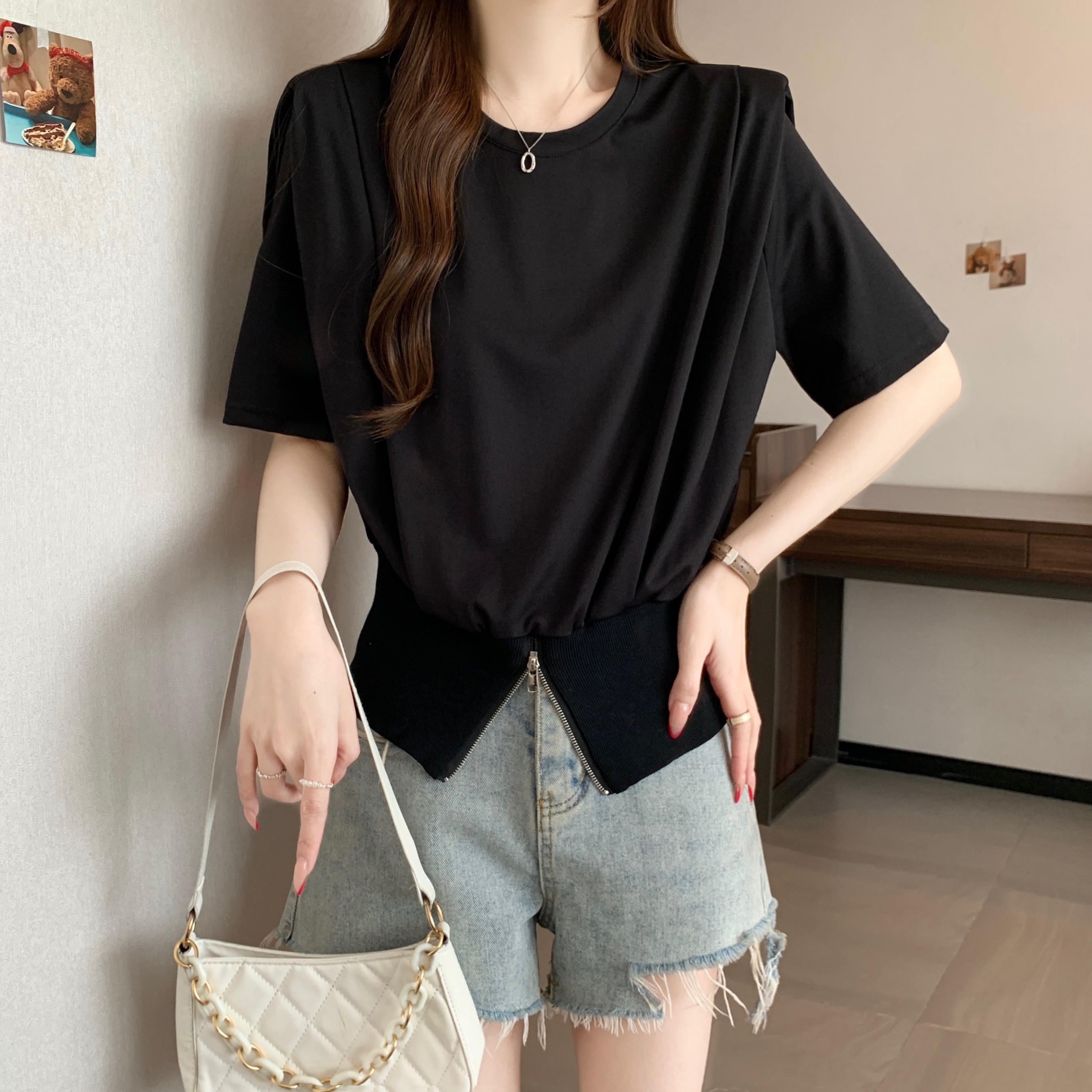 실사 2026 여름 새로운 품격 지퍼 쇼트 스타일 맨위 디자인 센스 작은 대중 외국 가스 루즈핏 반팔 티셔츠 여성