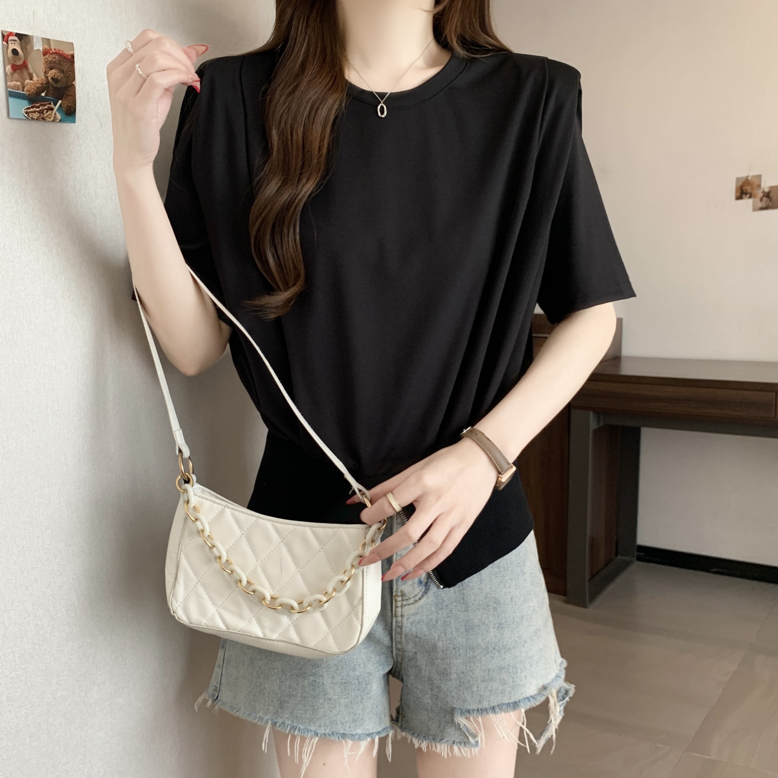 실사 여름 새로운 디자인 센스 광장 칼라 외국 가스 몸매 가꾸기 거품 소매 주름 쇄골 맨위 반팔 티셔츠 여성 ins