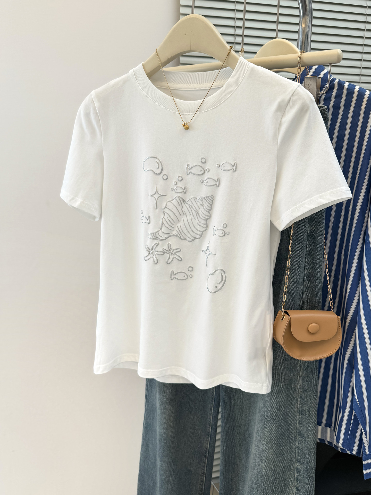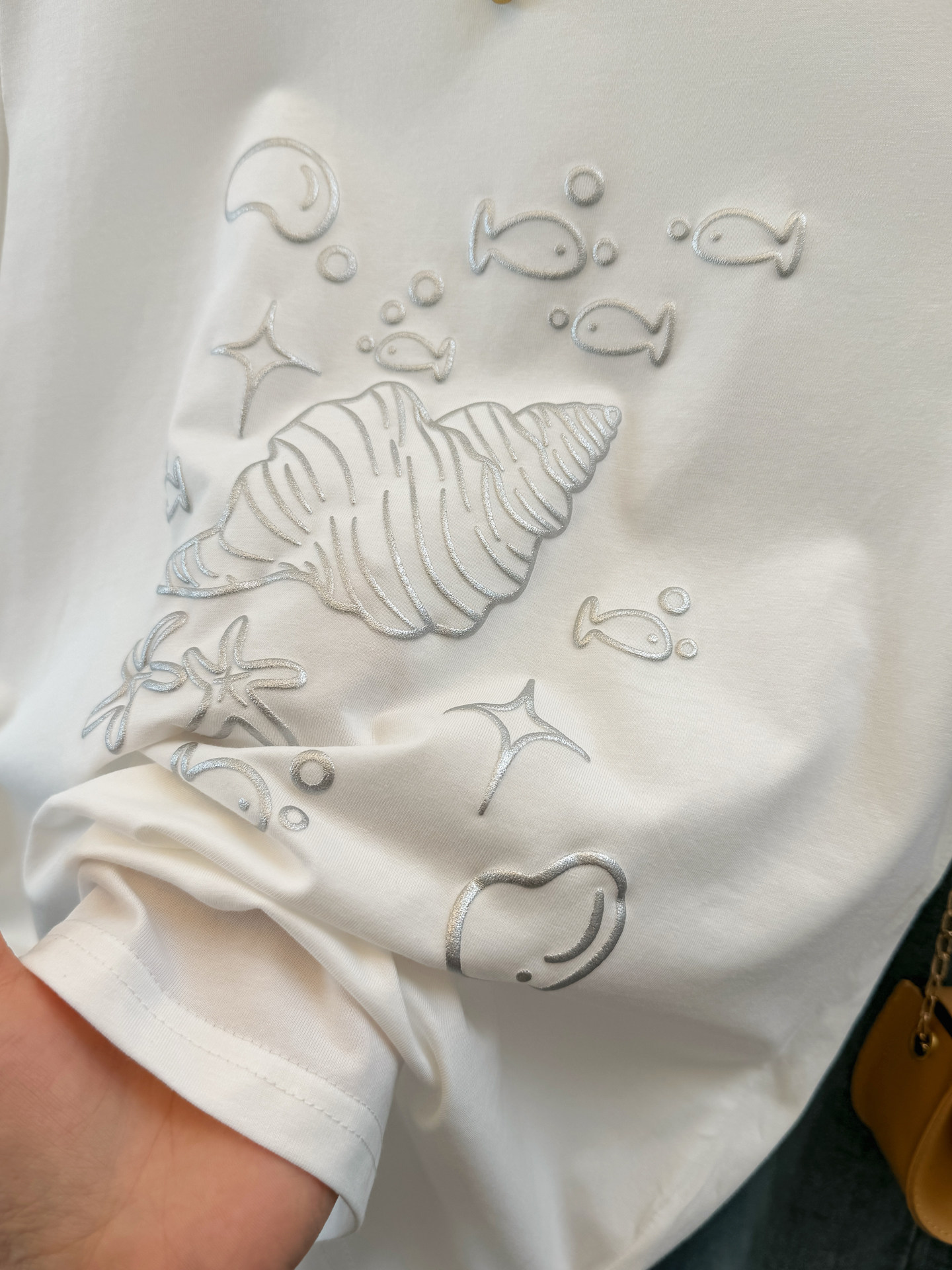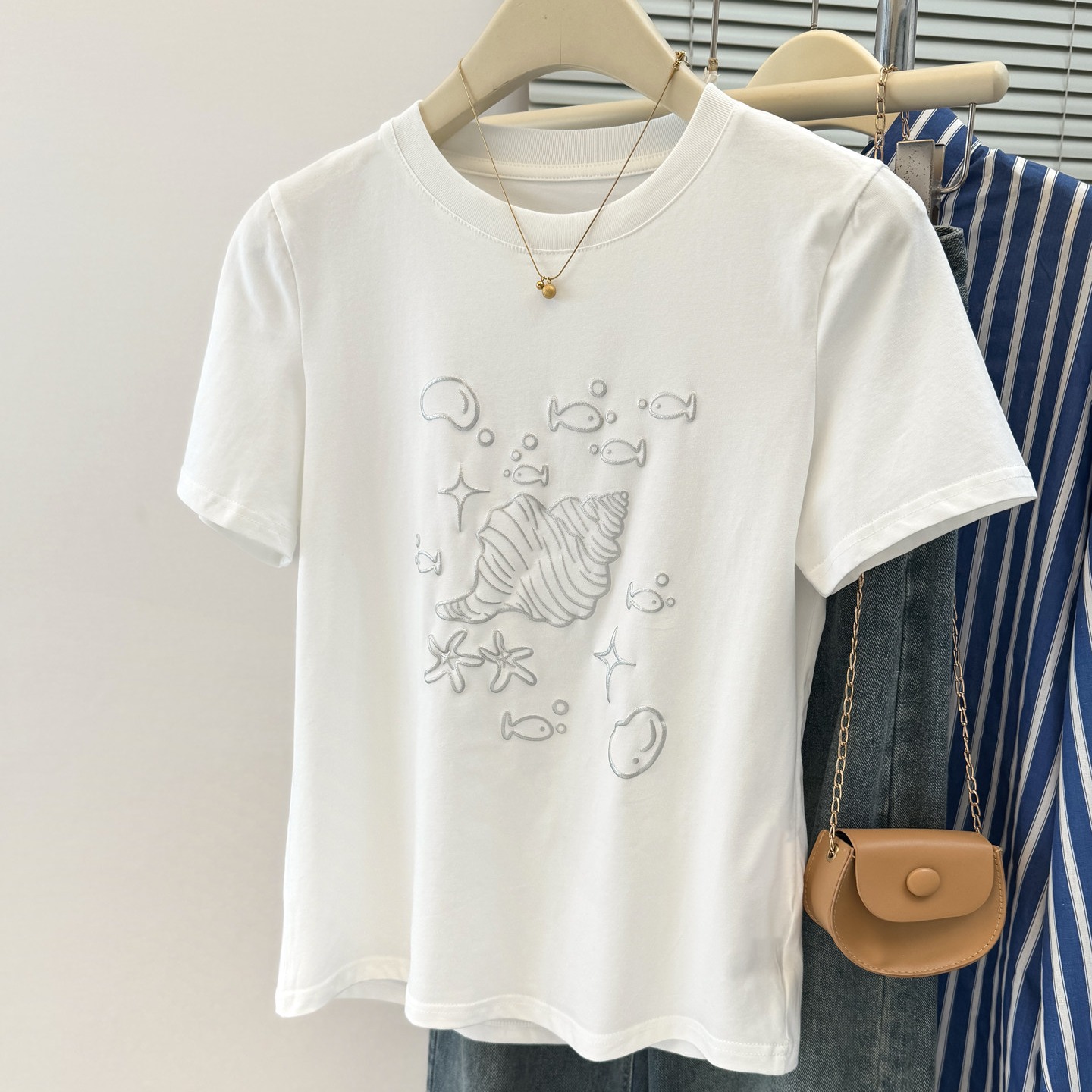 실사 한 부서 화이트 만화 조개 프린트 디자인 센스 긍정적 인 어깨 반팔 티셔츠 여성 여름 루즈핏 느긋한 맨위