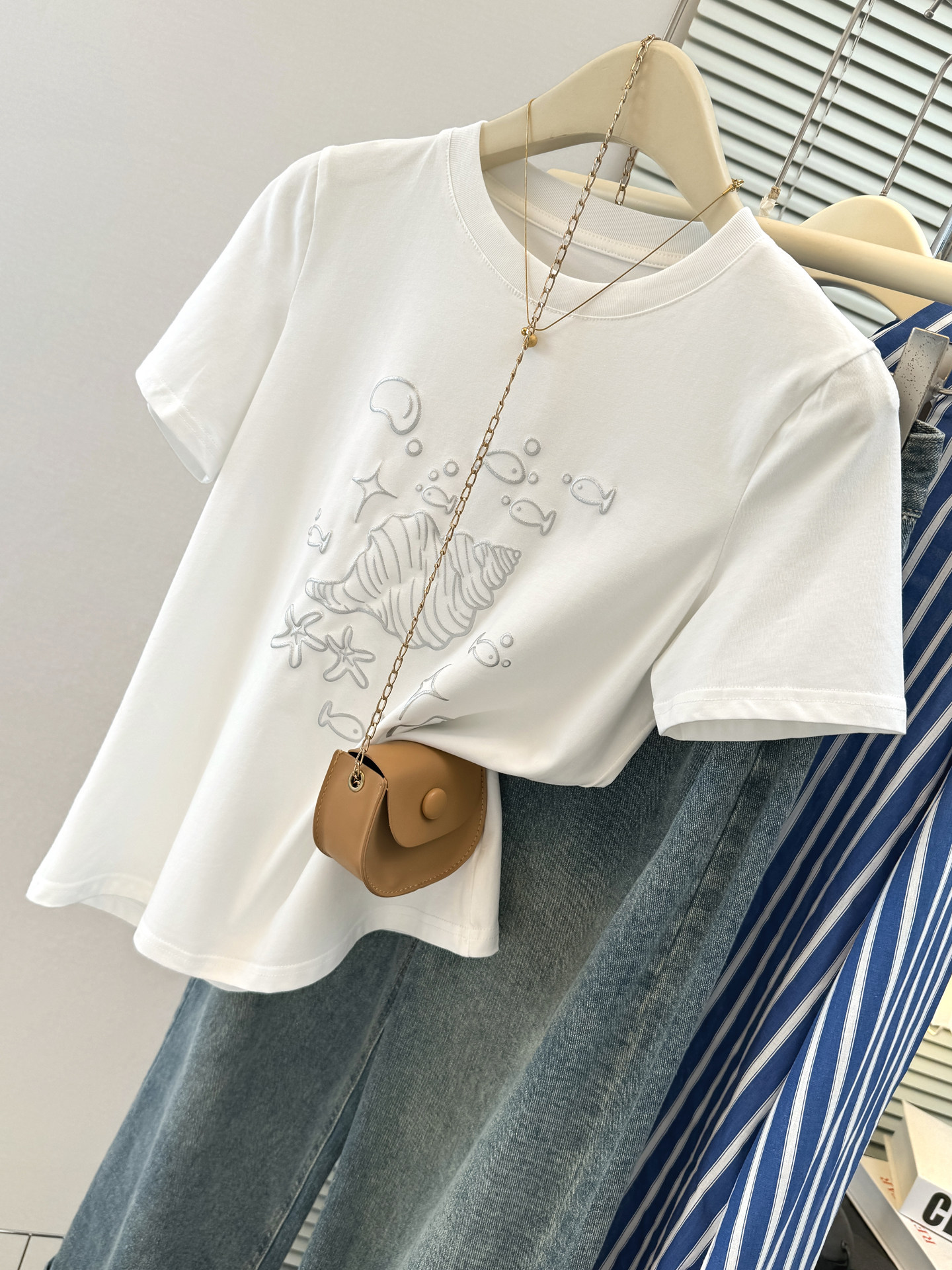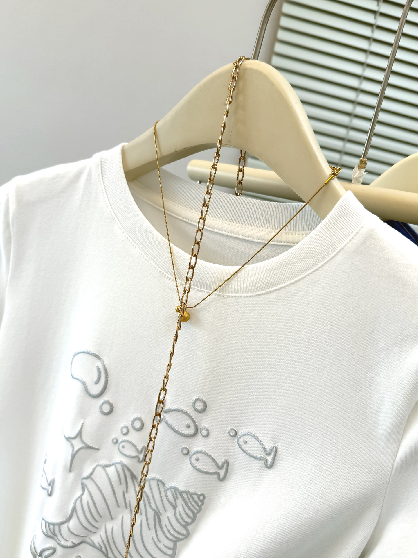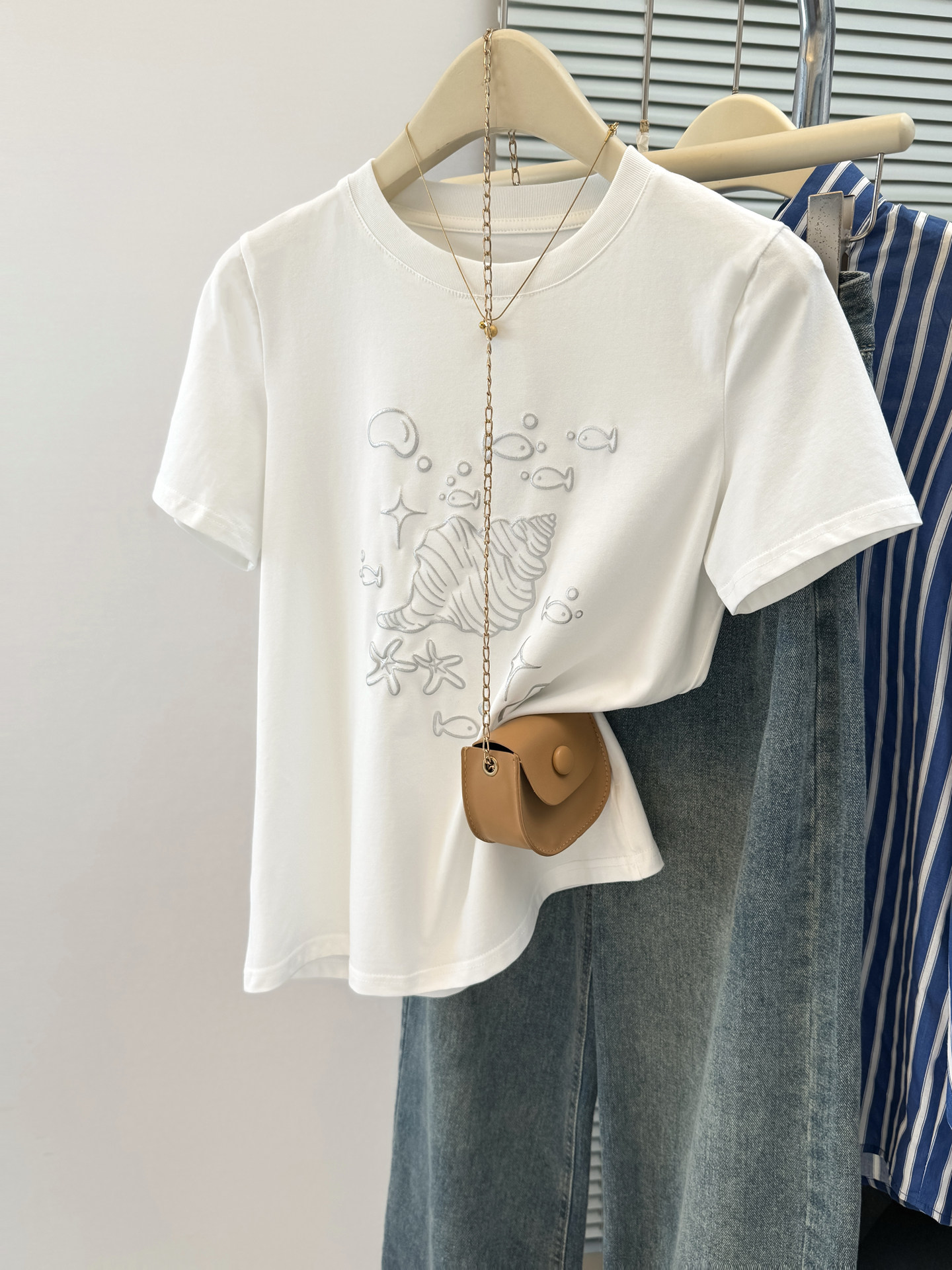 실사 한 부서 화이트 만화 조개 프린트 디자인 센스 긍정적 인 어깨 반팔 티셔츠 여성 여름 루즈핏 느긋한 맨위