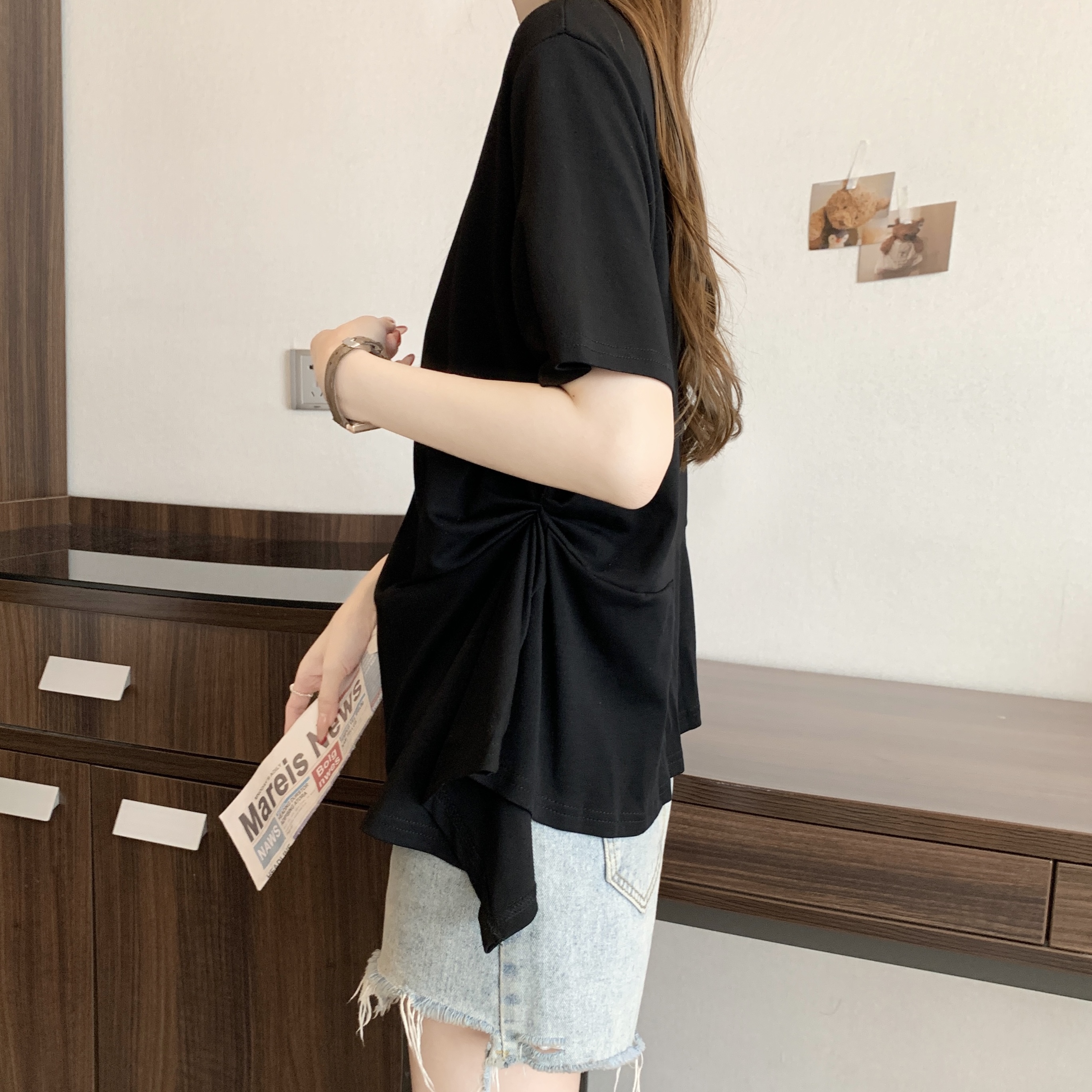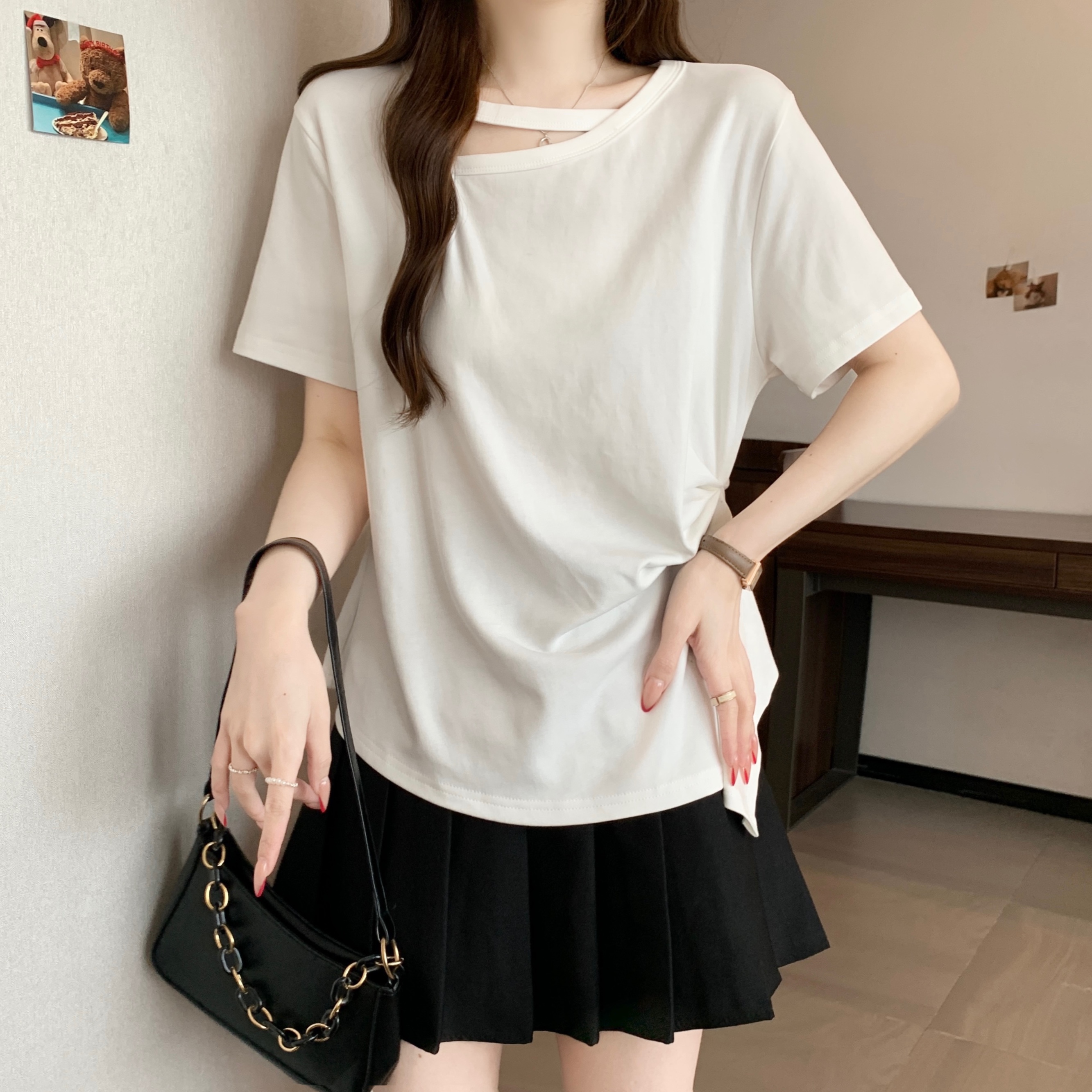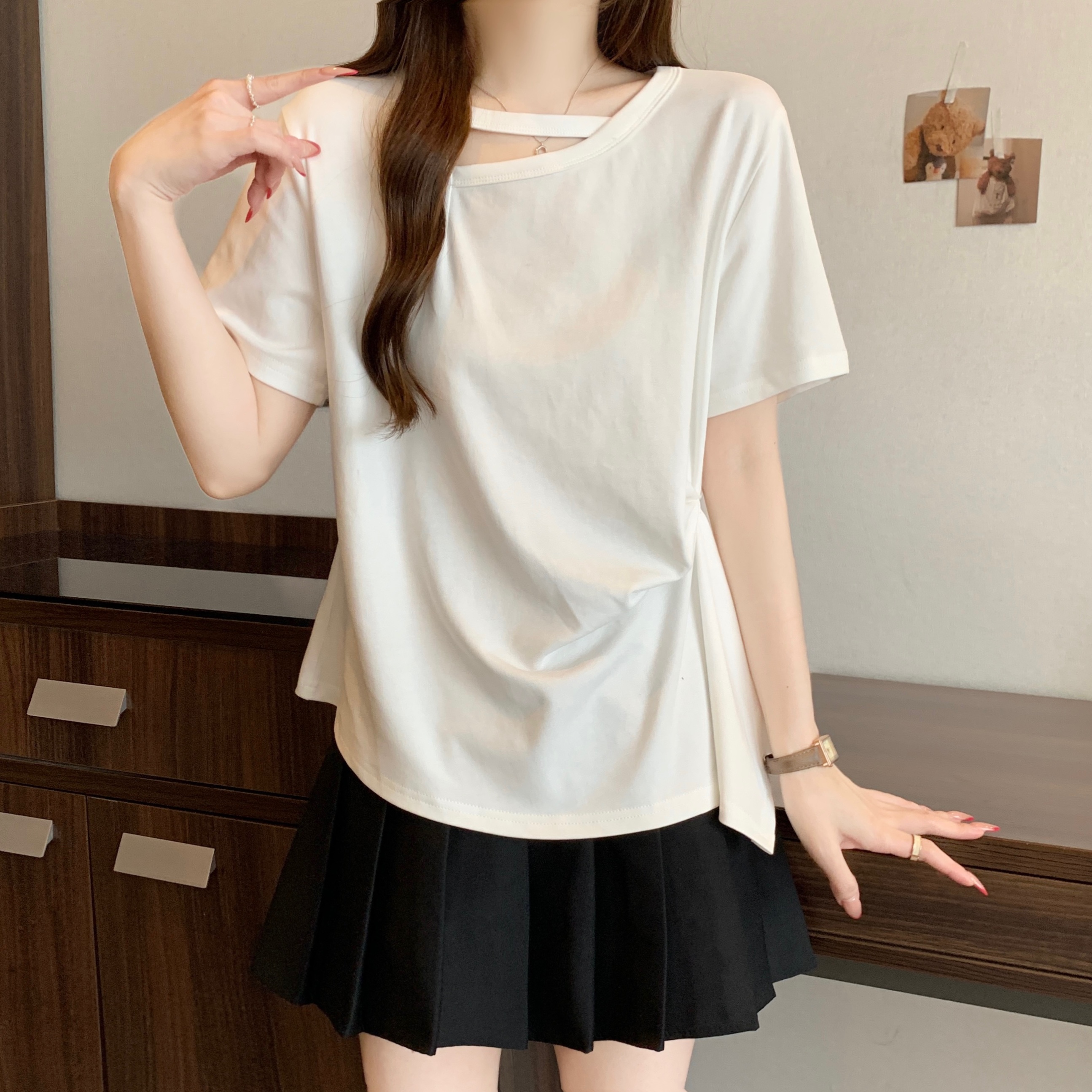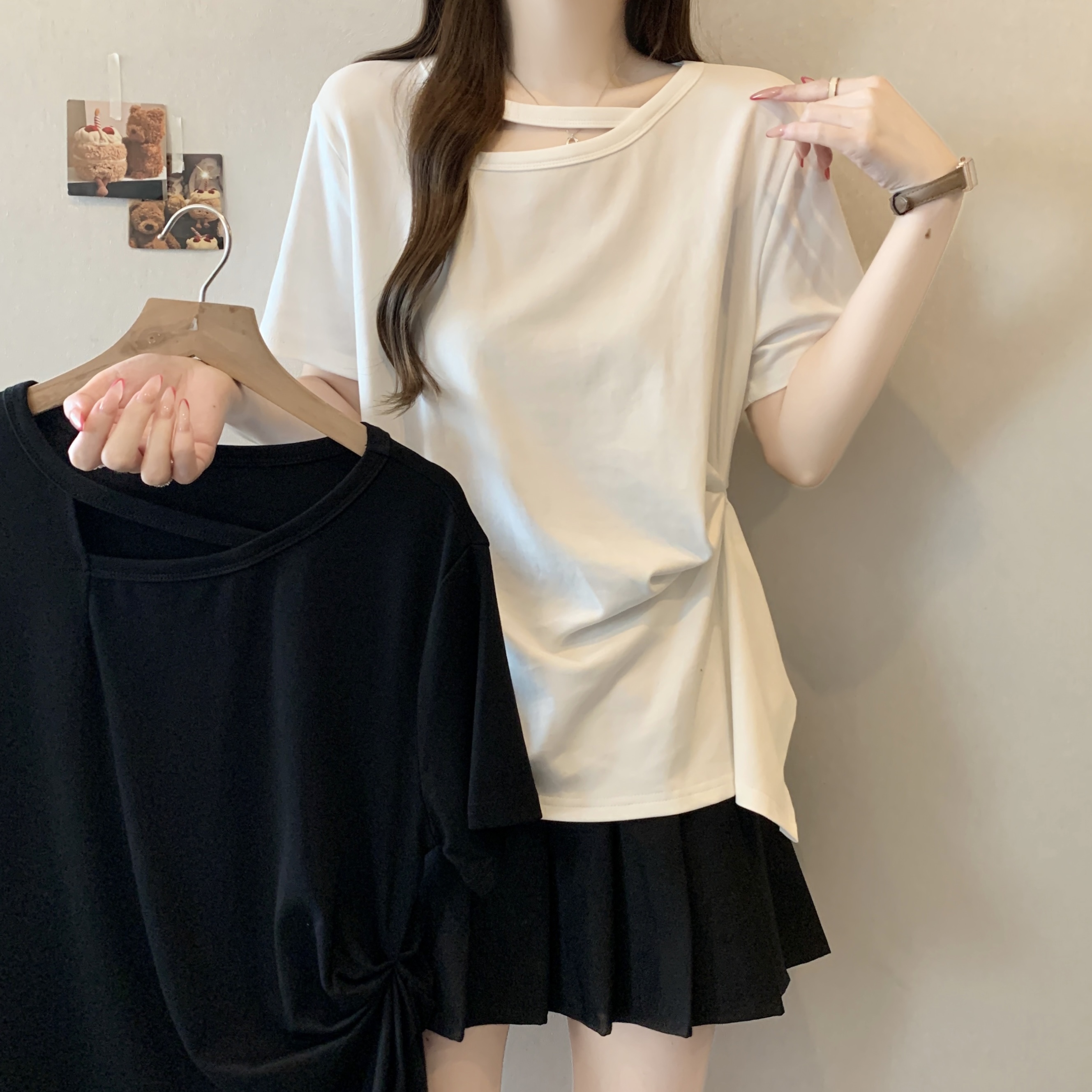 실사 빅 사이즈 불규칙 홀로우 아웃 디자인 센스 주름 티셔츠 지방 mm 슬림해 보이는 긍정적 인 어깨 반팔 허리 수축 맨위 여성 여름