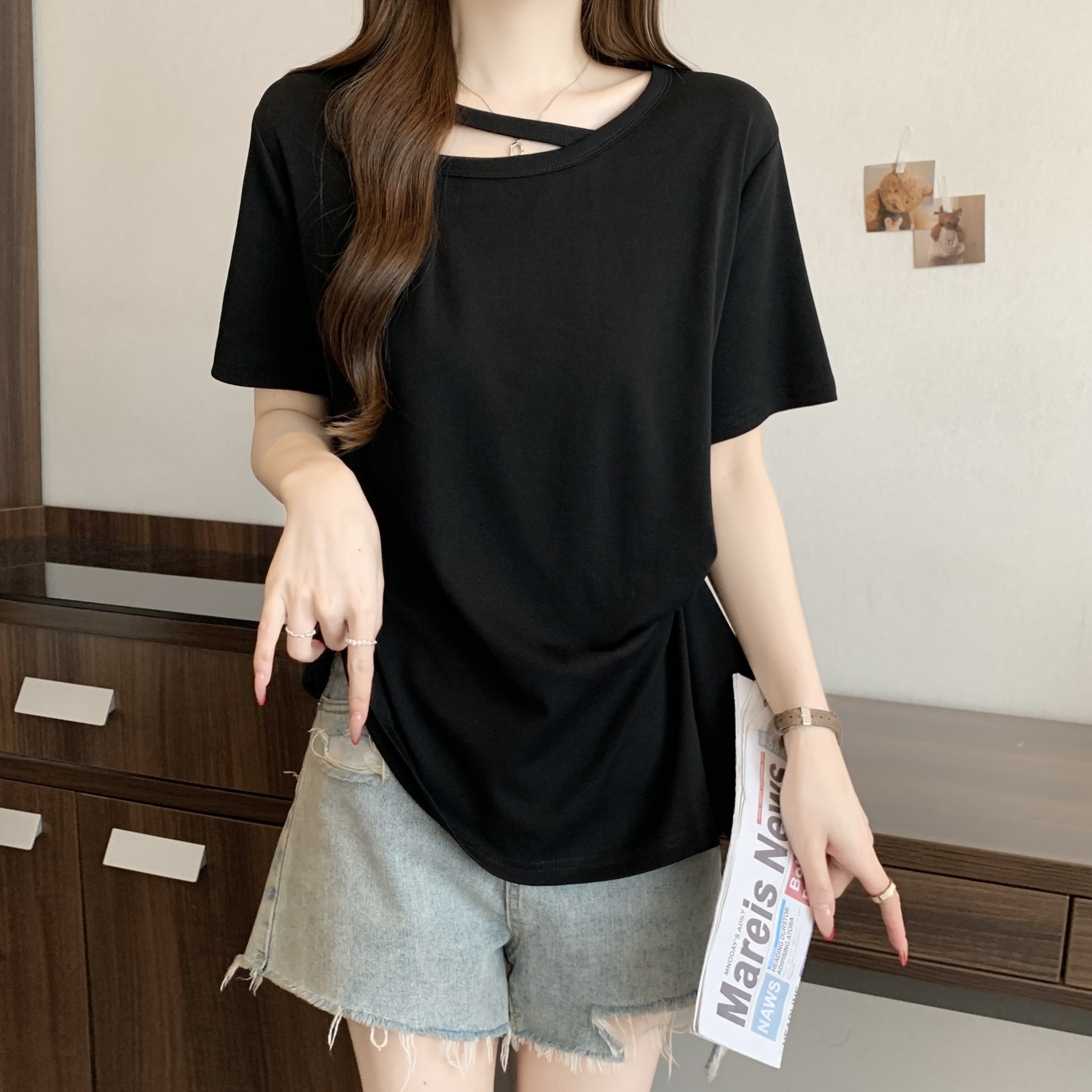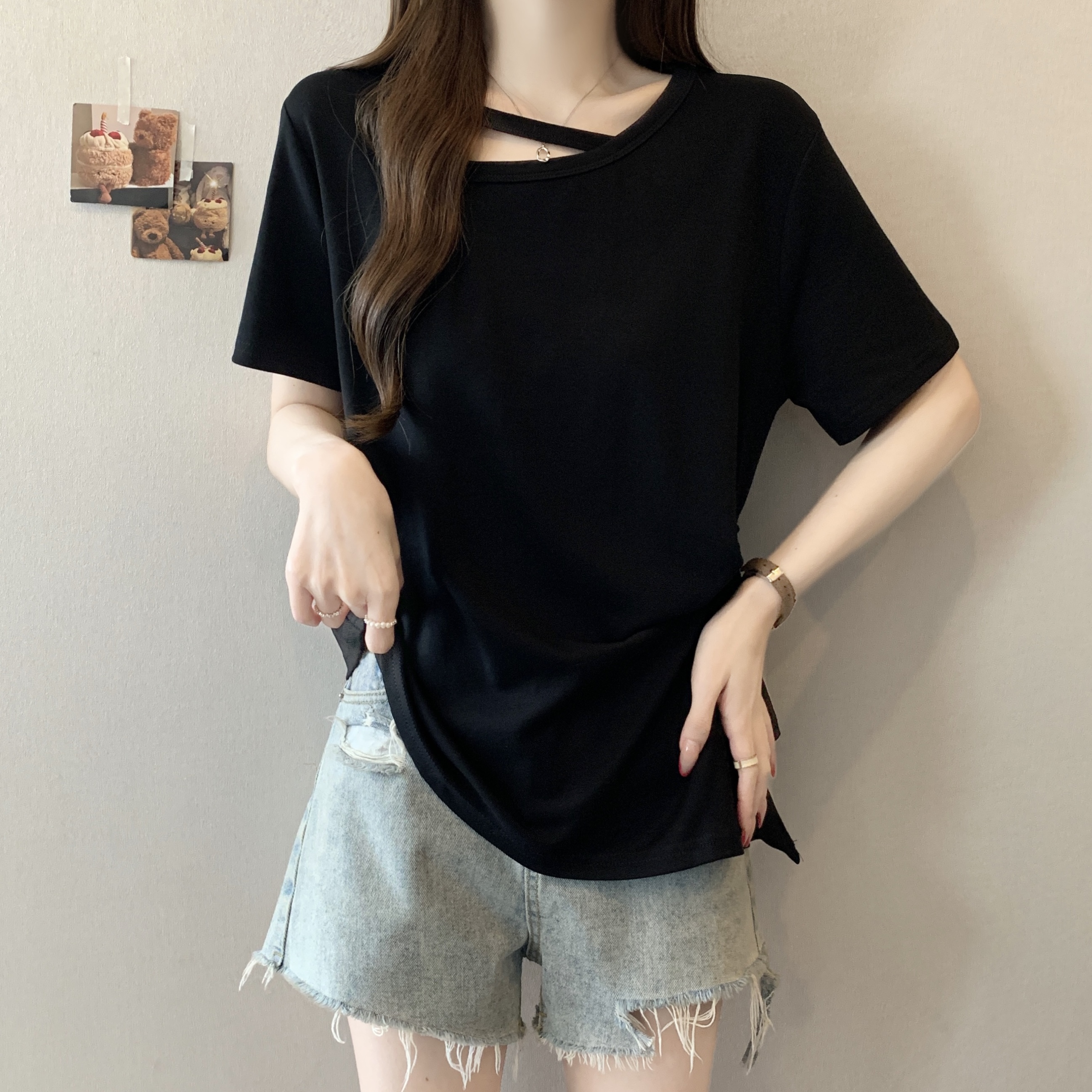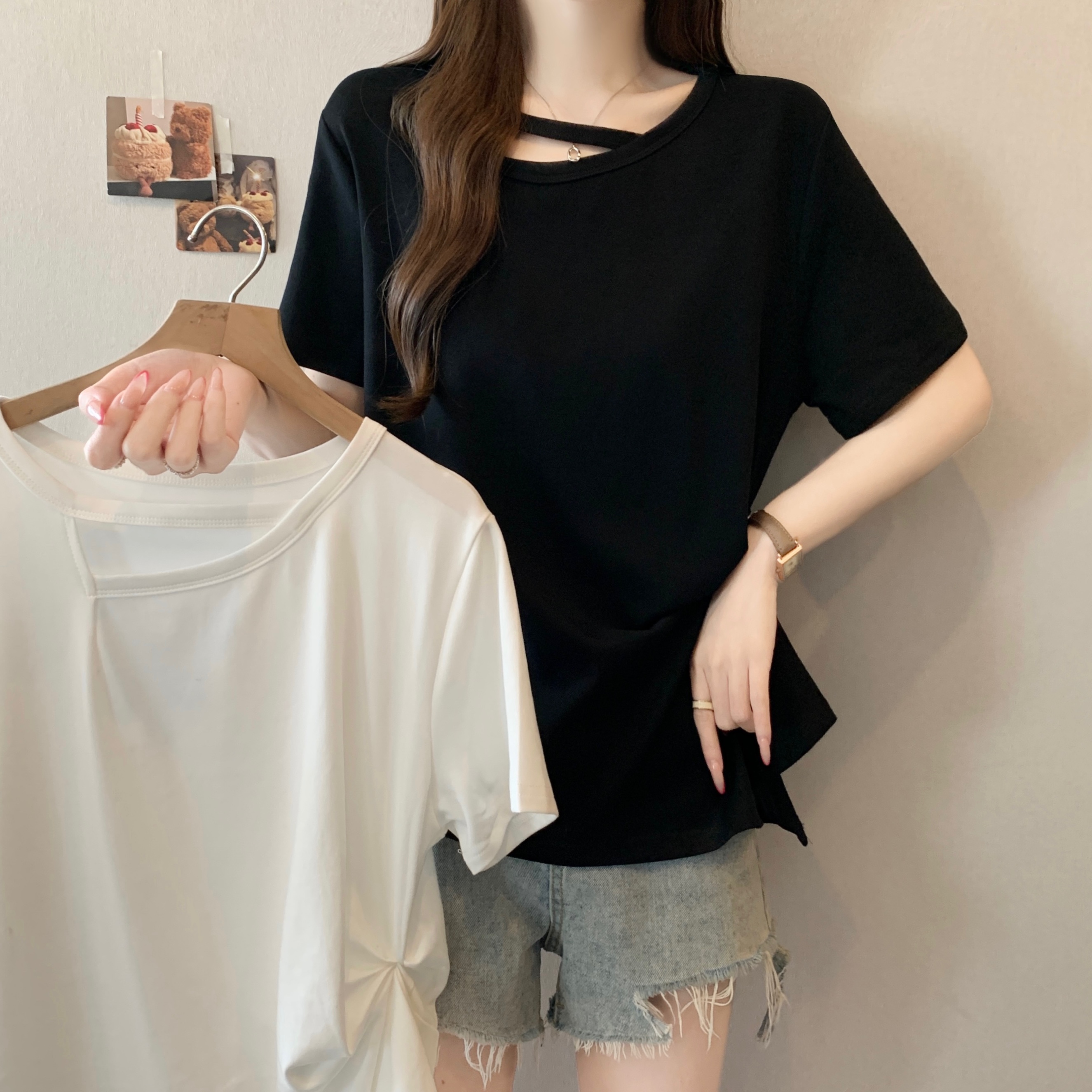 빅 사이즈 불규칙 비스듬한 칼라 반팔 티셔츠 여성 여름 새로운 지방 m 루즈핏 슬림해 보이는 다용도 외국 가스 디자인 센스 맨위