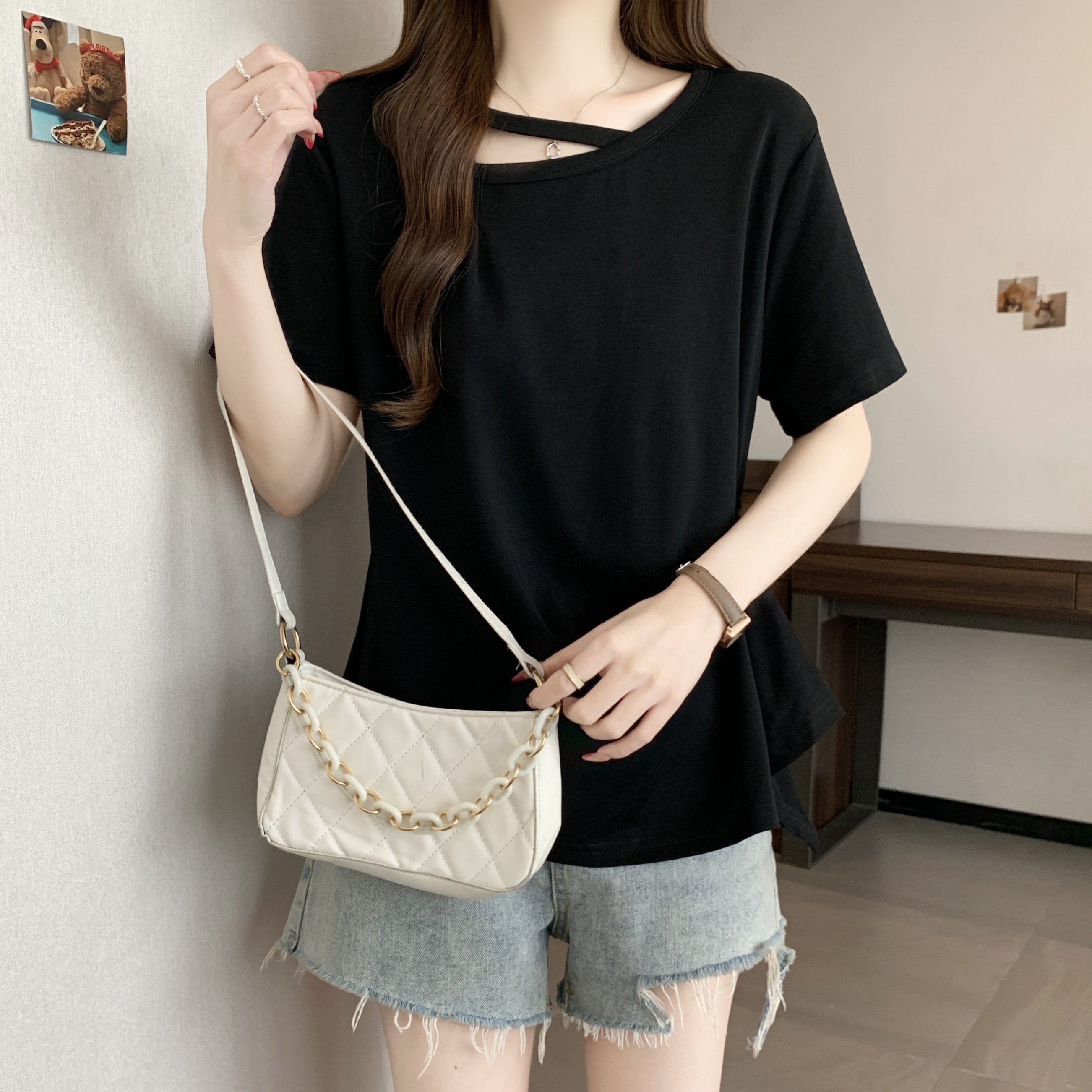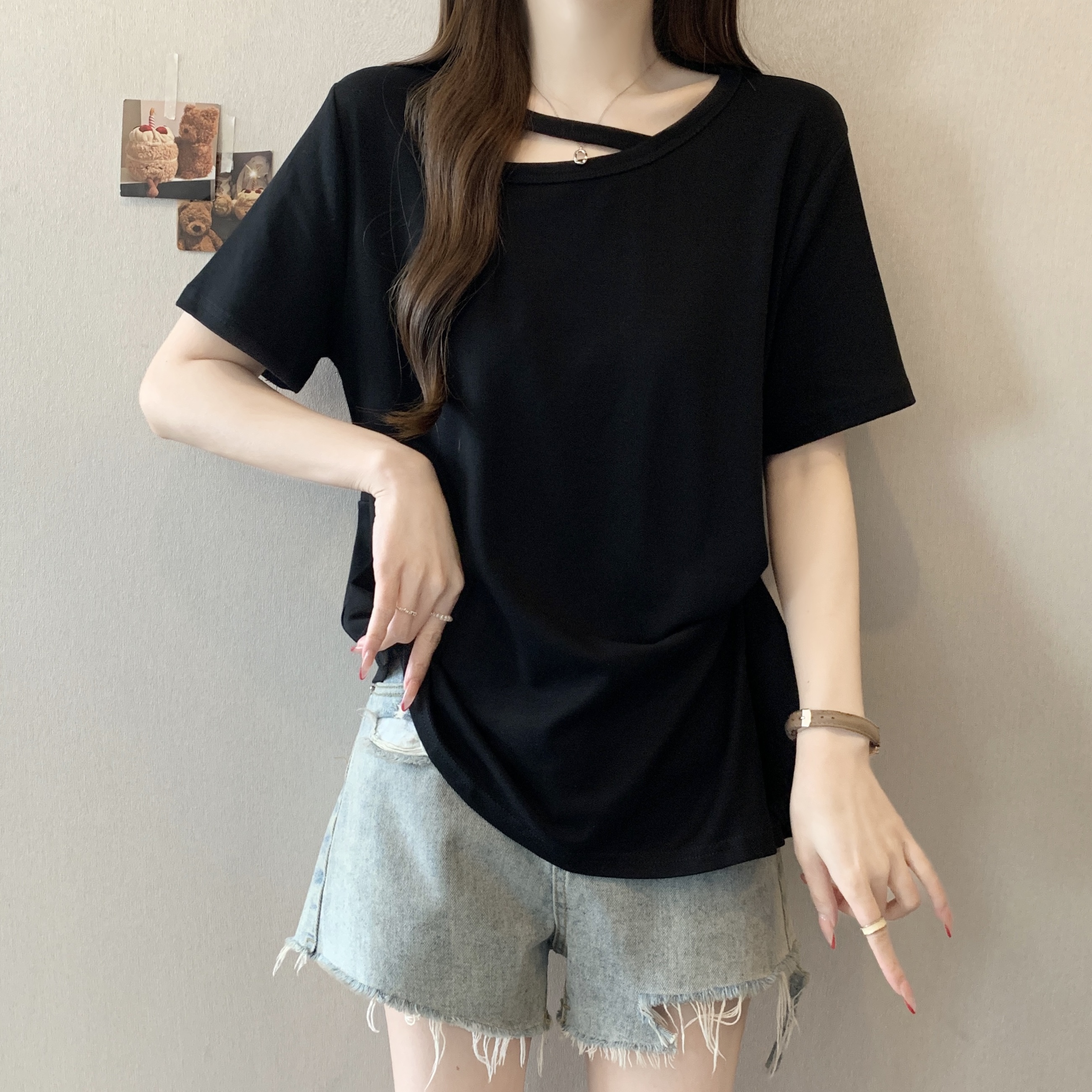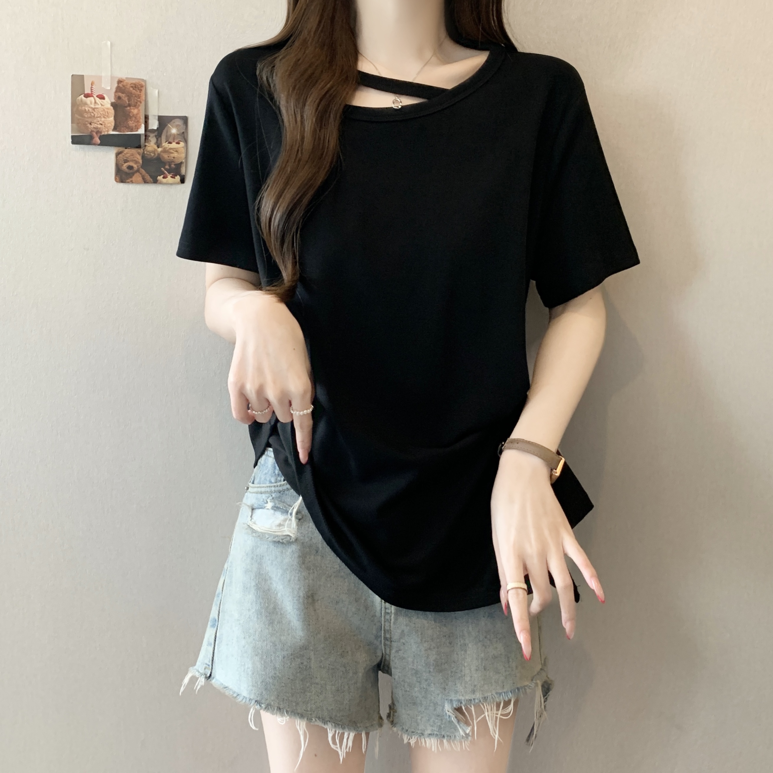빅 사이즈 불규칙 비스듬한 칼라 반팔 티셔츠 여성 여름 새로운 지방 m 루즈핏 슬림해 보이는 다용도 외국 가스 디자인 센스 맨위