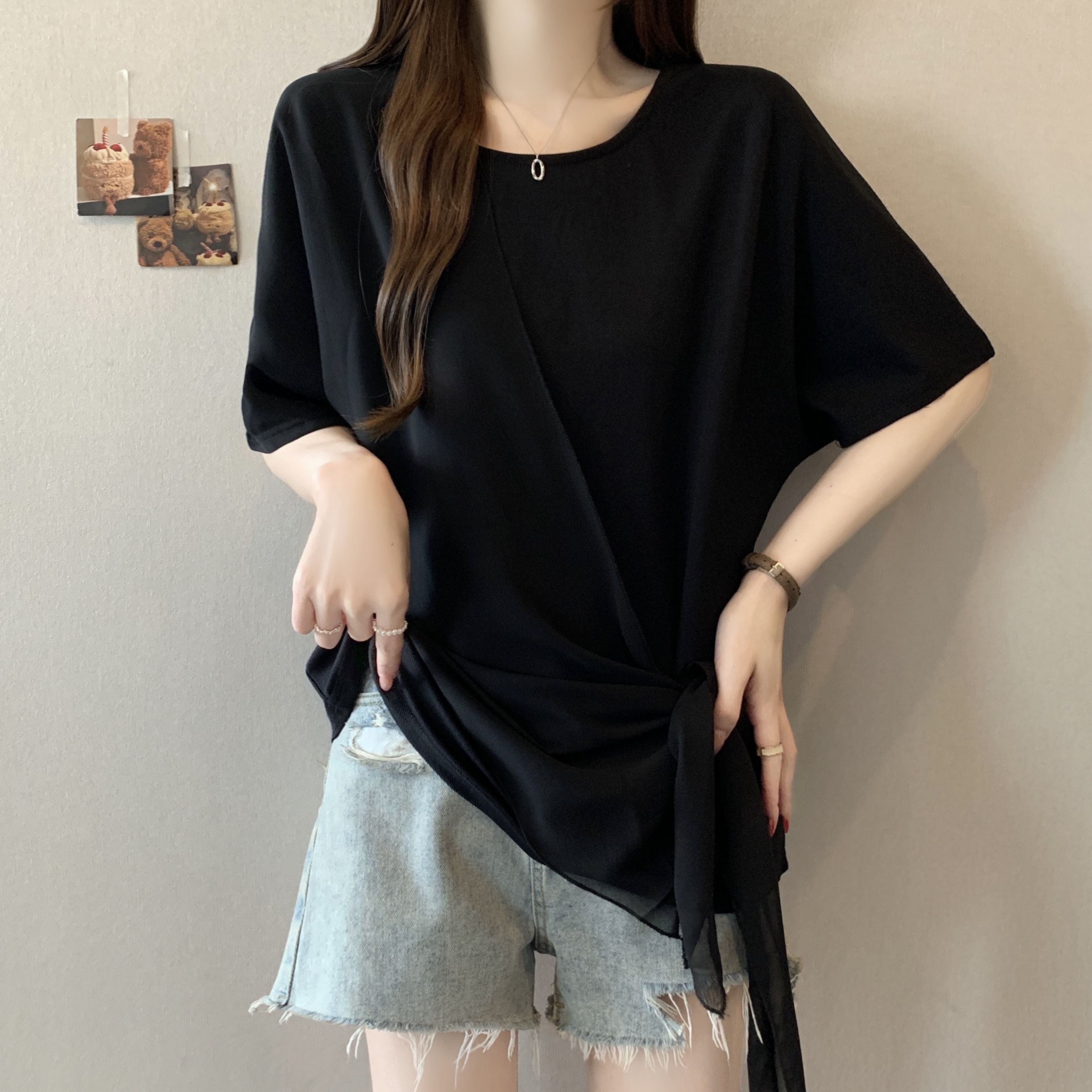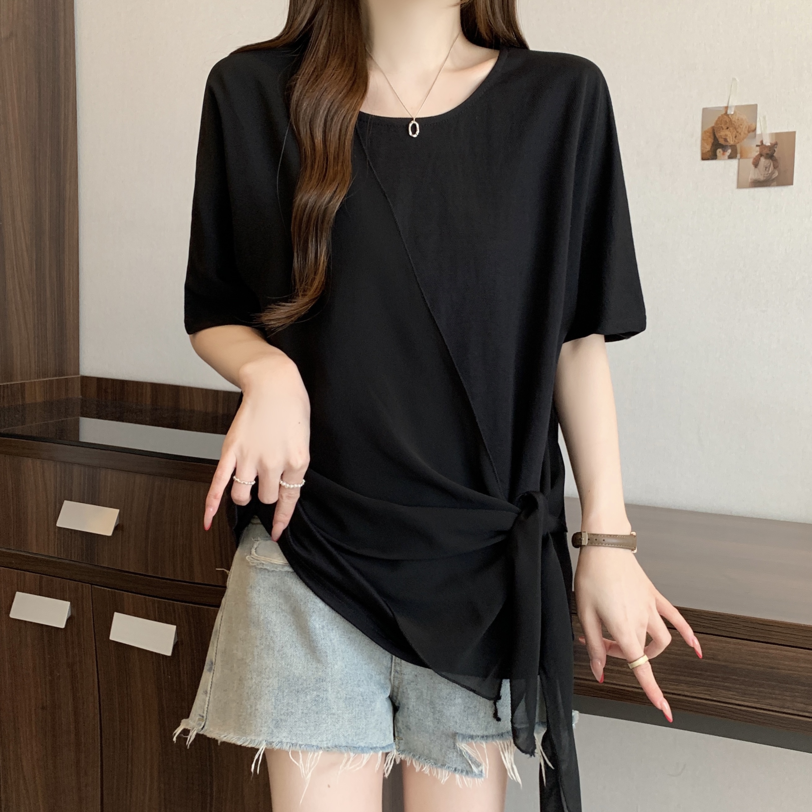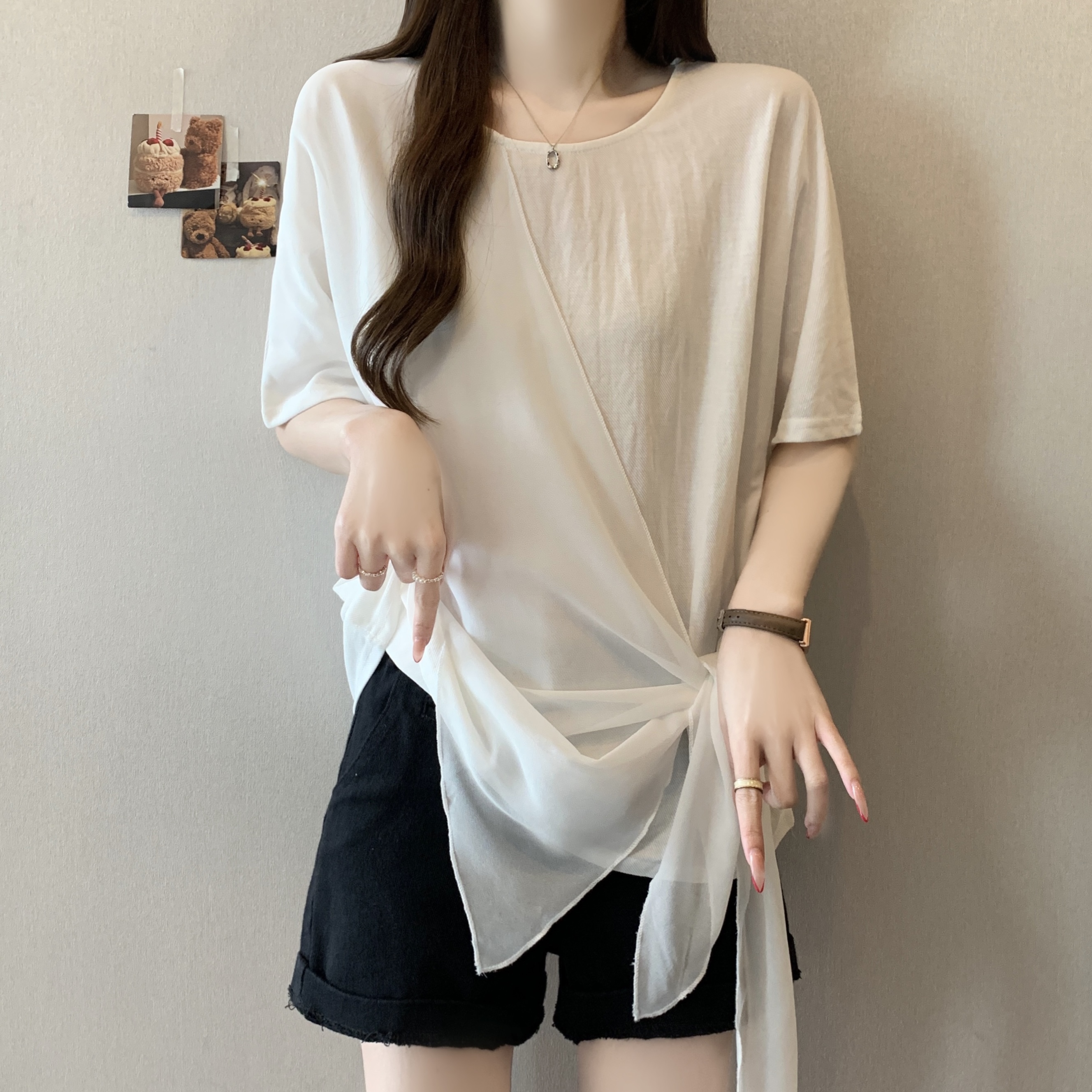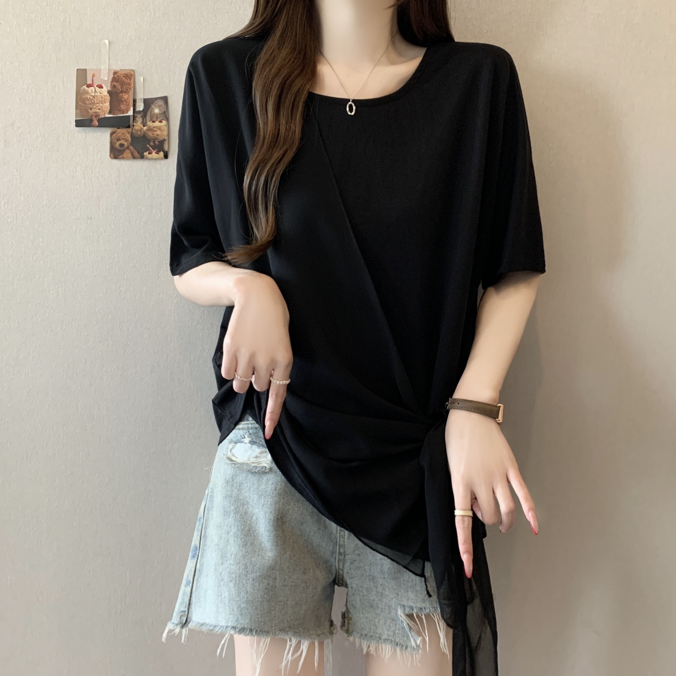 빅 사이즈 불규칙 패치워크 페이크 레이어드 반팔 티셔츠 여성 여름 지방 mm 슬림해 보이는 루즈핏 표지 배 라운드 넥 맨위