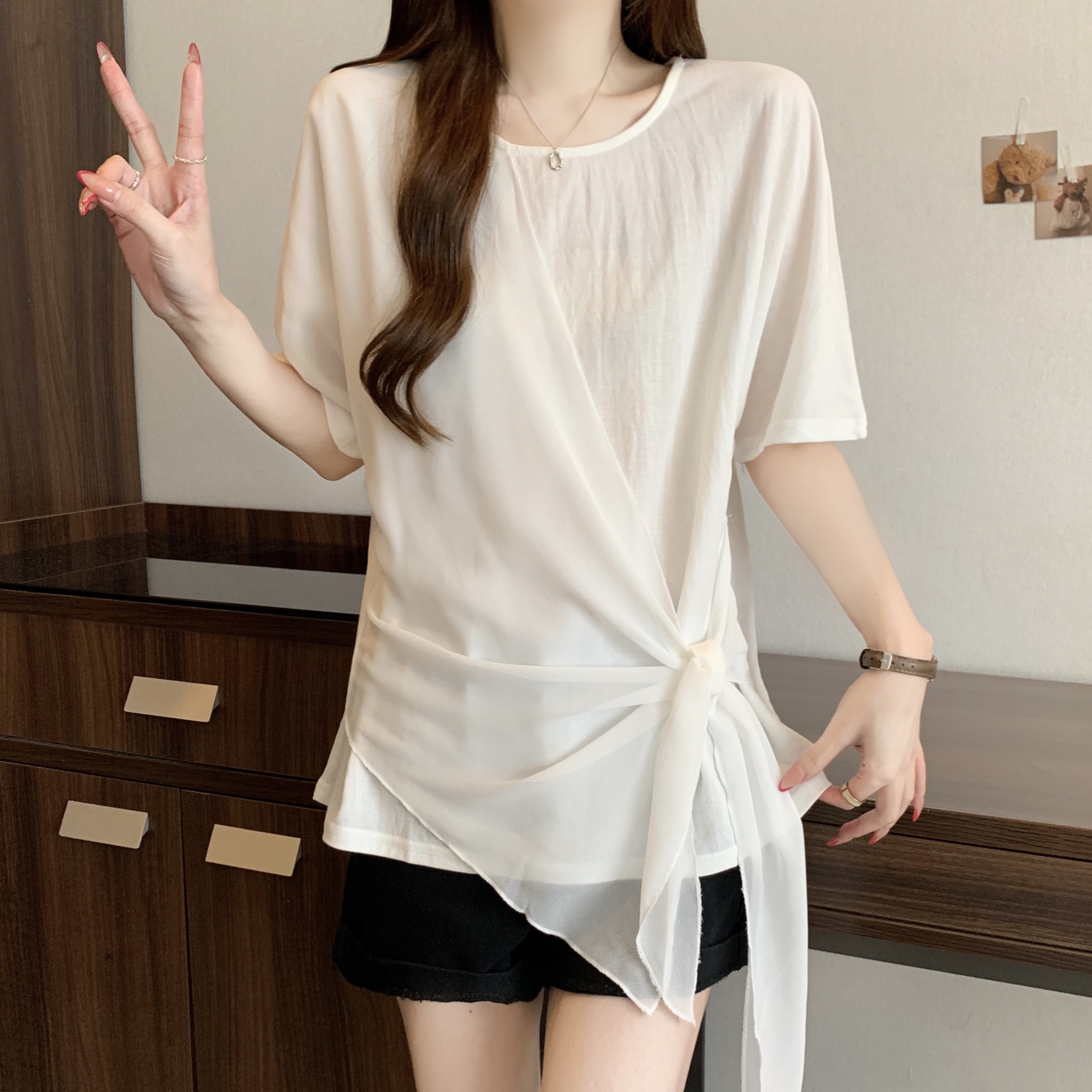 실사 빅 사이즈 불규칙 홀로우 아웃 디자인 센스 주름 티셔츠 지방 mm 슬림해 보이는 긍정적 인 어깨 반팔 허리 수축 맨위 여성 여름