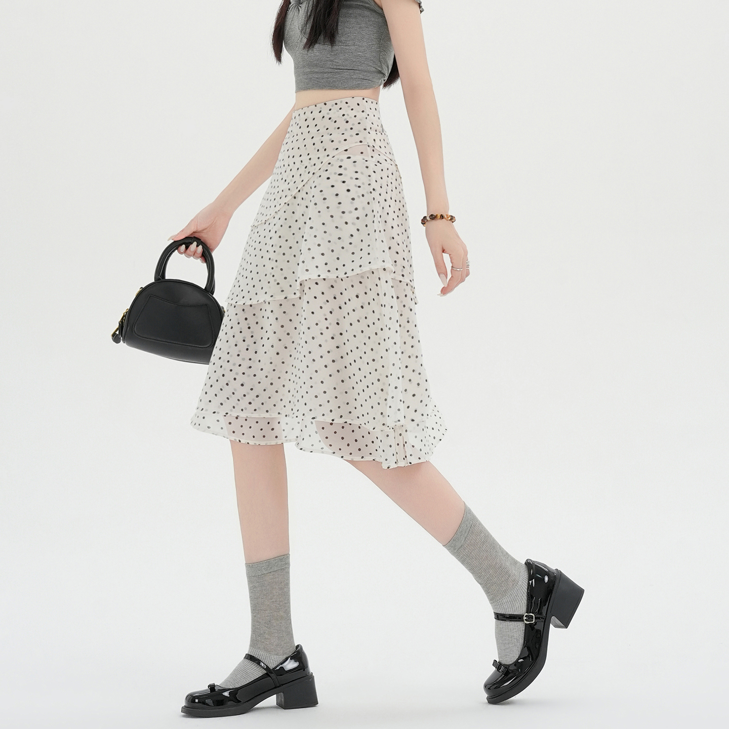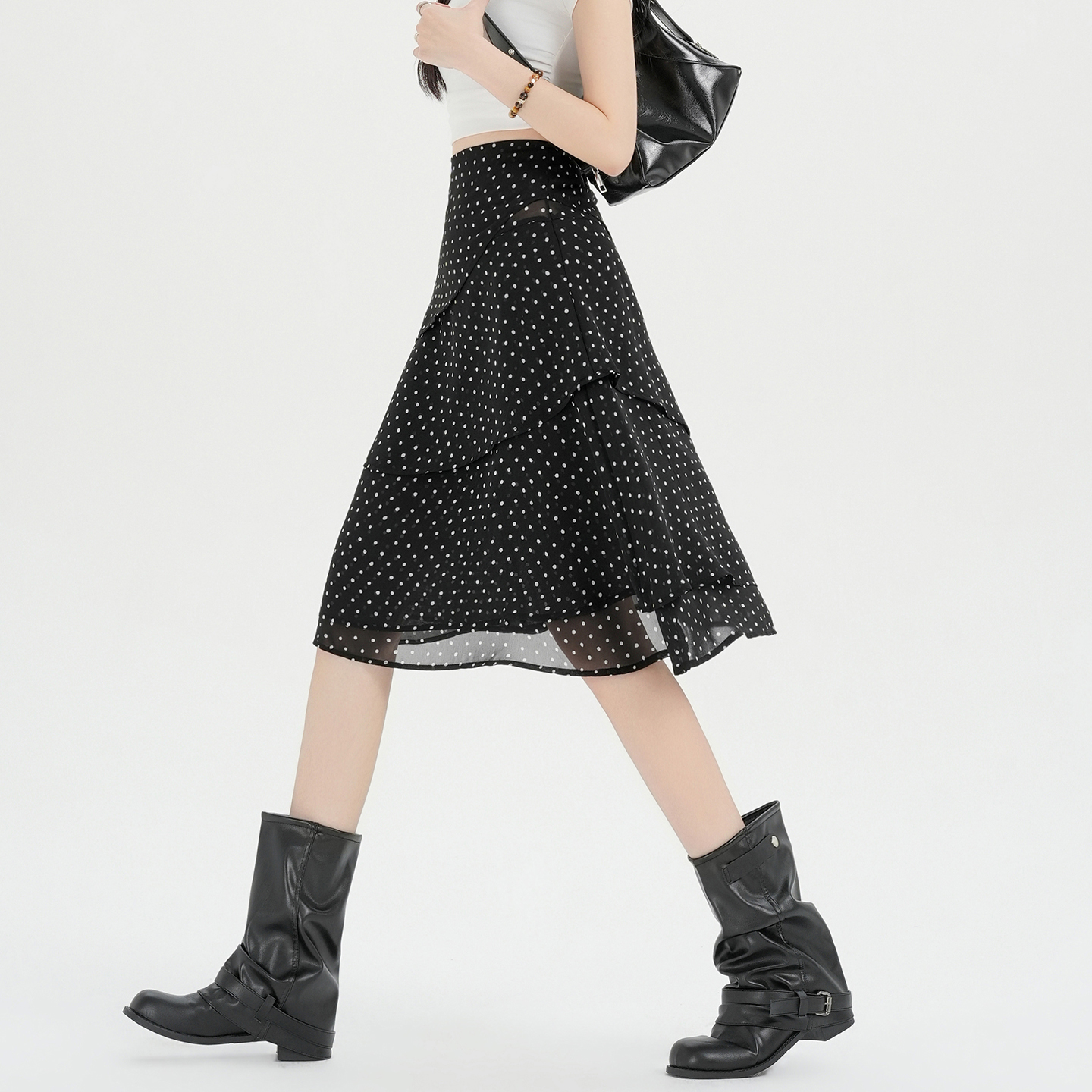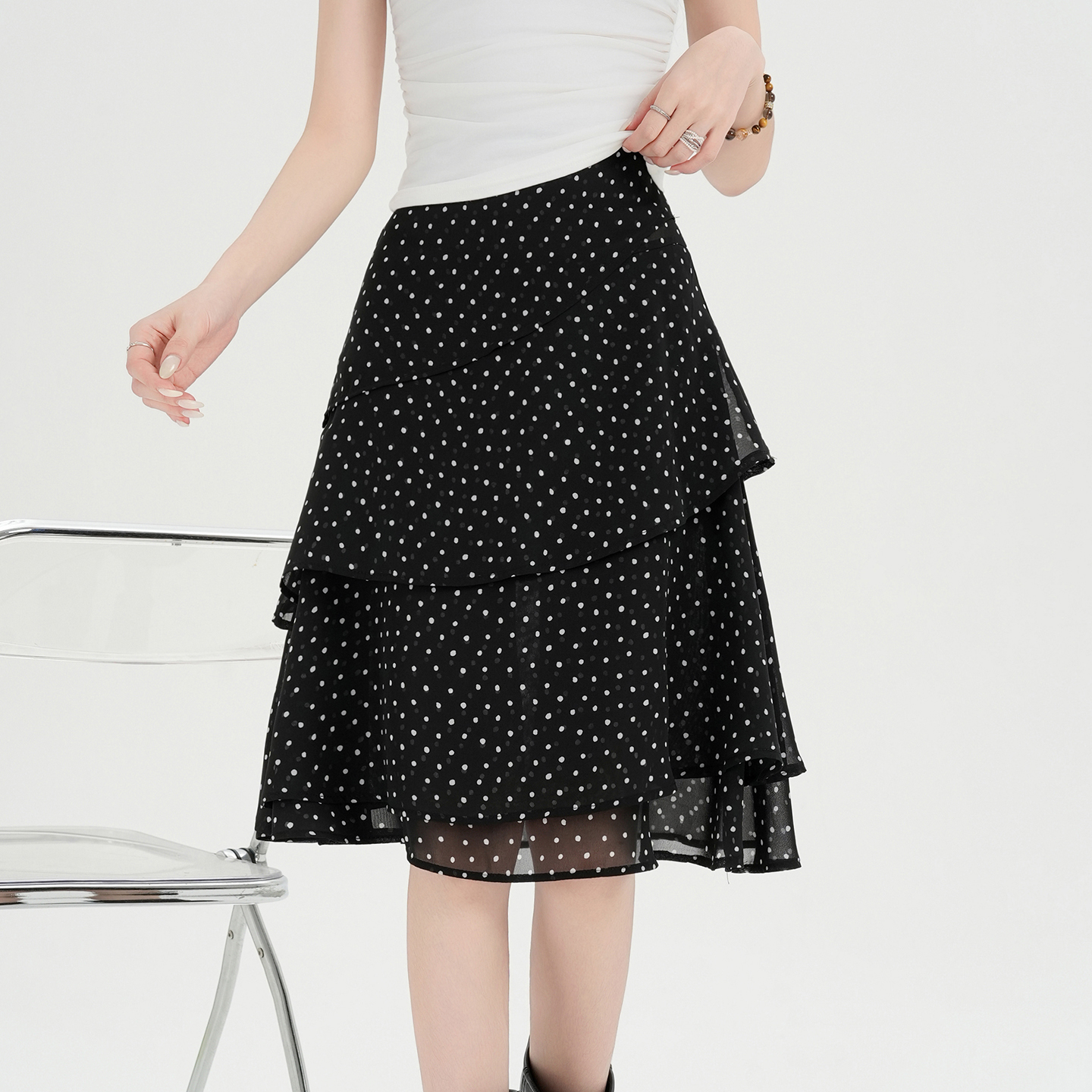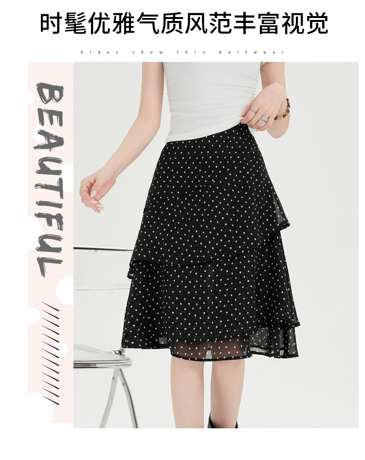 실사 2026 봄 새로운 패션 다용도 레오파드 무늬 프린트 슬림해 보이는 쉬폰 케이크 드레스 도트 무늬 치마 중간 스커트 여성