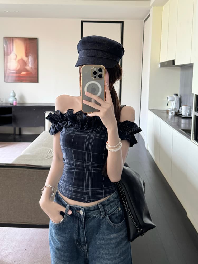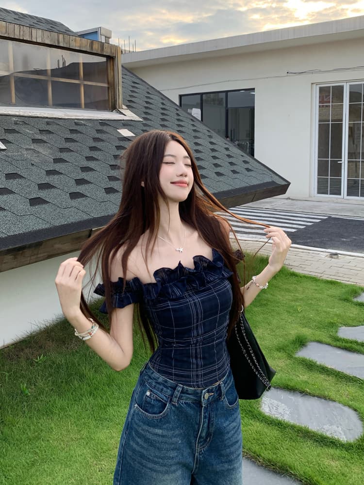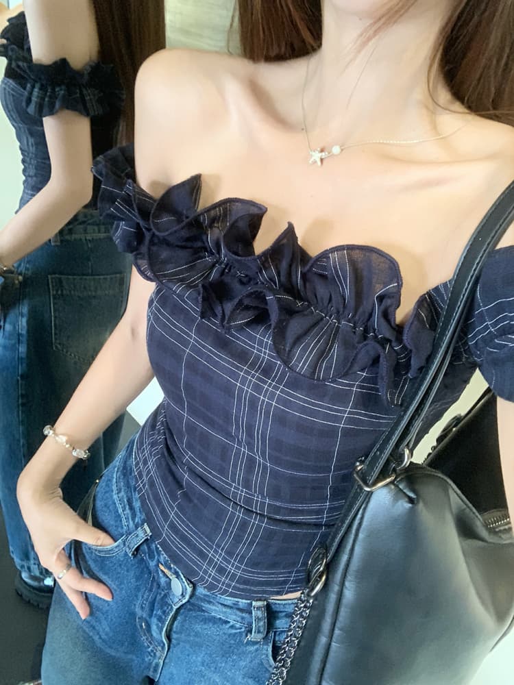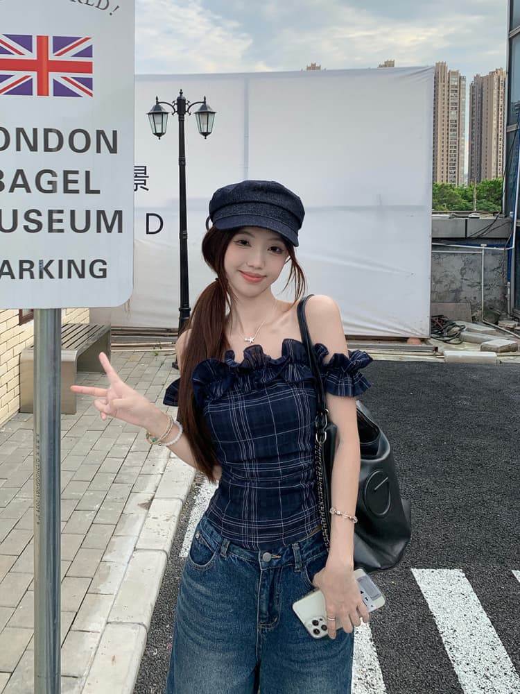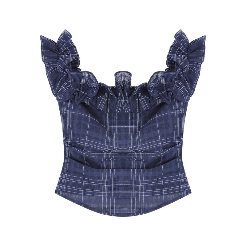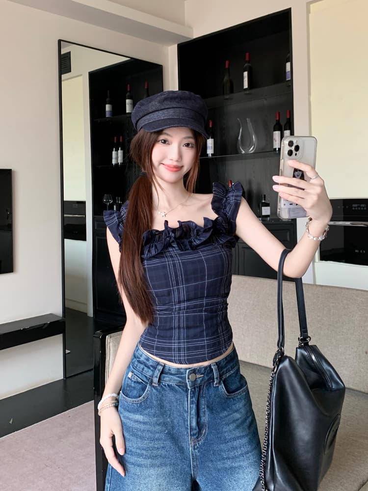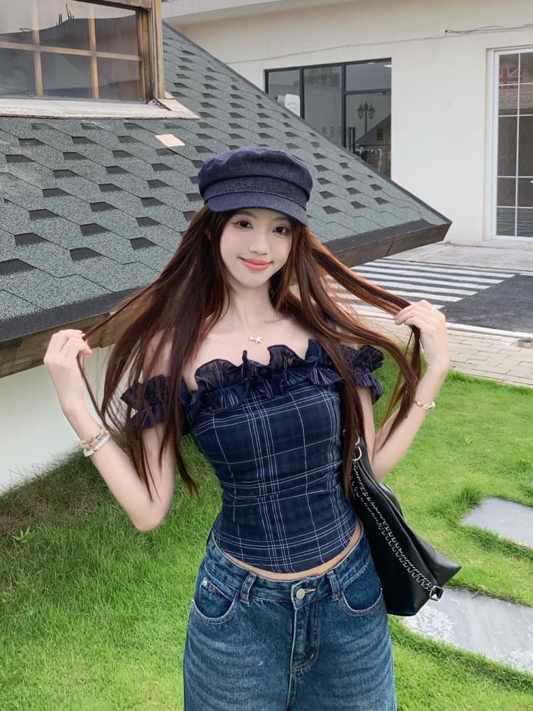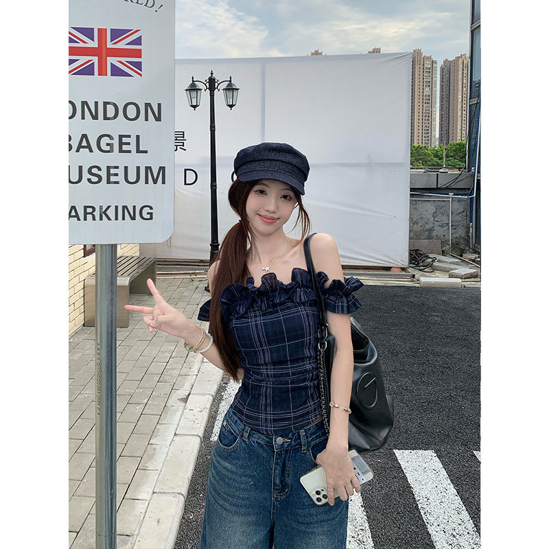 작은 대중 디자인 센스 둘 착용 파란색 체크무늬 반신 스커트 여성 여름 프랑스식 품격 튜브탑 조끼 스커트 한 마디 우산 치마