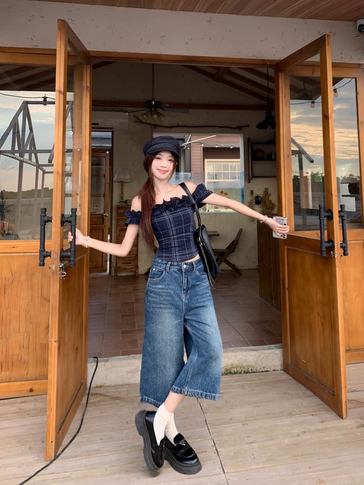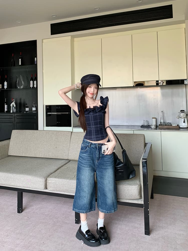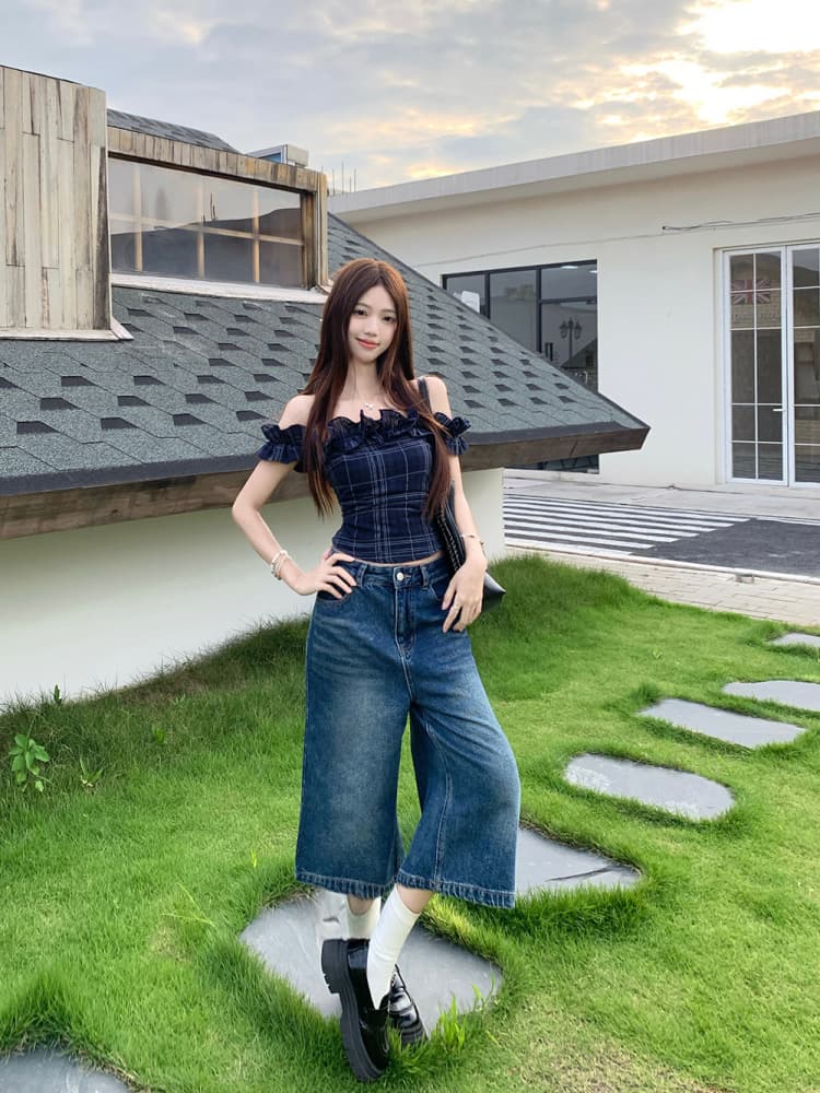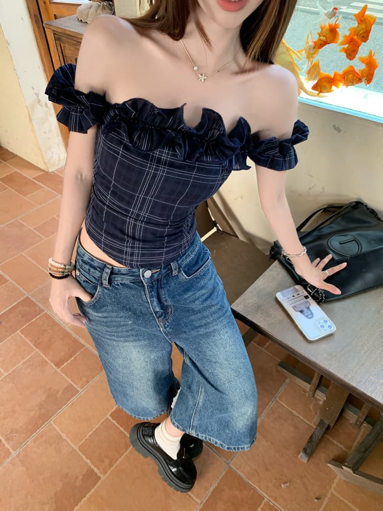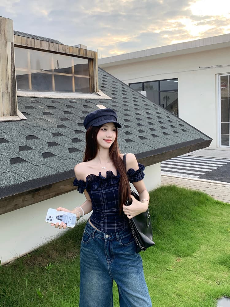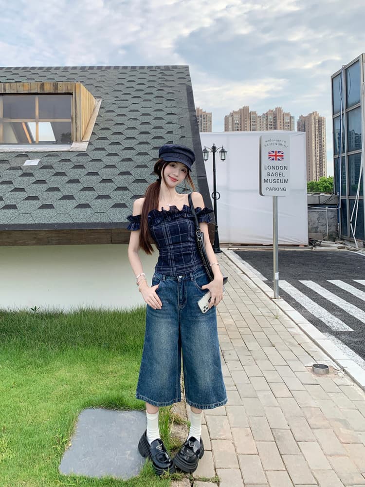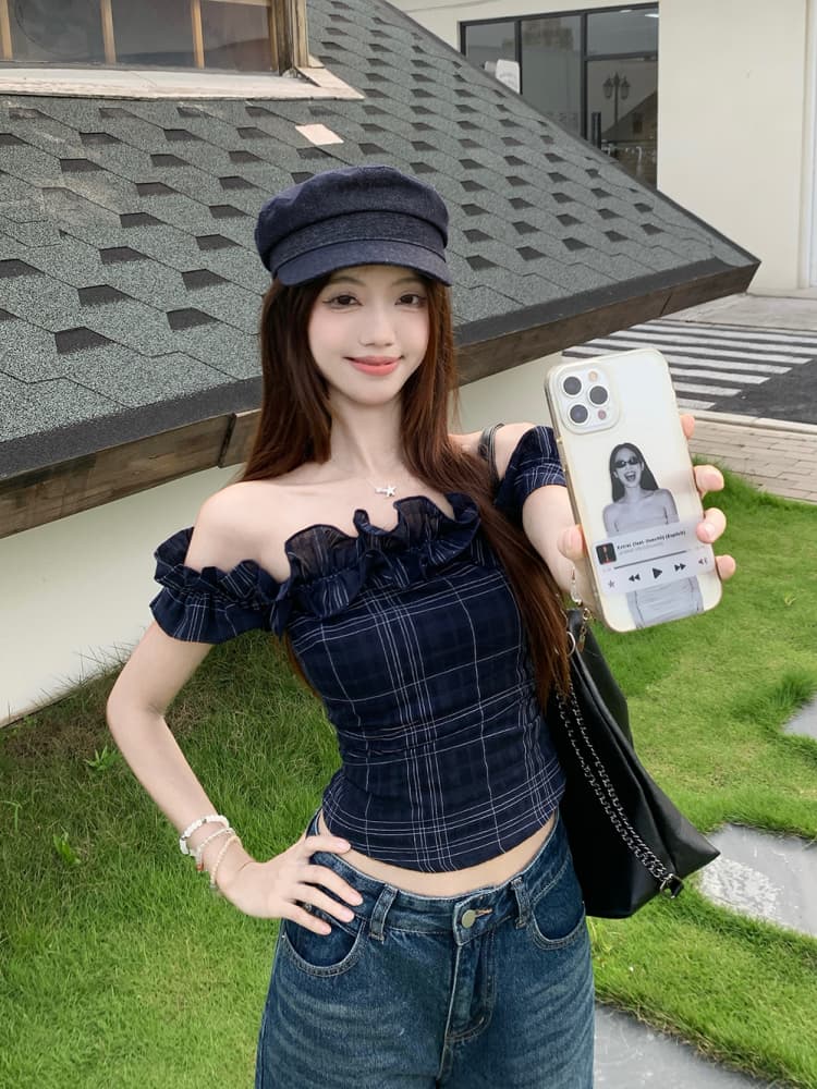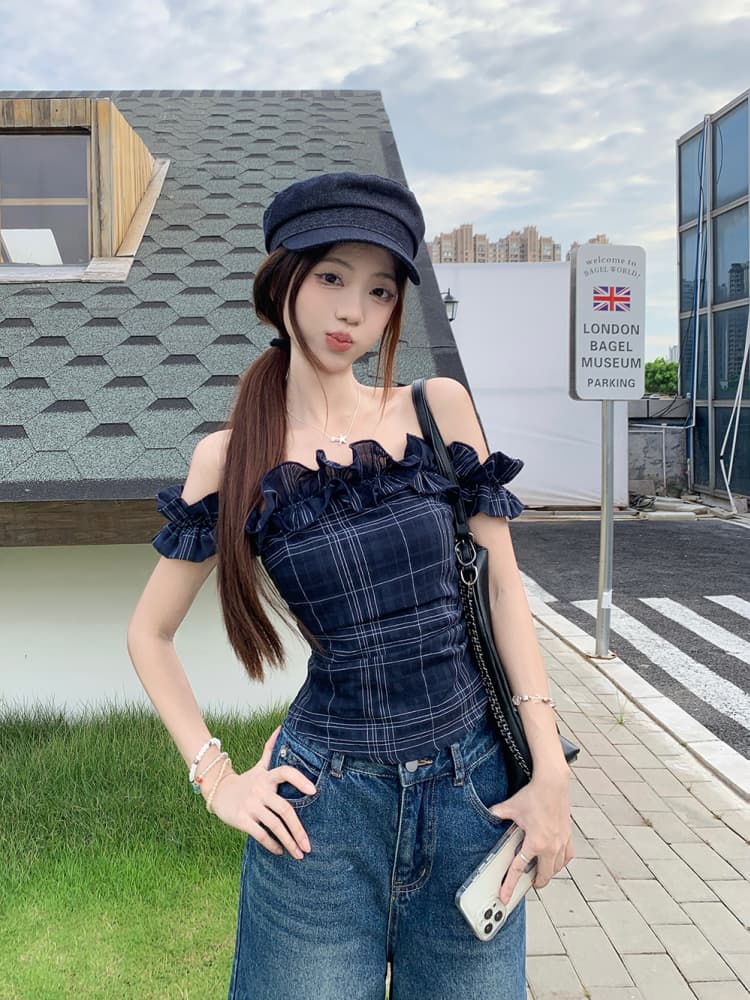 작은 대중 디자인 센스 둘 착용 파란색 체크무늬 반신 스커트 여성 여름 프랑스식 품격 튜브탑 조끼 스커트 한 마디 우산 치마