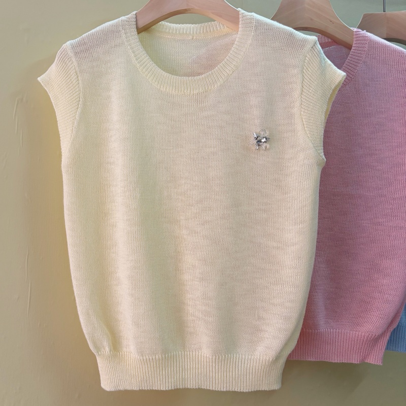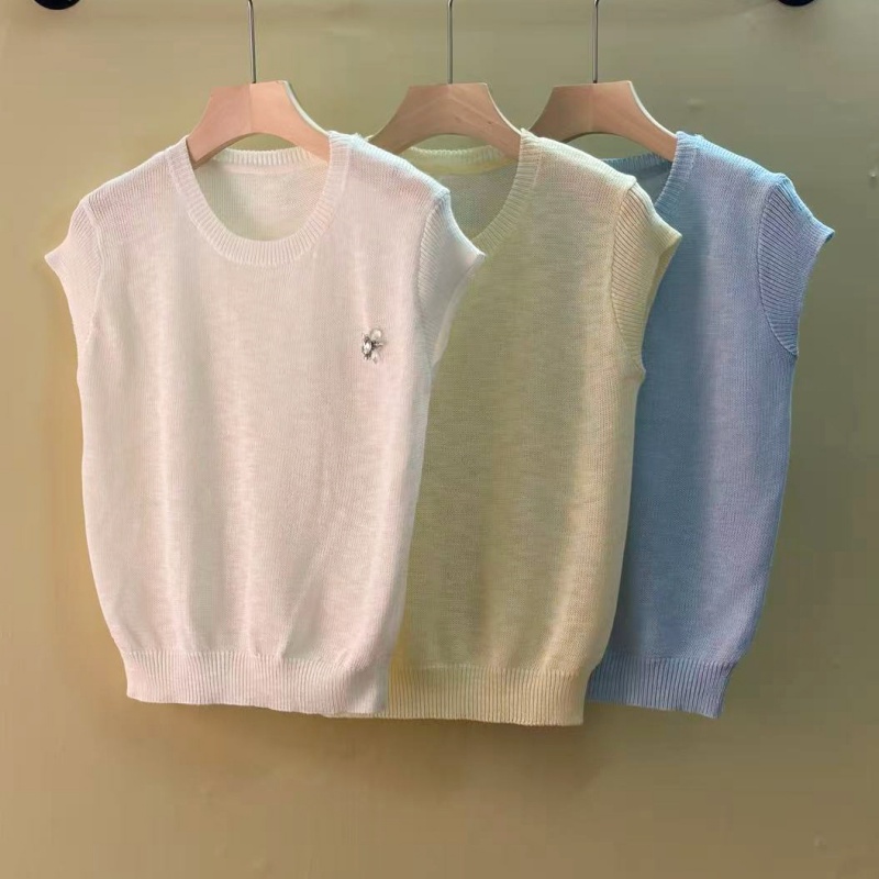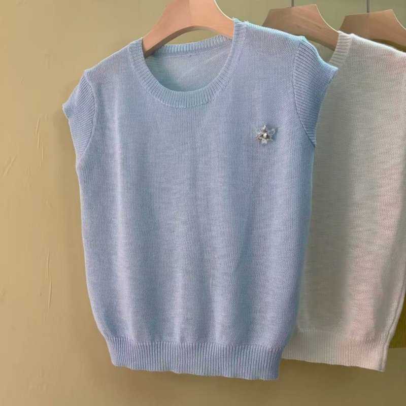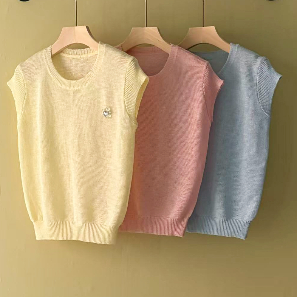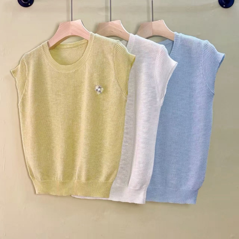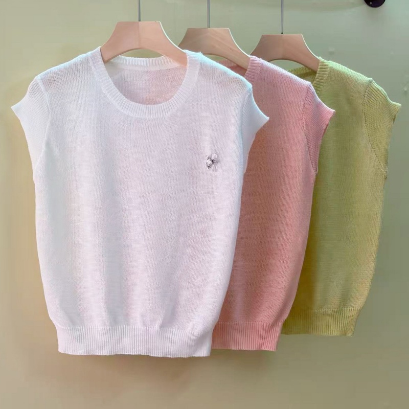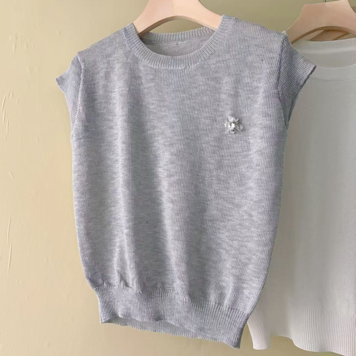 mz 작은 키 레이스 꽃 장식 항공기 소매 26 여름 신제품 아마 라운드 넥 여성 티셔츠 니트 스웨터