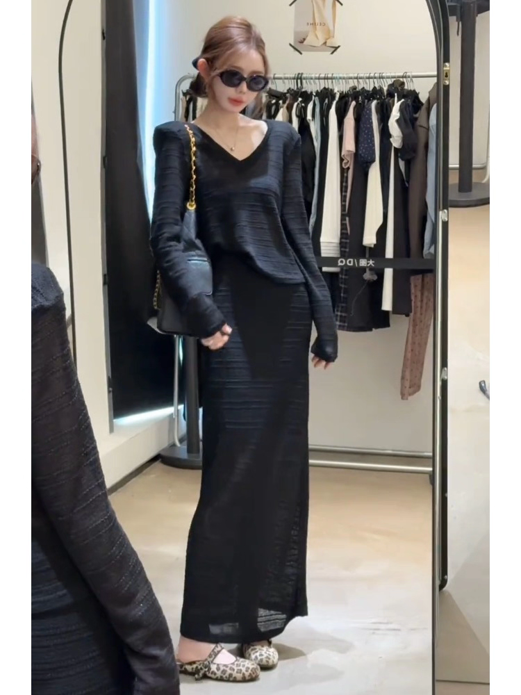 봄 슈퍼 화재 느슨함 센스 착용 가져 가라. 전체 집합 품격 고급 여신 팬 작은 샤넬 스타일 검정색 맨위 반신 치마 세트