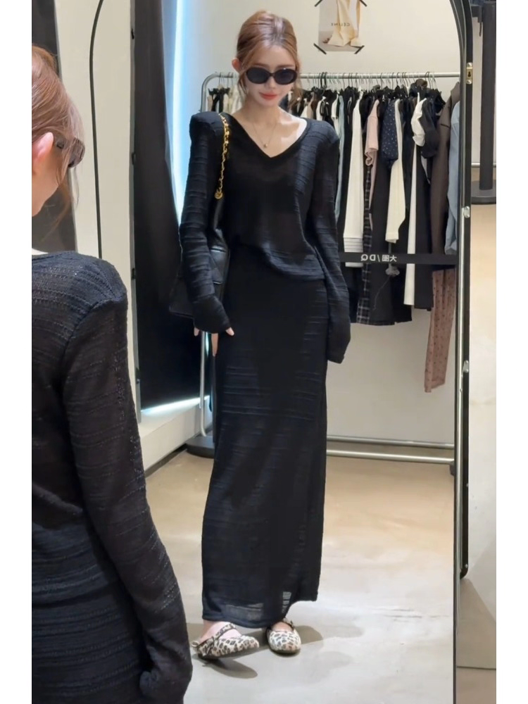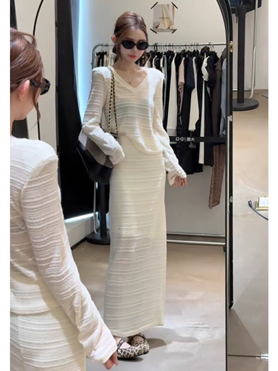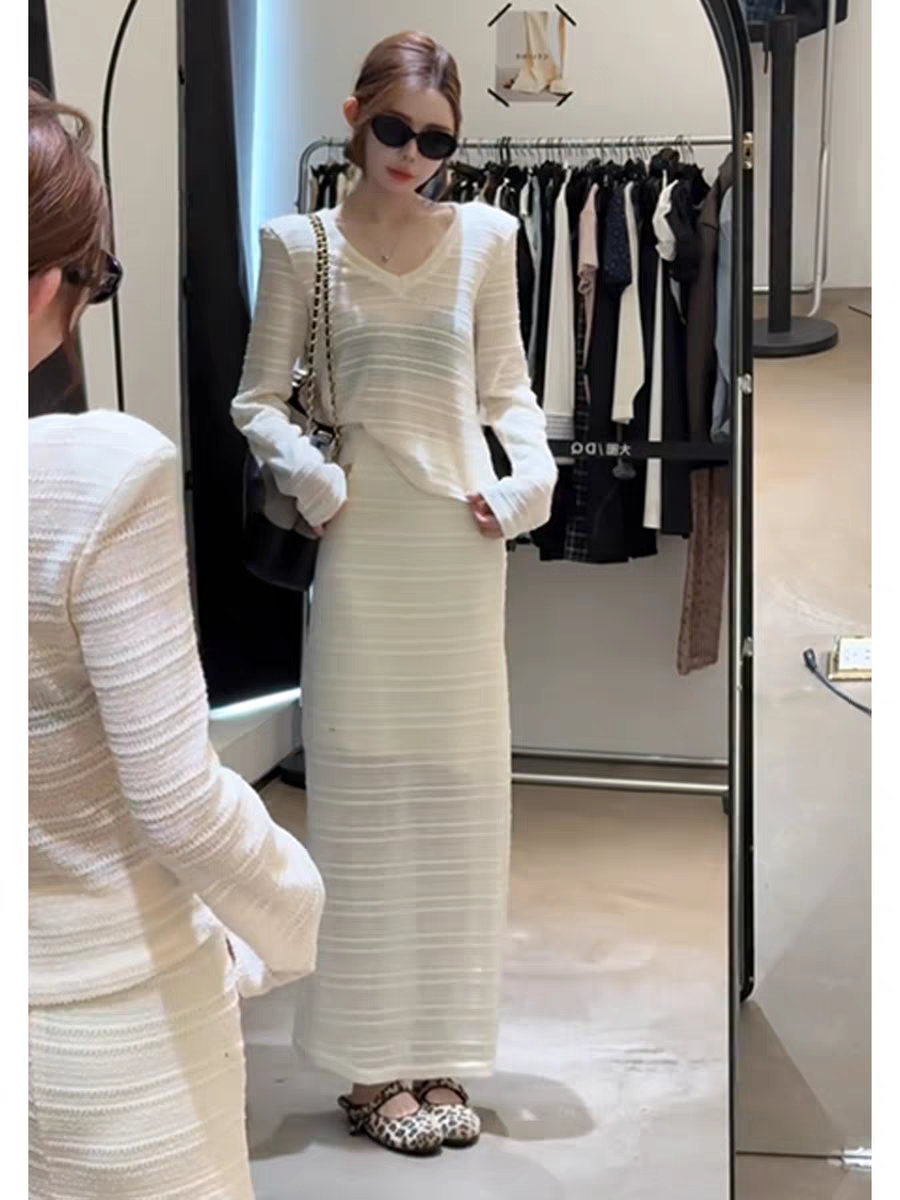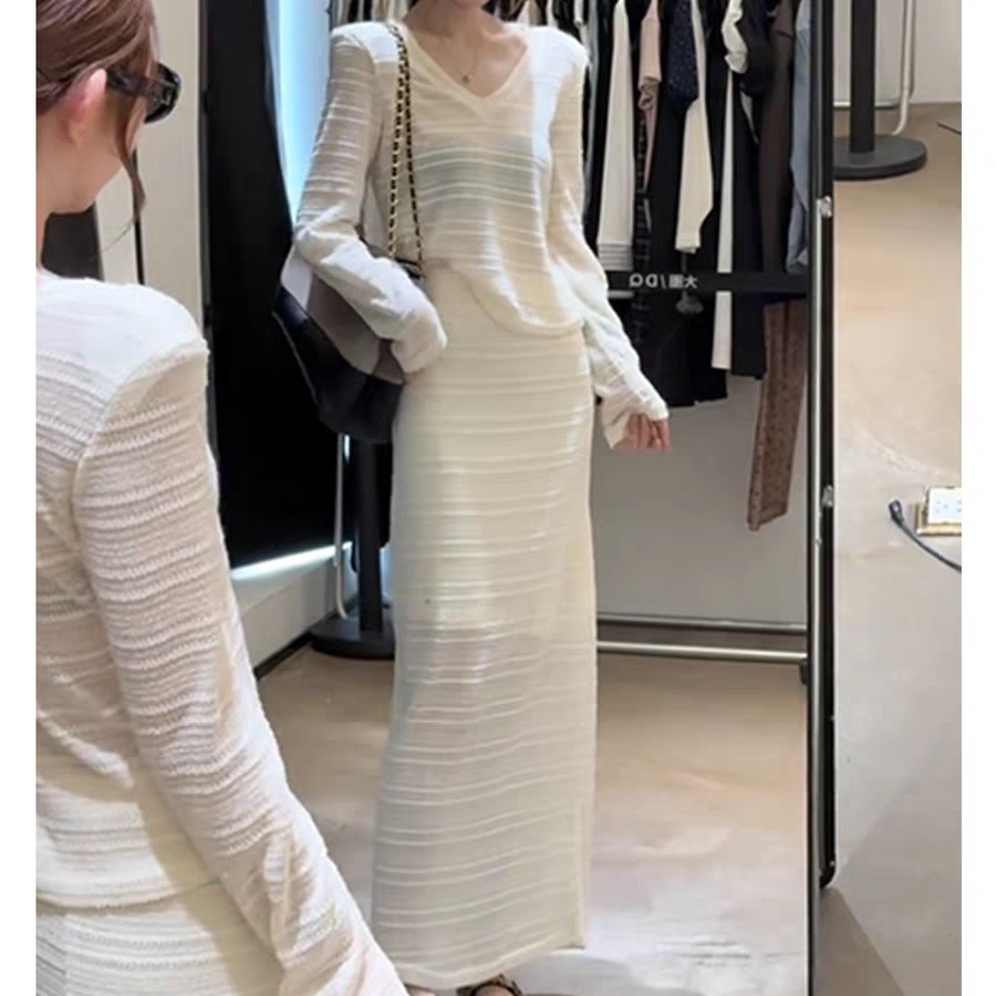 부드러운 바람 캐주얼 미니멀리즘 세트 2025 가을 겨울 새로운 긴팔 오프숄더 니트 맨위 반신 스커트 슬림해 보이는 여성 의류
