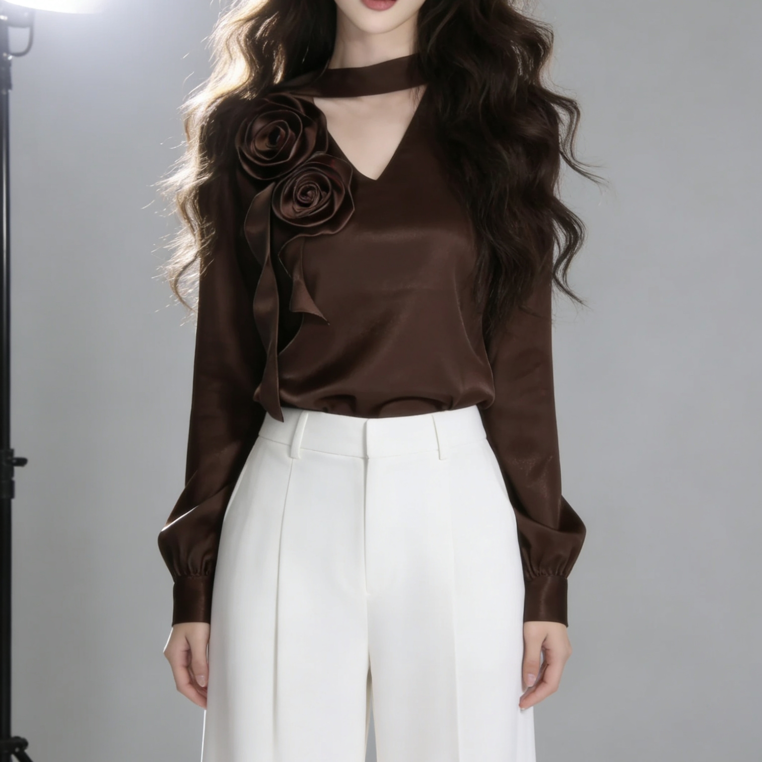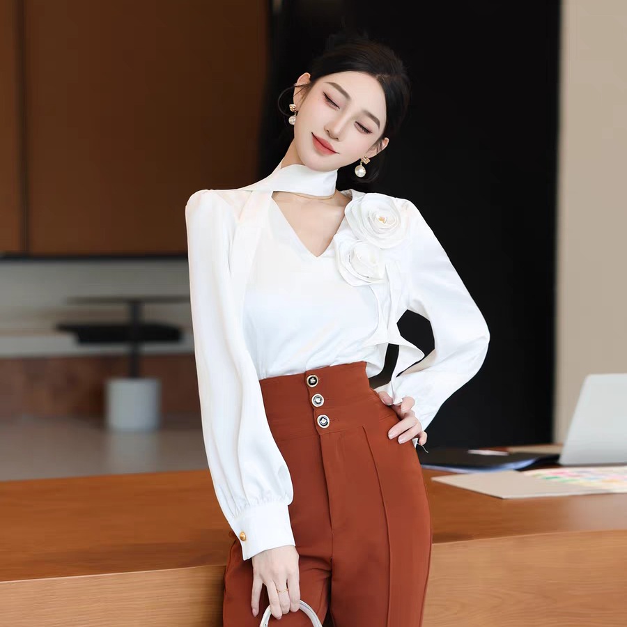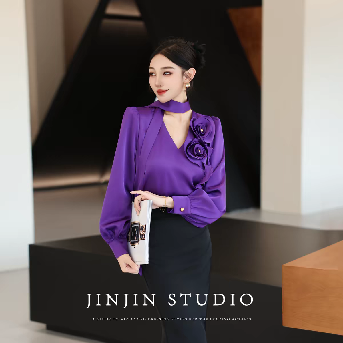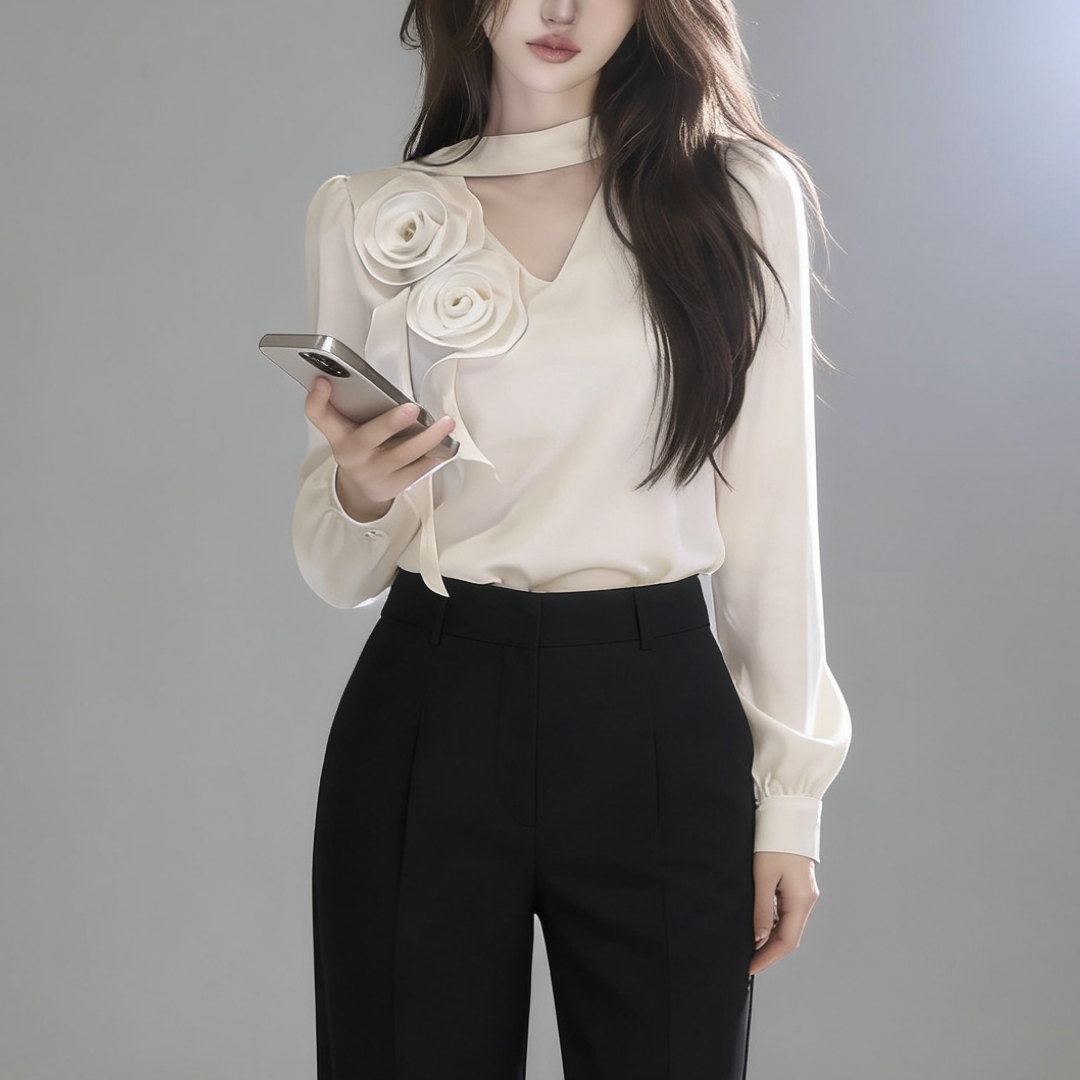 md 입력 오리지널 계단식 꽃 리플 2026 봄 3 차원 꽃 긍정적 인 어깨 디자인 센스 리본 긴팔 셔츠