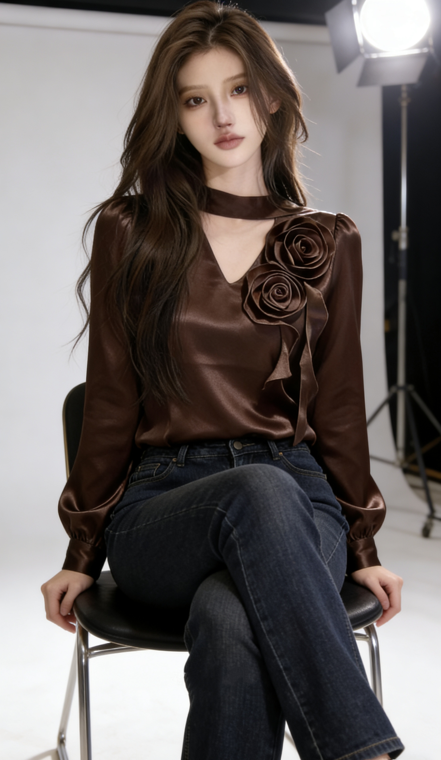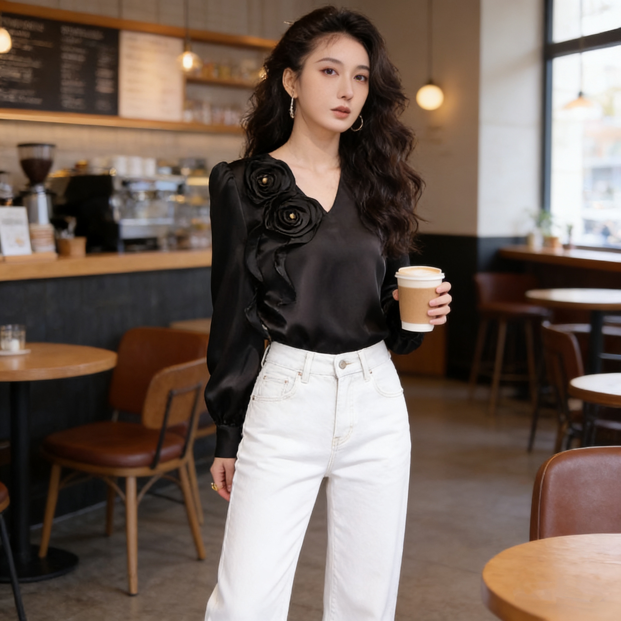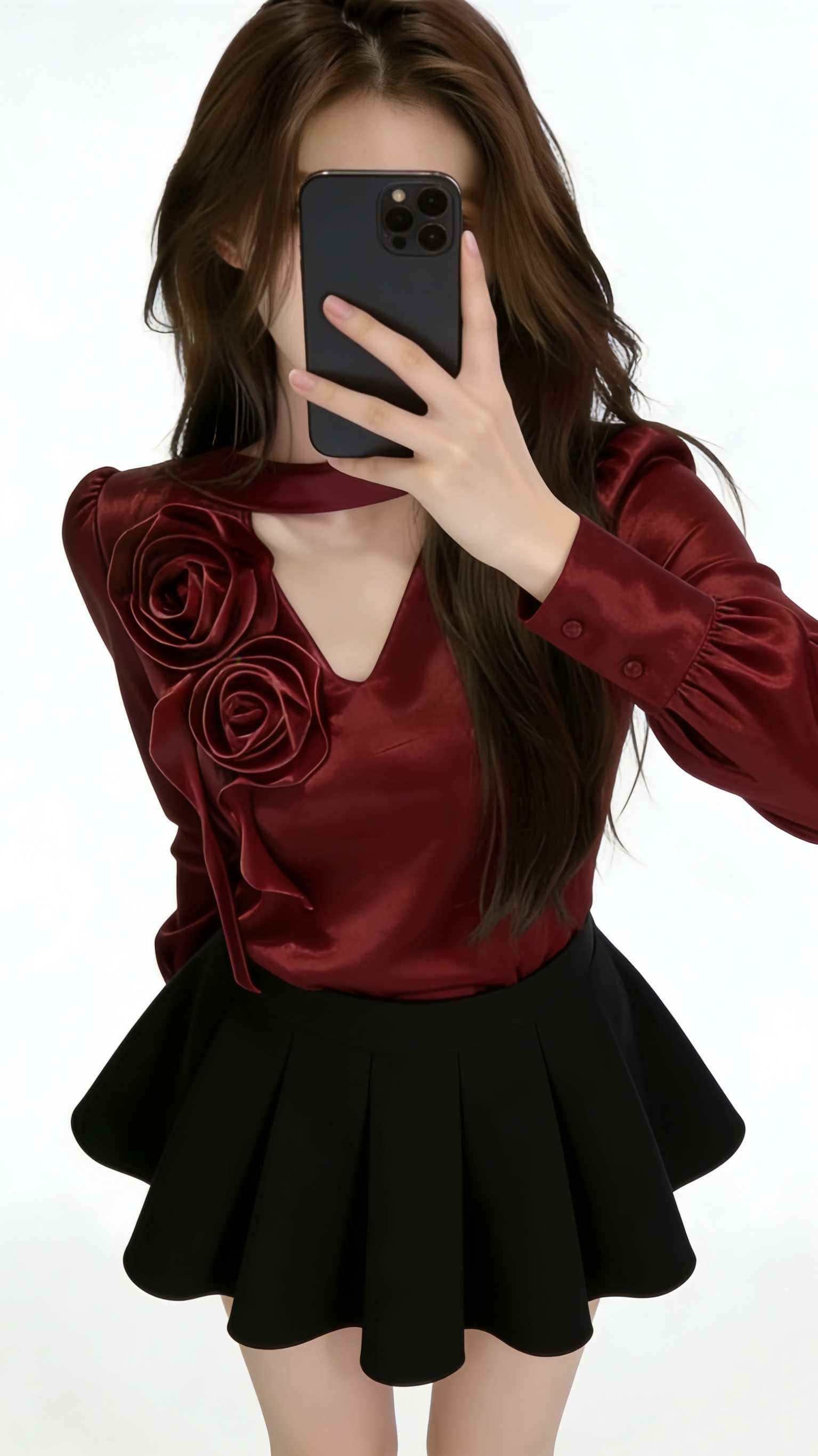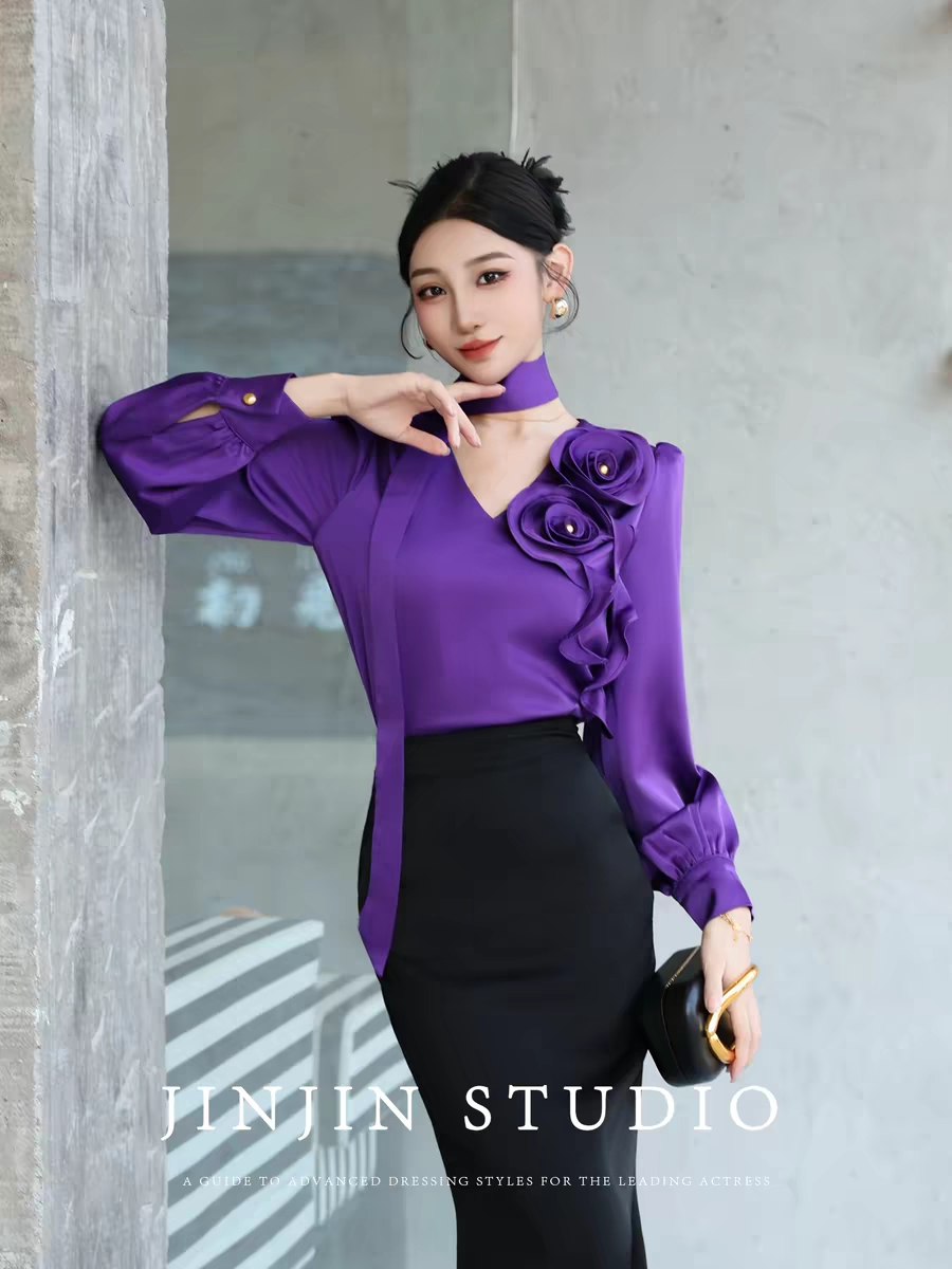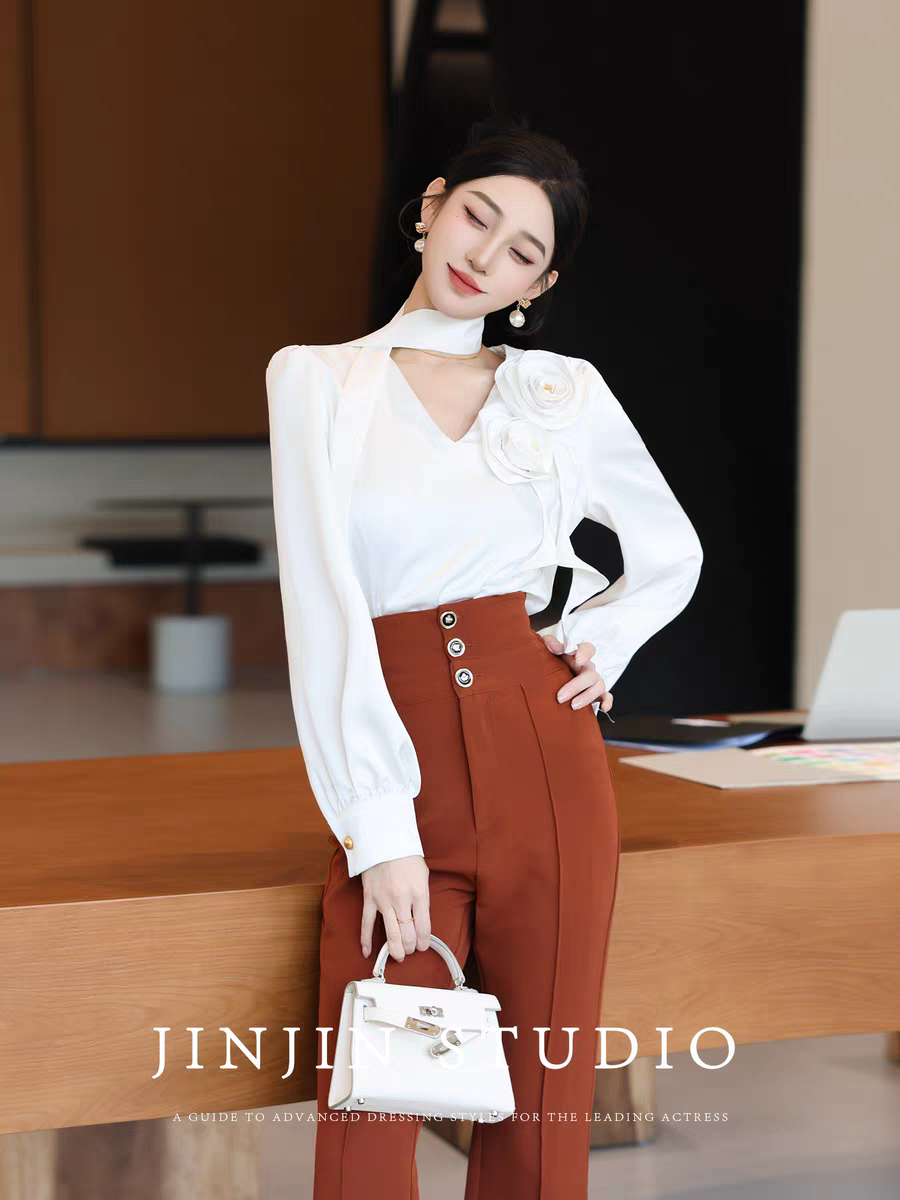 md 입력 오리지널 계단식 꽃 리플 2026 봄 3 차원 꽃 긍정적 인 어깨 디자인 센스 리본 긴팔 셔츠