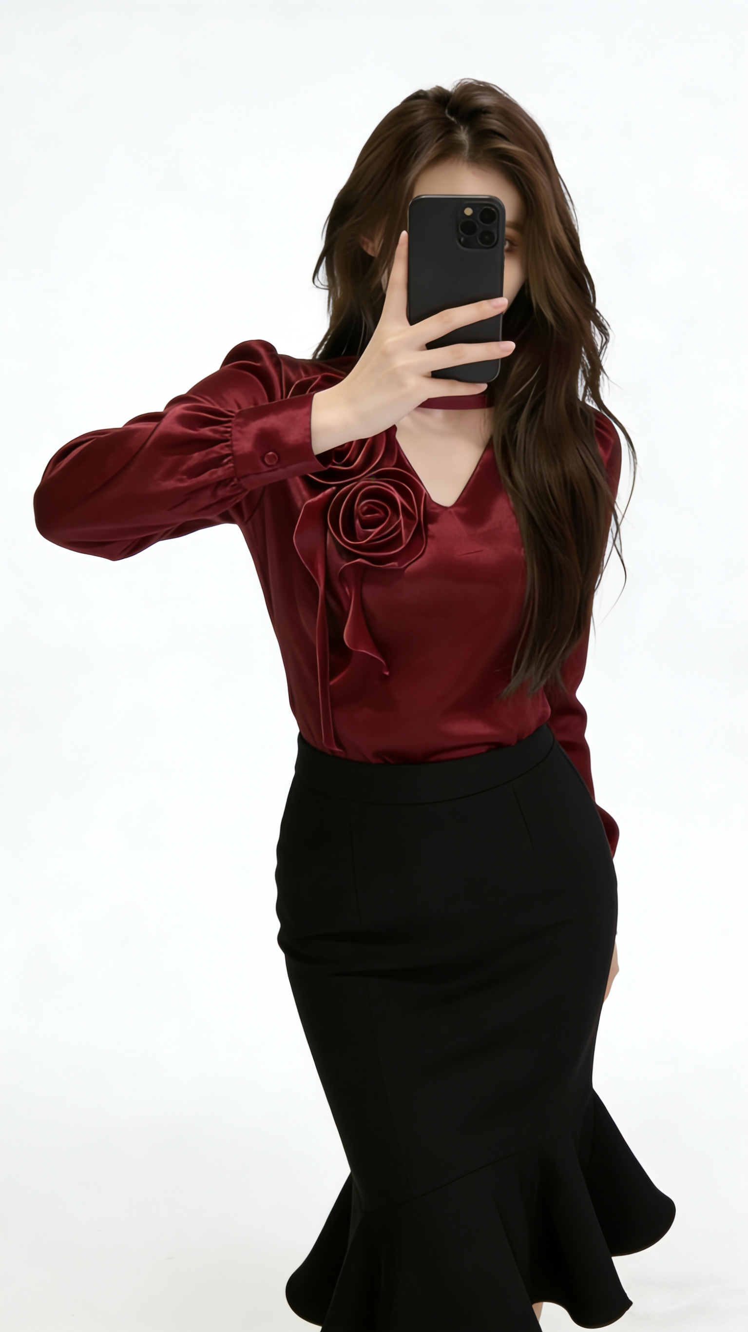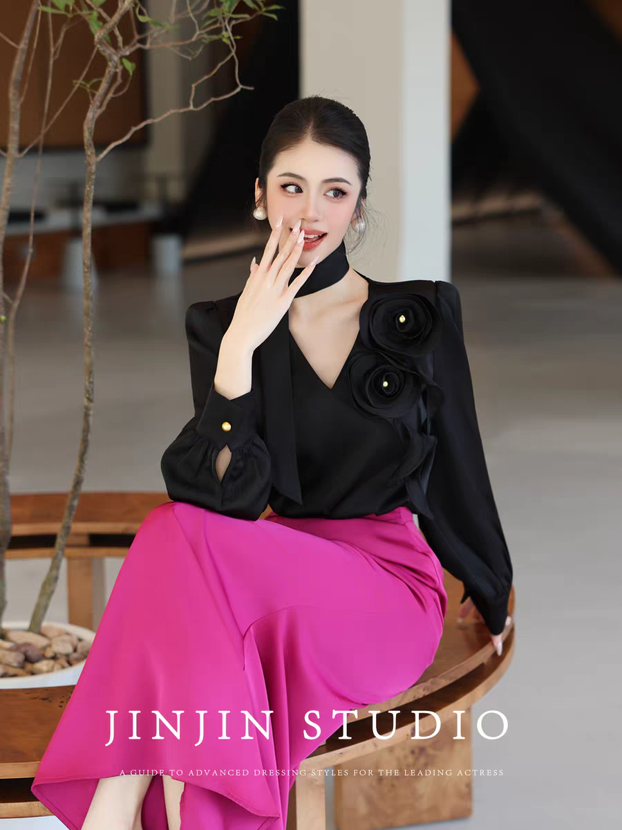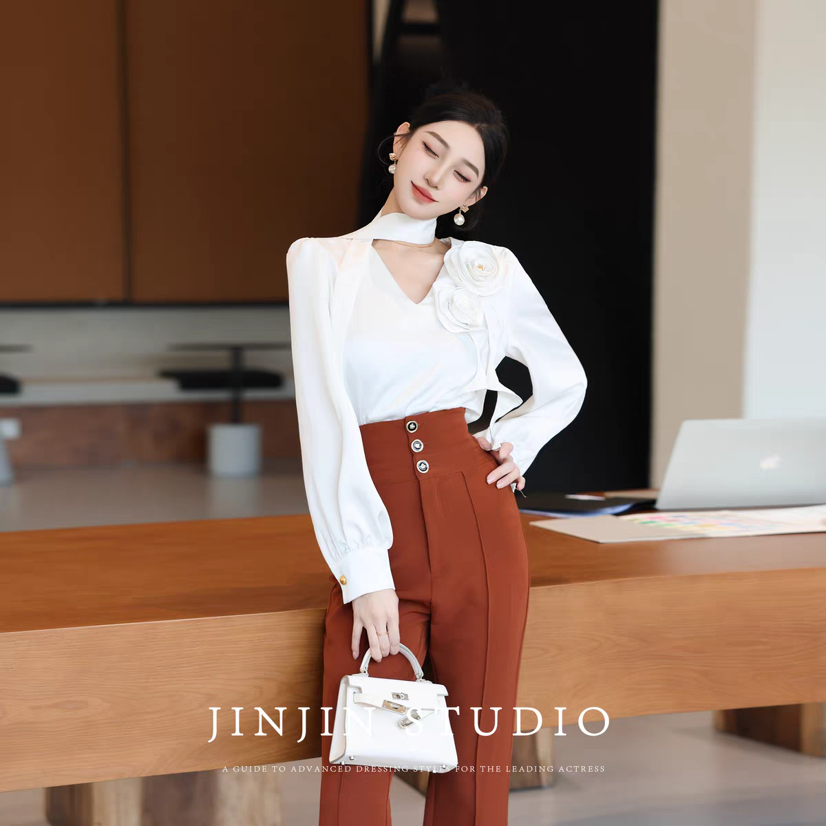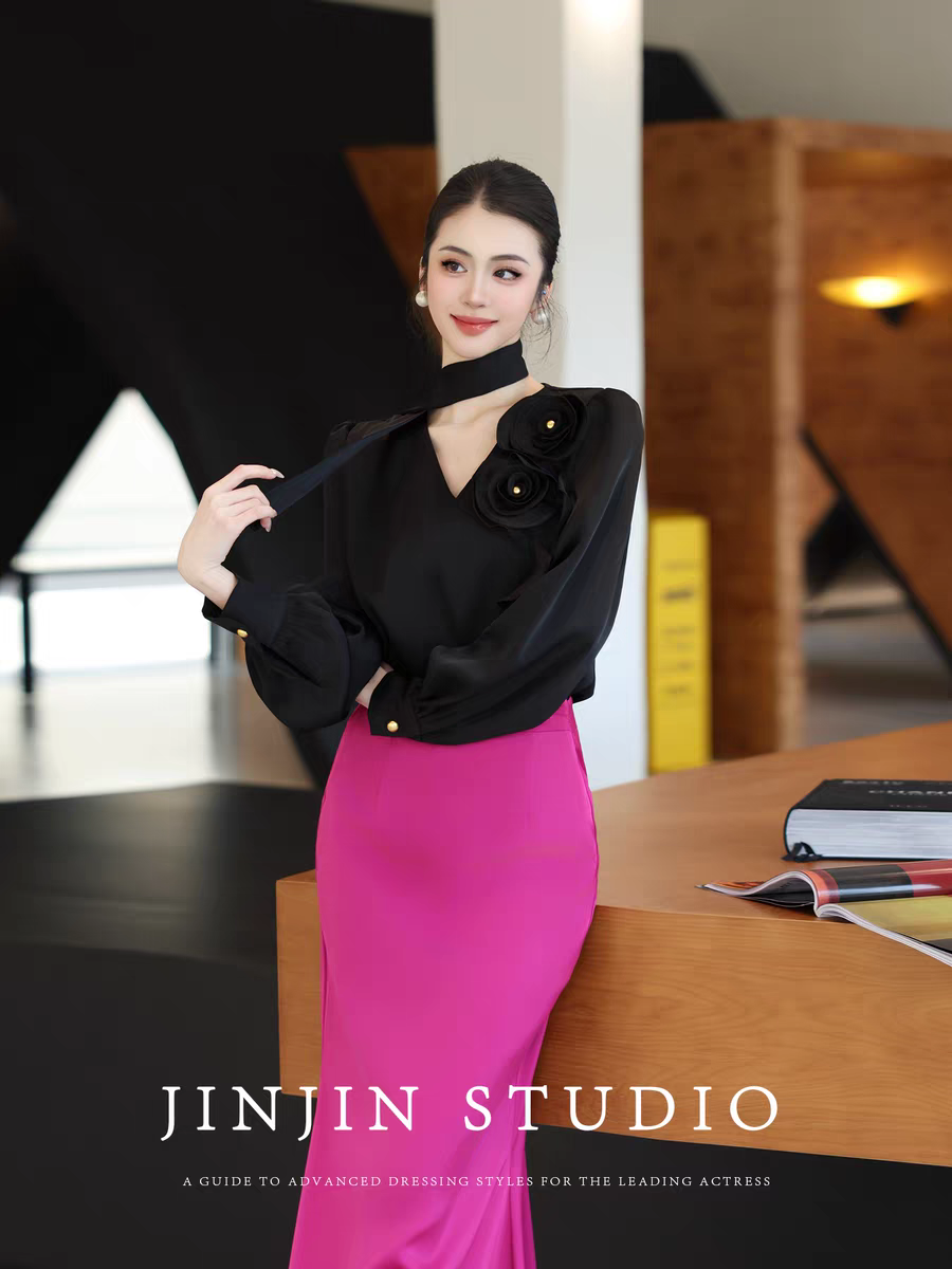md 입력 오리지널 계단식 꽃 리플 2026 봄 3 차원 꽃 긍정적 인 어깨 디자인 센스 리본 긴팔 셔츠