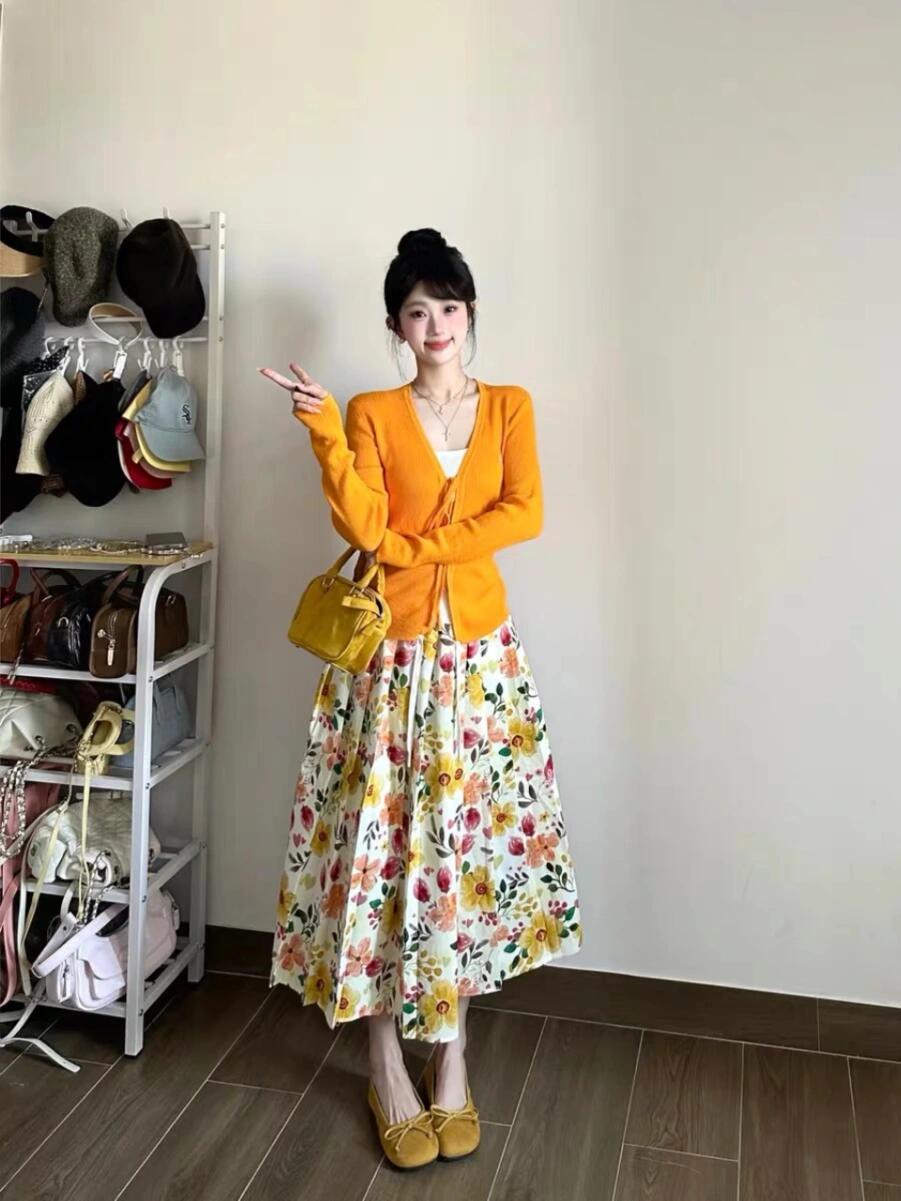 꽃무늬 치마 여성 봄 주황색 꽃 슬림해 보이는 하이웨이스트 다용도 롱 코트 반신 스커트