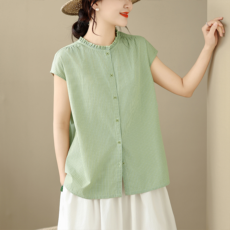 문예 순면 녹색 체크무늬 여성 셔츠 여름 루즈핏 프릴 라운드 넥 셔츠 캐주얼 맨위