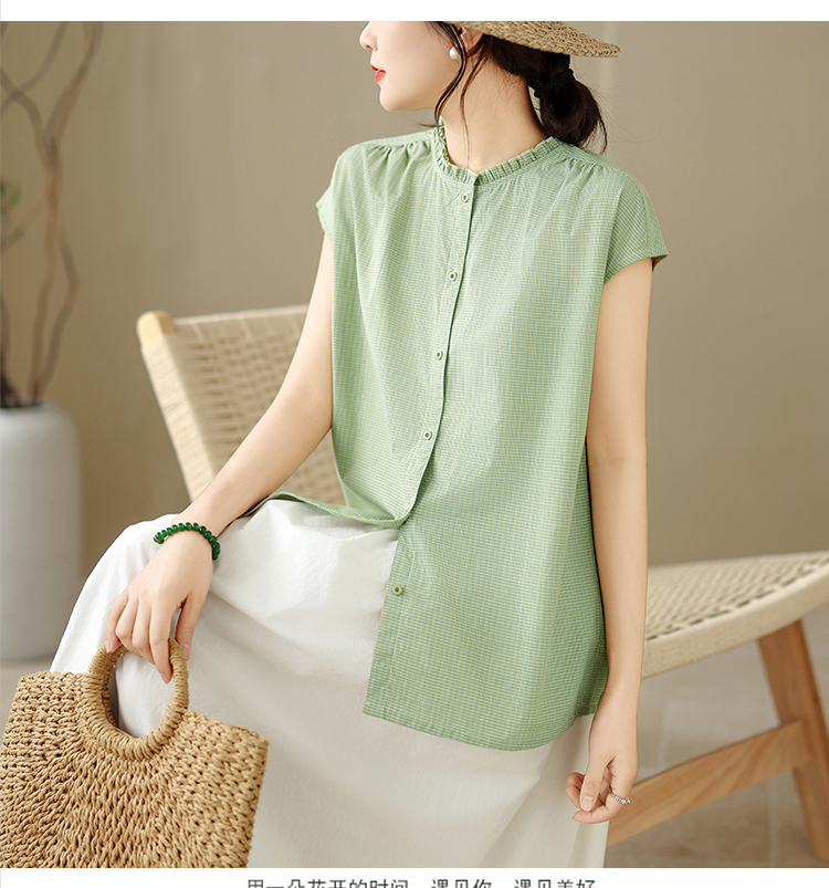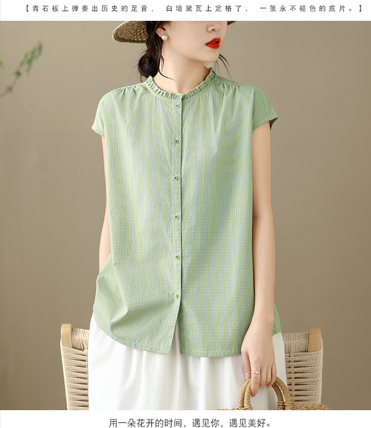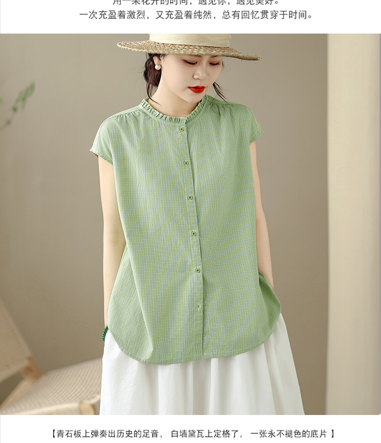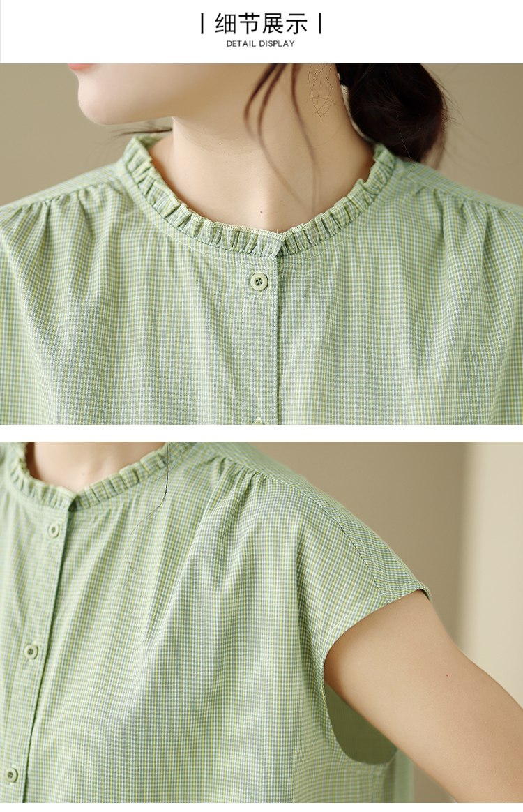 실사 문예 순면 녹색 체크무늬 여성 셔츠 여름 루즈핏 프릴 라운드 넥 셔츠 캐주얼 맨위
