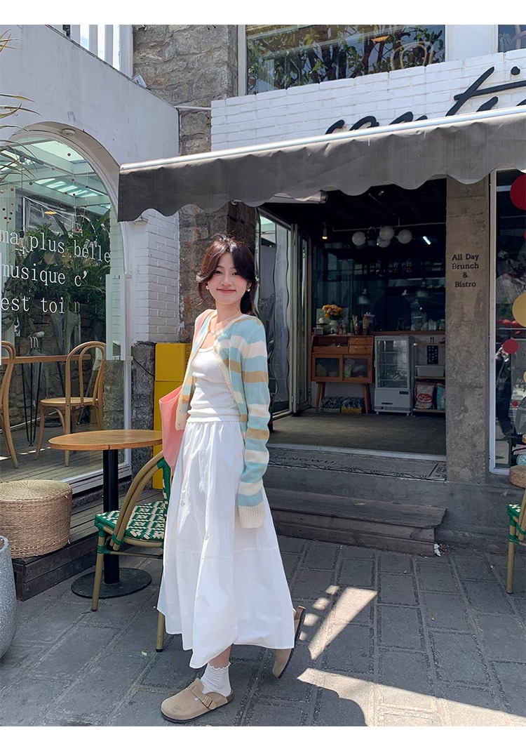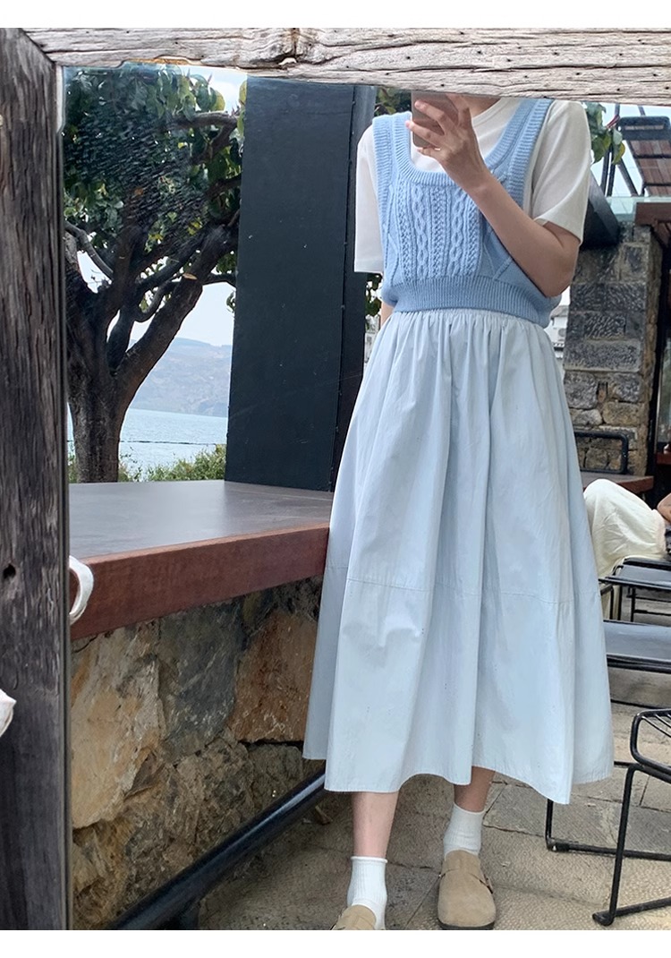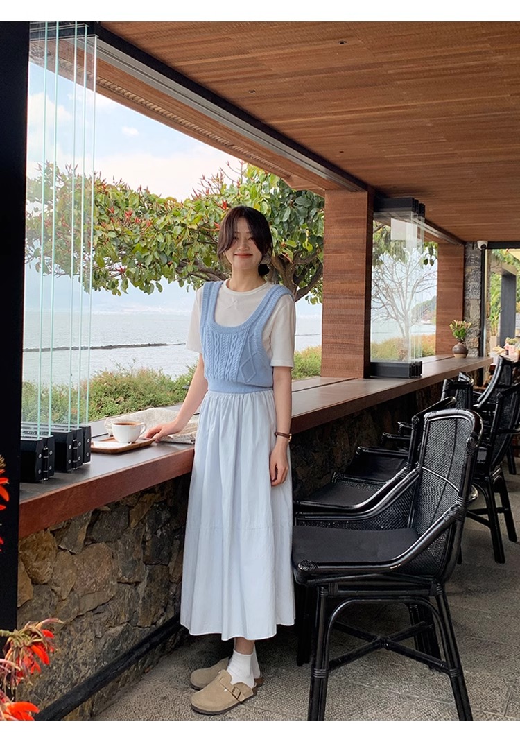 작은 대중 디자인 센스 둘 착용 파란색 체크무늬 반신 스커트 여성 여름 프랑스식 품격 튜브탑 조끼 스커트 한 마디 우산 치마