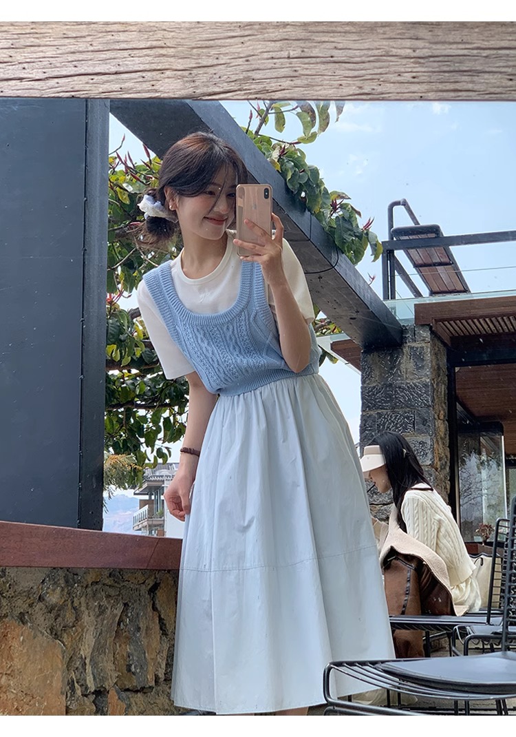 2026 새로운 페이크 레이어드 스트랩 나비 매듭 여성 드레스 봄 달콤한 미국 칼라 허리 수축 슬림해 보이는 숙녀 치마