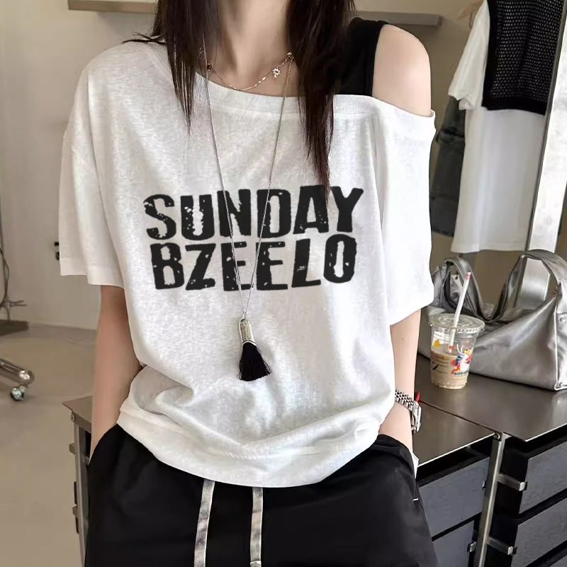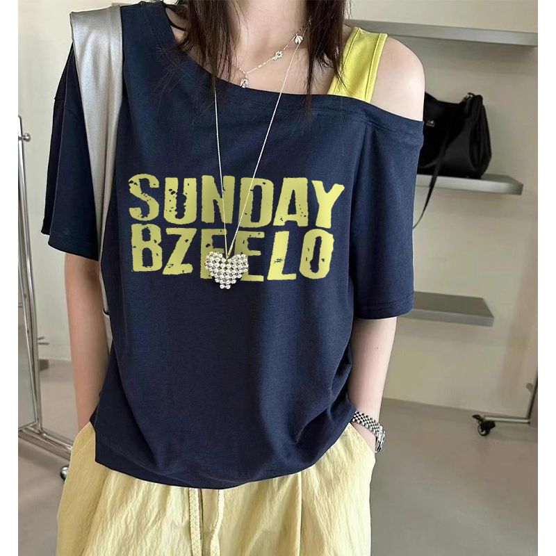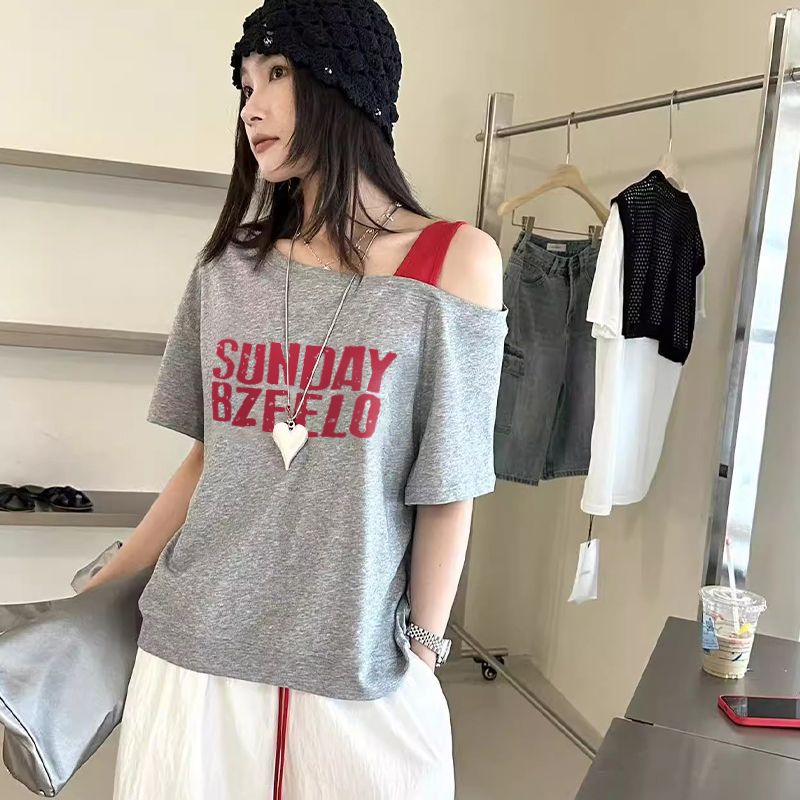 원본 품질 프랑스식 레트로 오프숄더 티셔츠 여성 여름 불규칙 몸매 가꾸기 쇼트 스타일 오프숄더 맨위 체크무늬