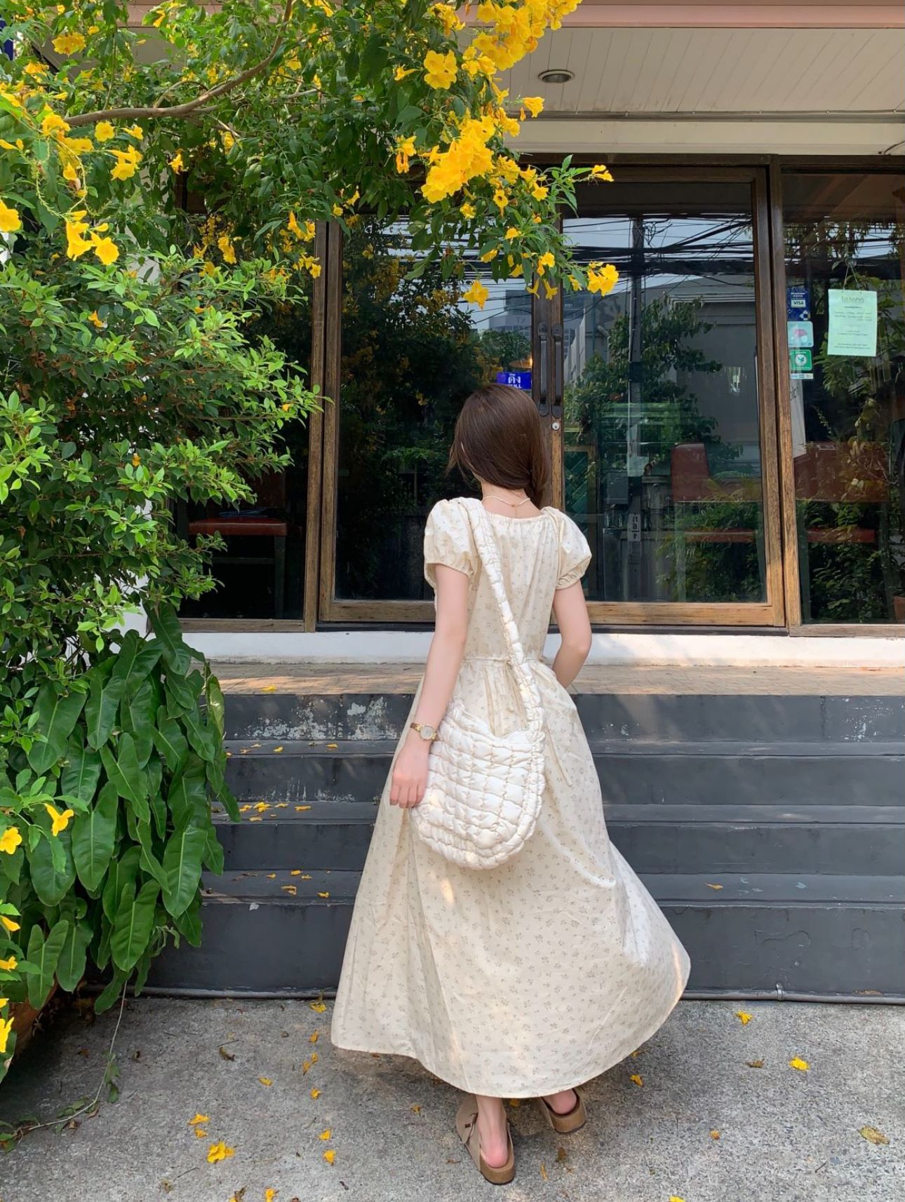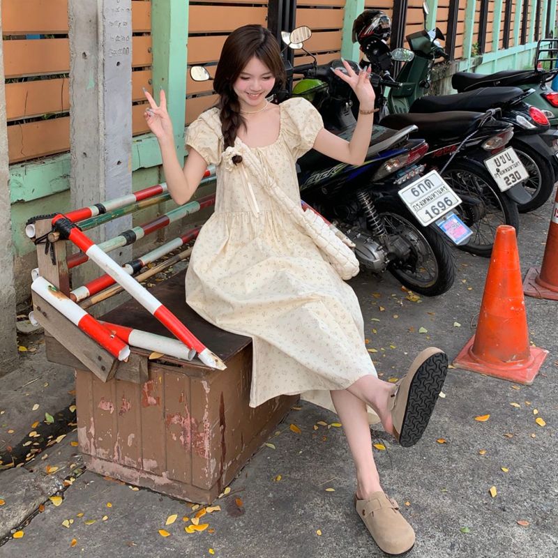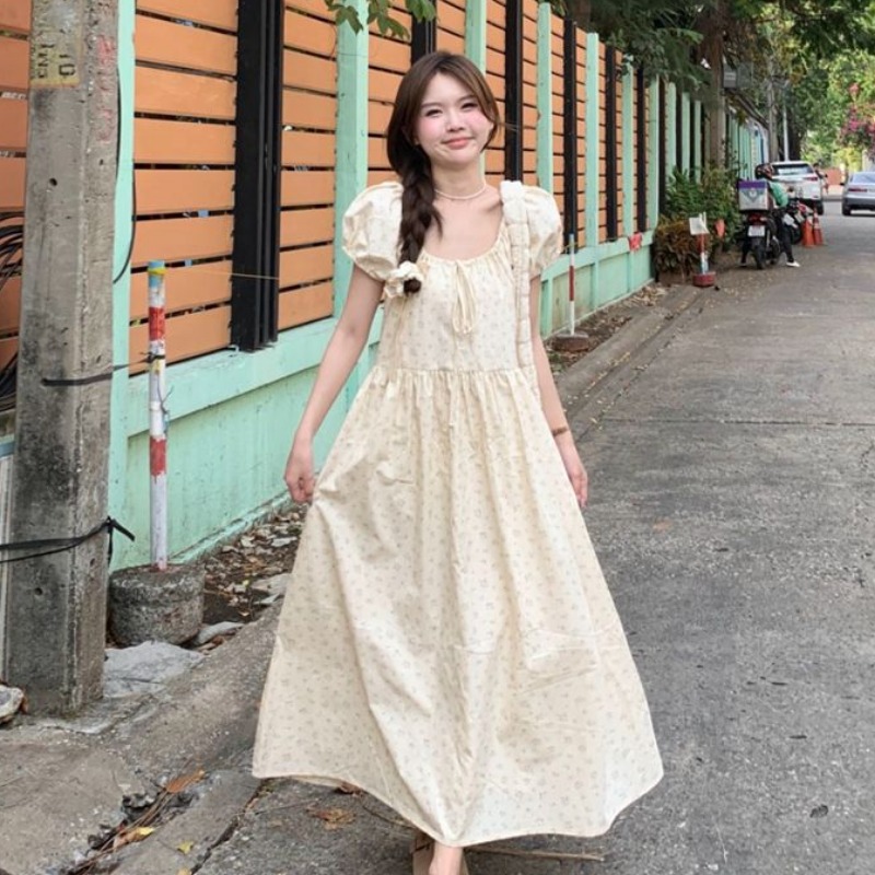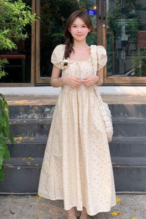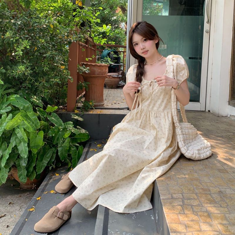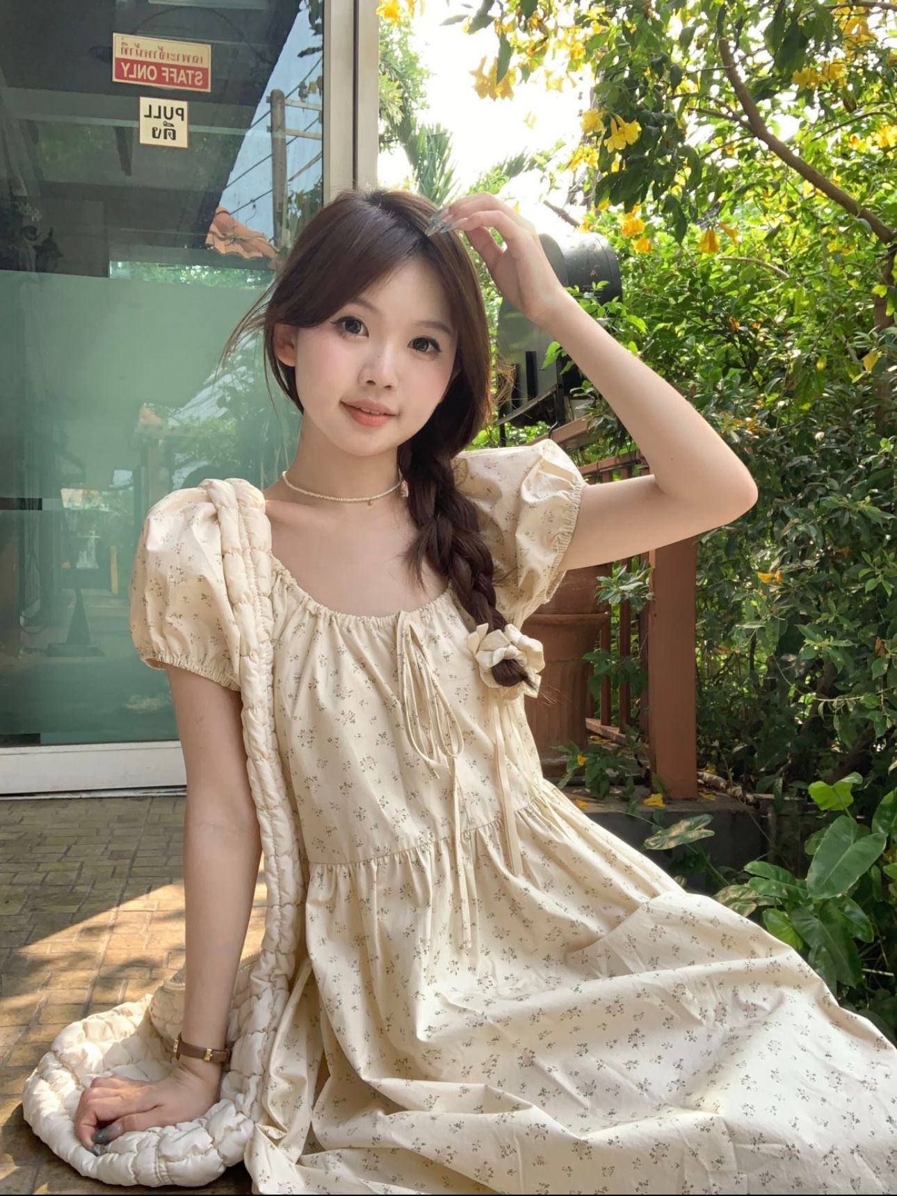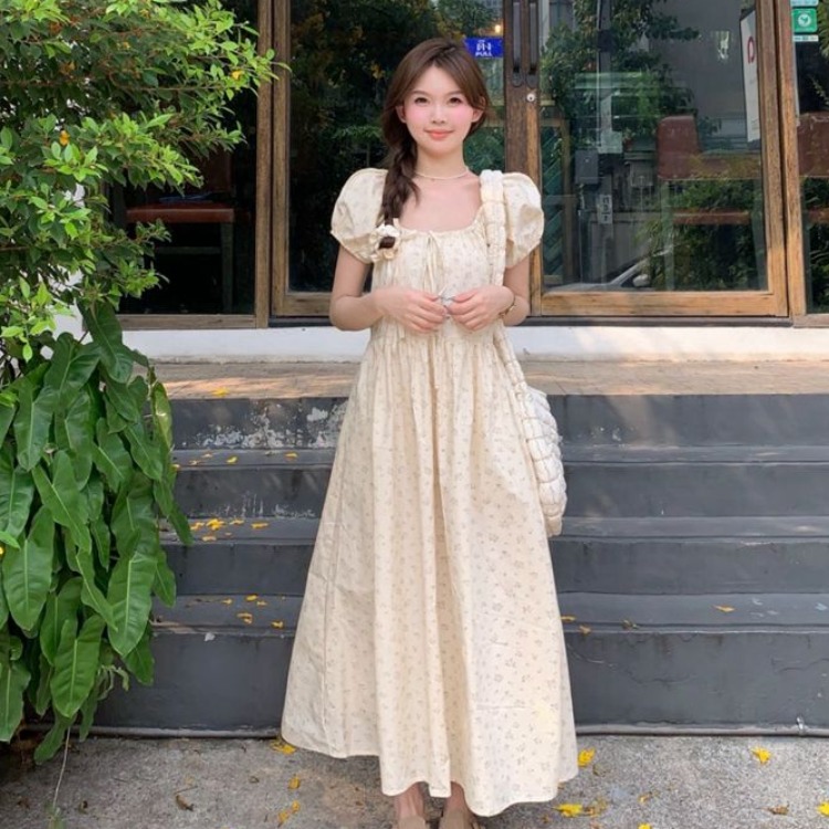 미니멀리즘 꽃무늬 작은 청신 거품 소매 여성 드레스 여름 2025 새로운 허리 수축 한 마디 슬림해 보이는 레이스업 롱 스커트