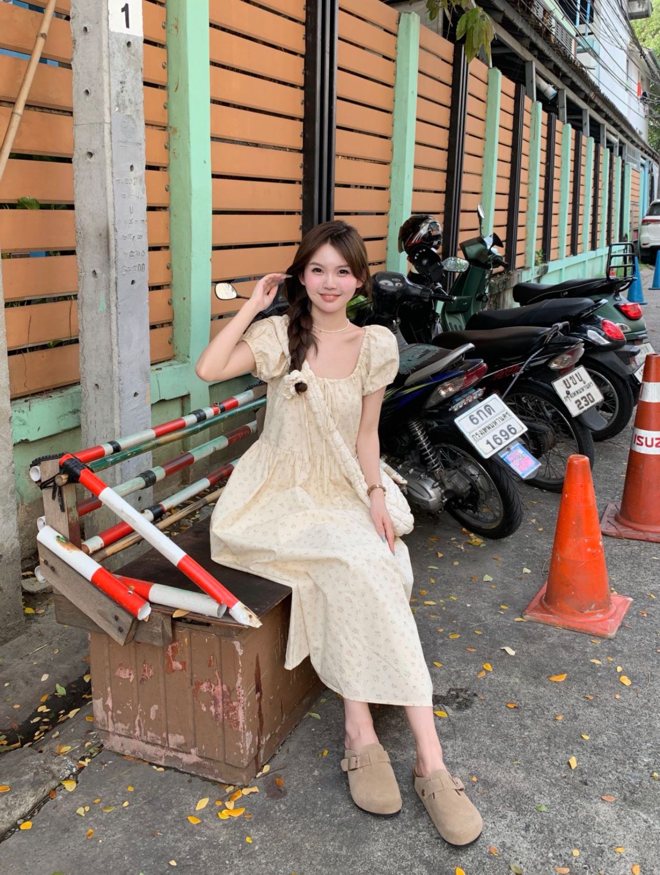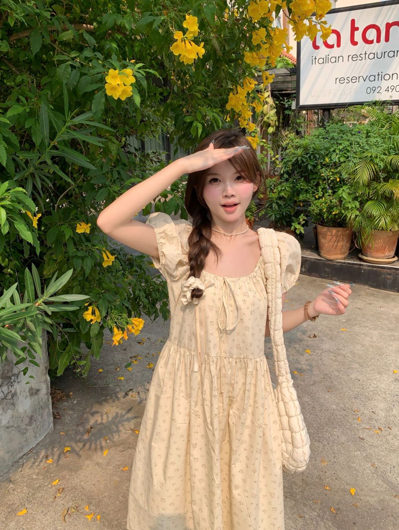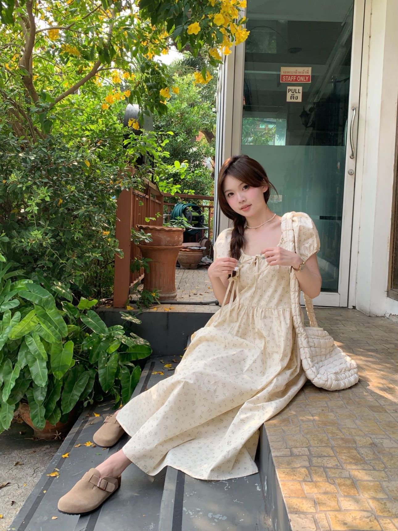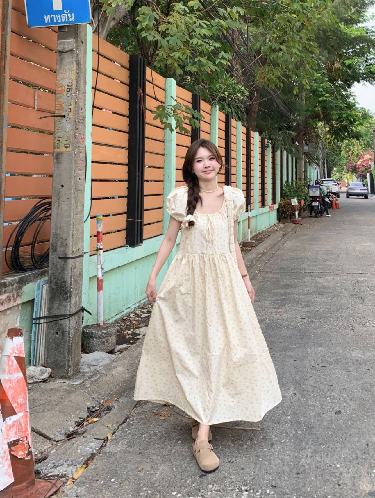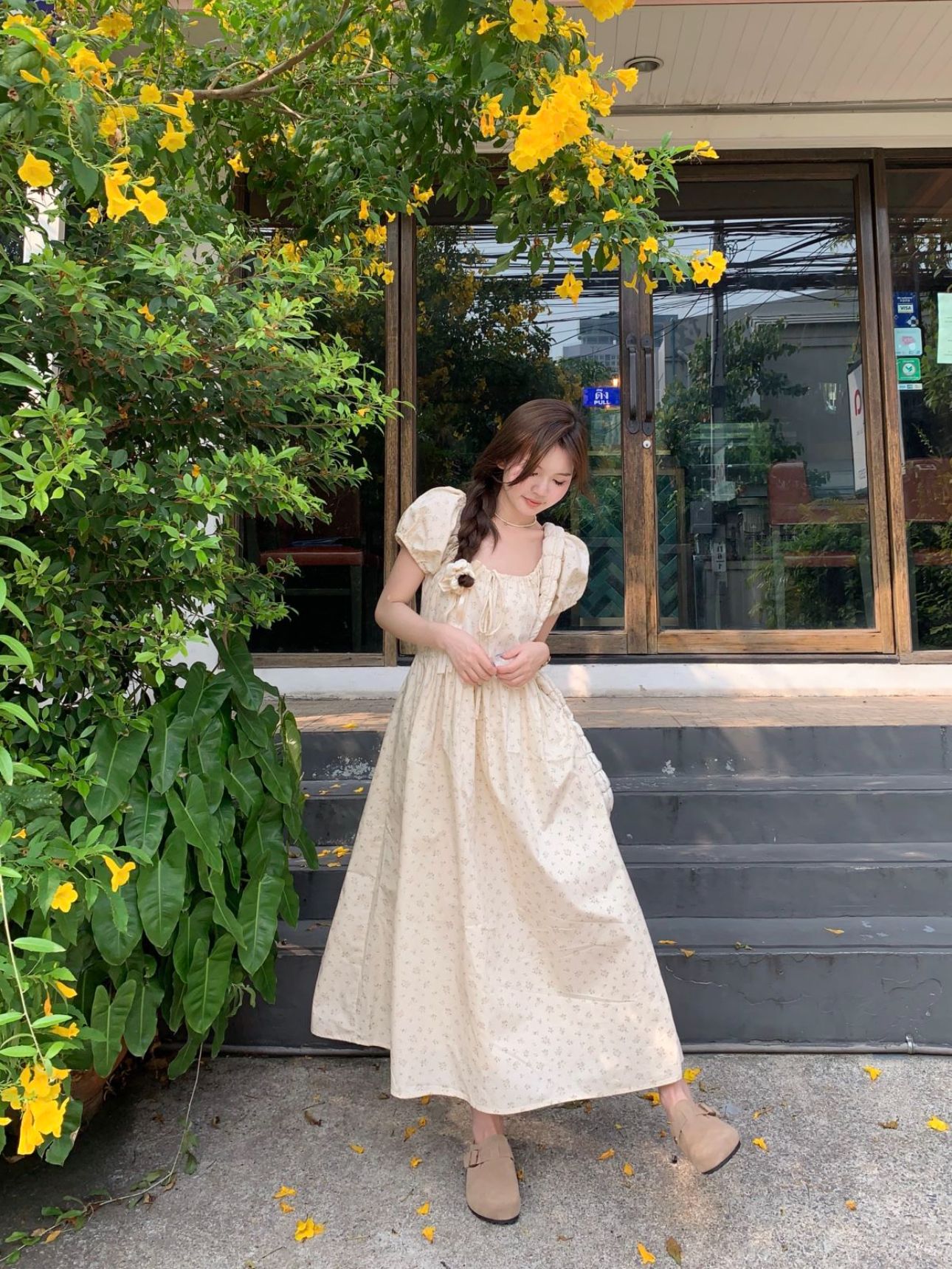 미니멀리즘 꽃무늬 작은 청신 거품 소매 여성 드레스 여름 2025 새로운 허리 수축 한 마디 슬림해 보이는 레이스업 롱 스커트