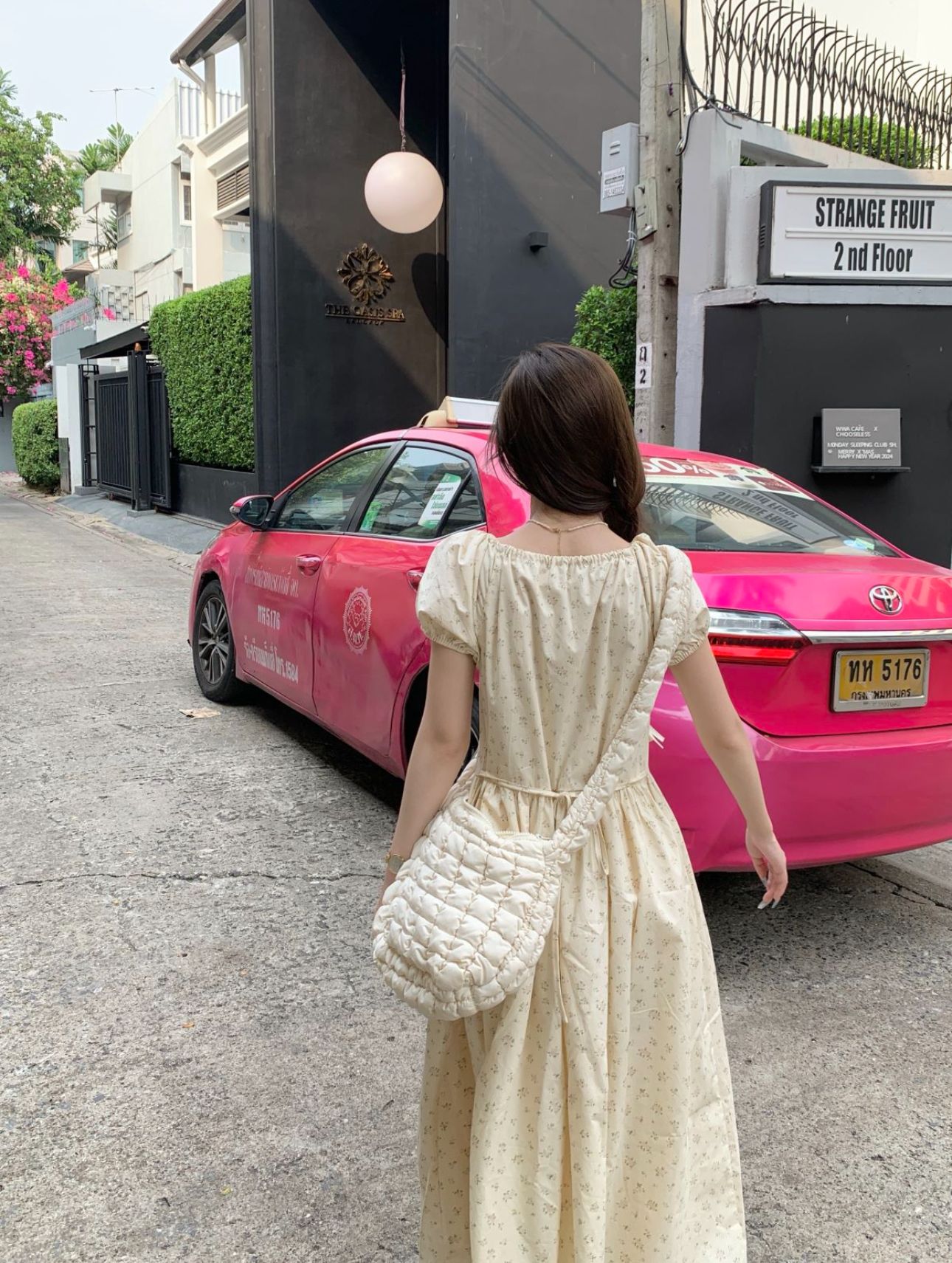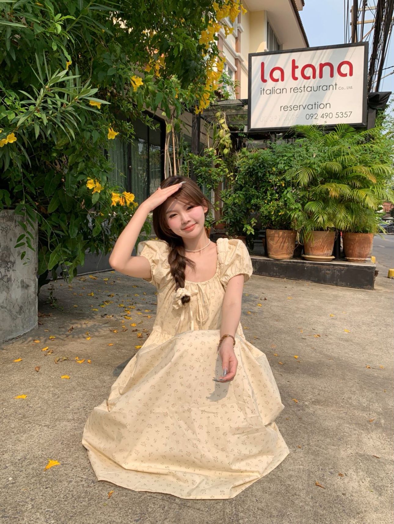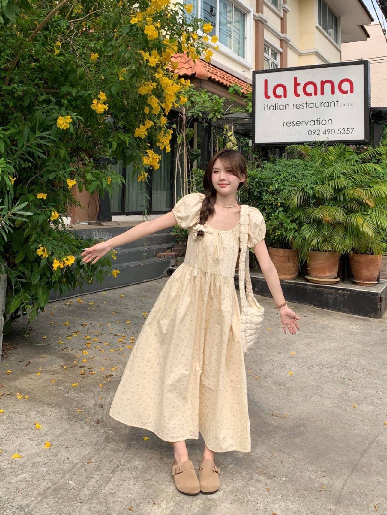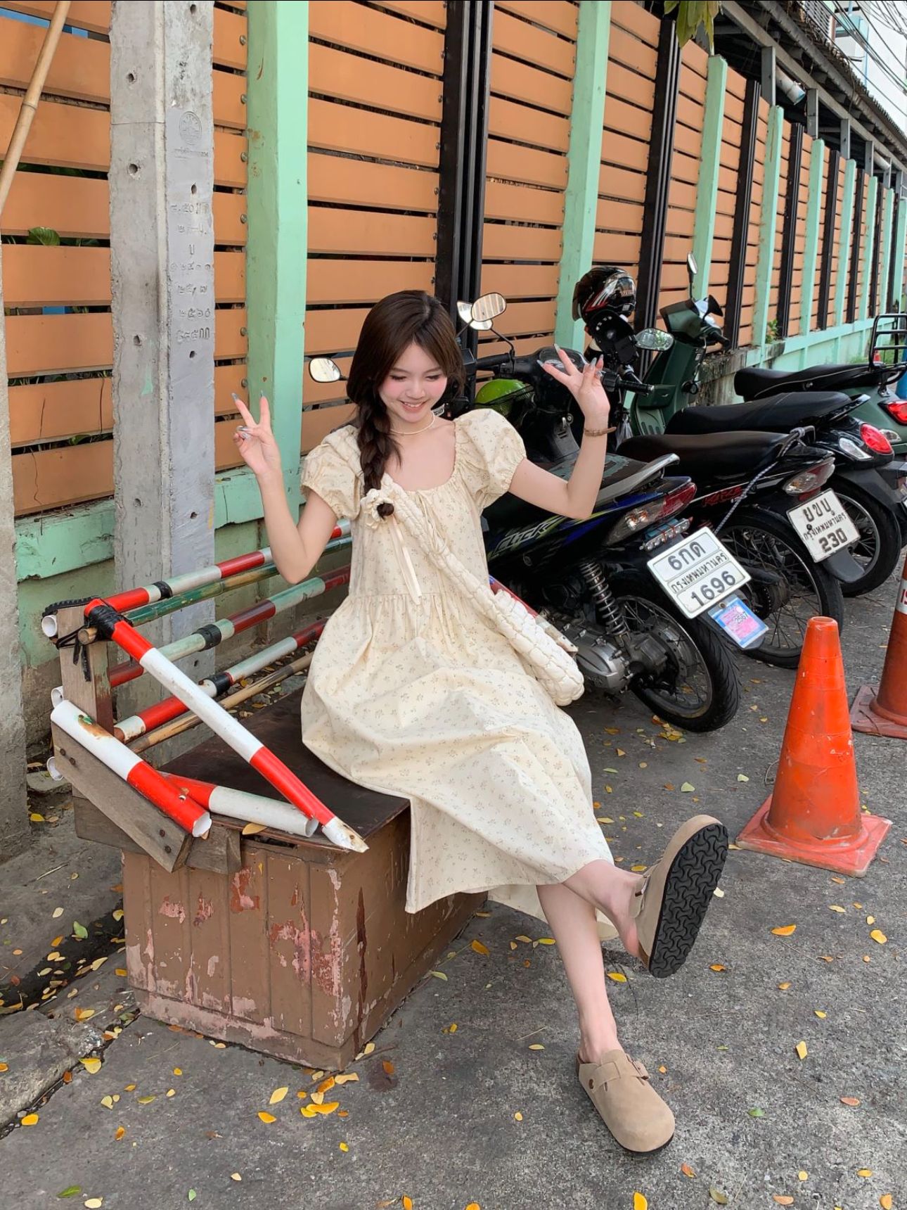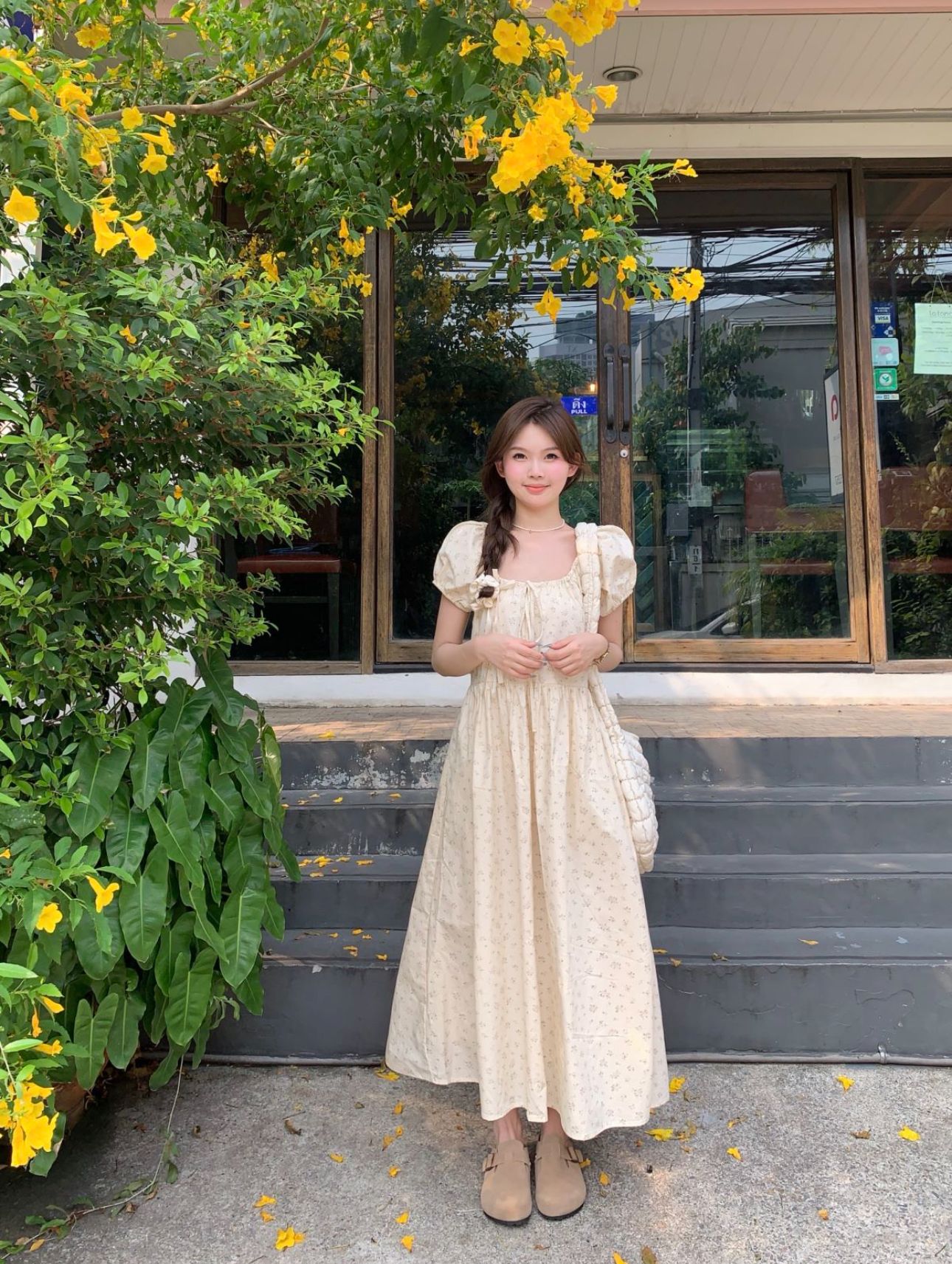 미니멀리즘 꽃무늬 작은 청신 거품 소매 여성 드레스 여름 2025 새로운 허리 수축 한 마디 슬림해 보이는 레이스업 롱 스커트