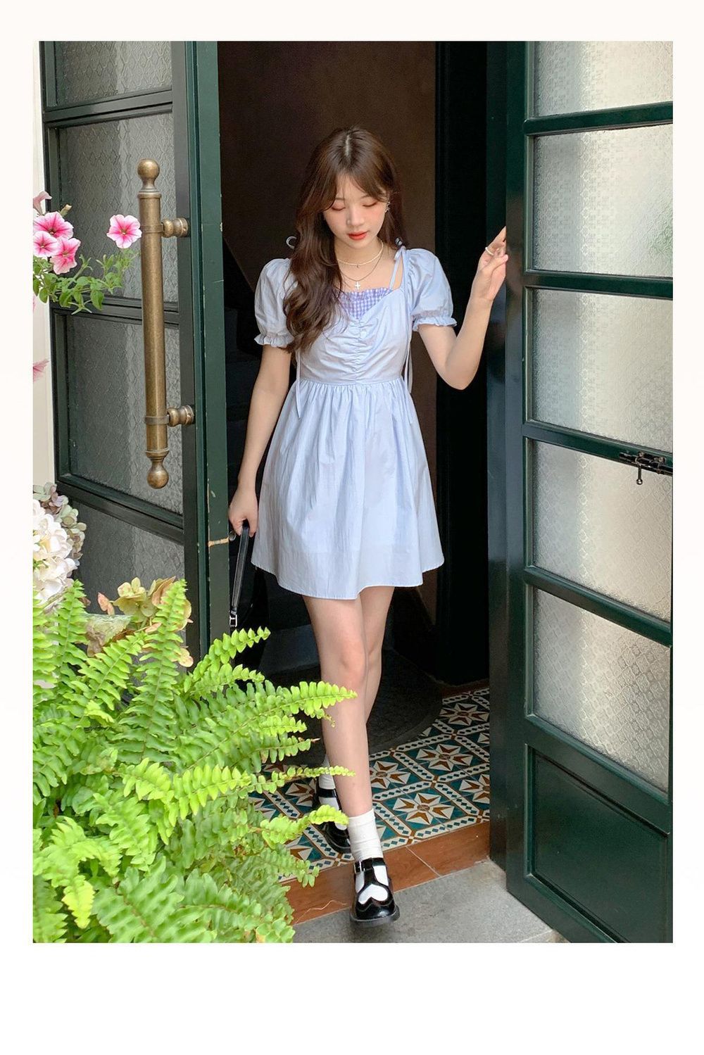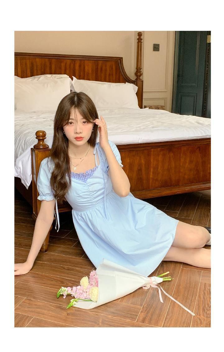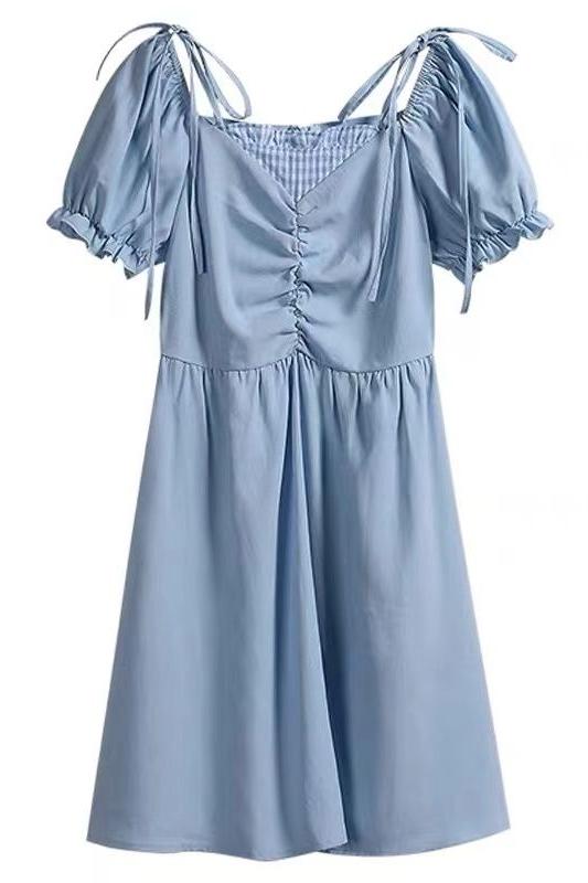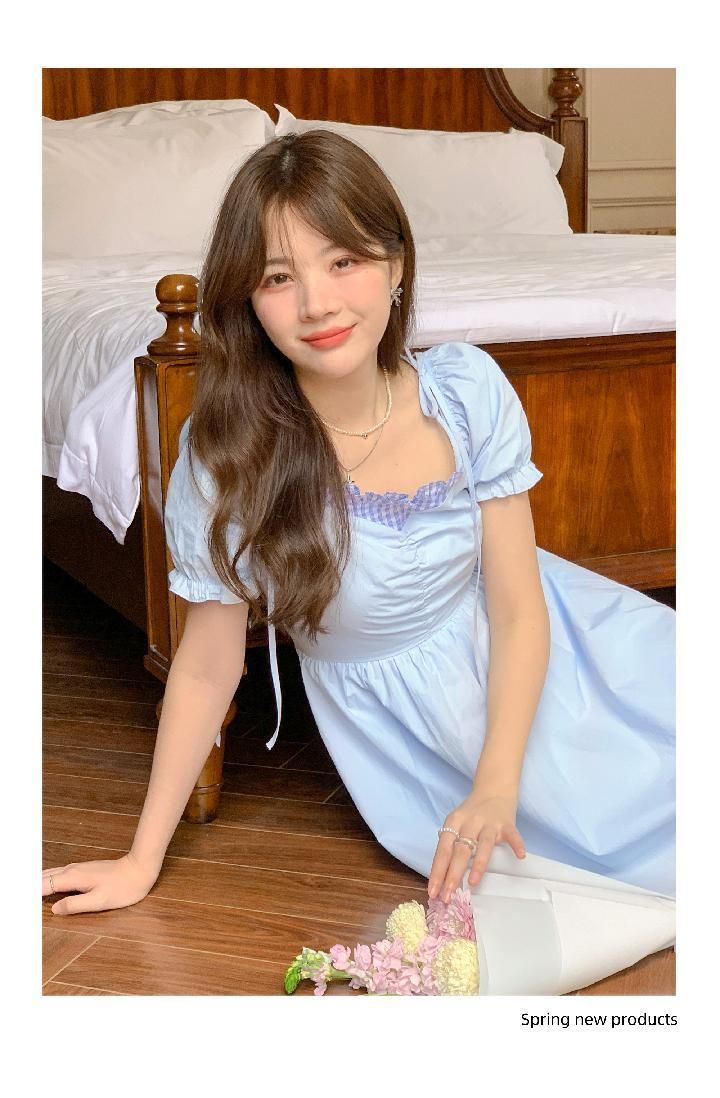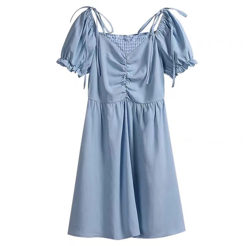 미니멀리즘 꽃무늬 작은 청신 거품 소매 여성 드레스 여름 2025 새로운 허리 수축 한 마디 슬림해 보이는 레이스업 롱 스커트