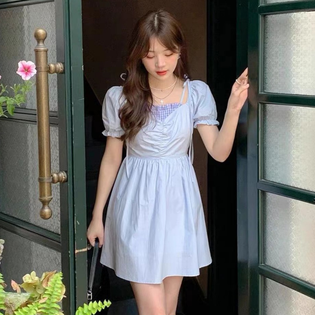 2026 새로운 페이크 레이어드 스트랩 나비 매듭 여성 드레스 봄 달콤한 미국 칼라 허리 수축 슬림해 보이는 숙녀 치마