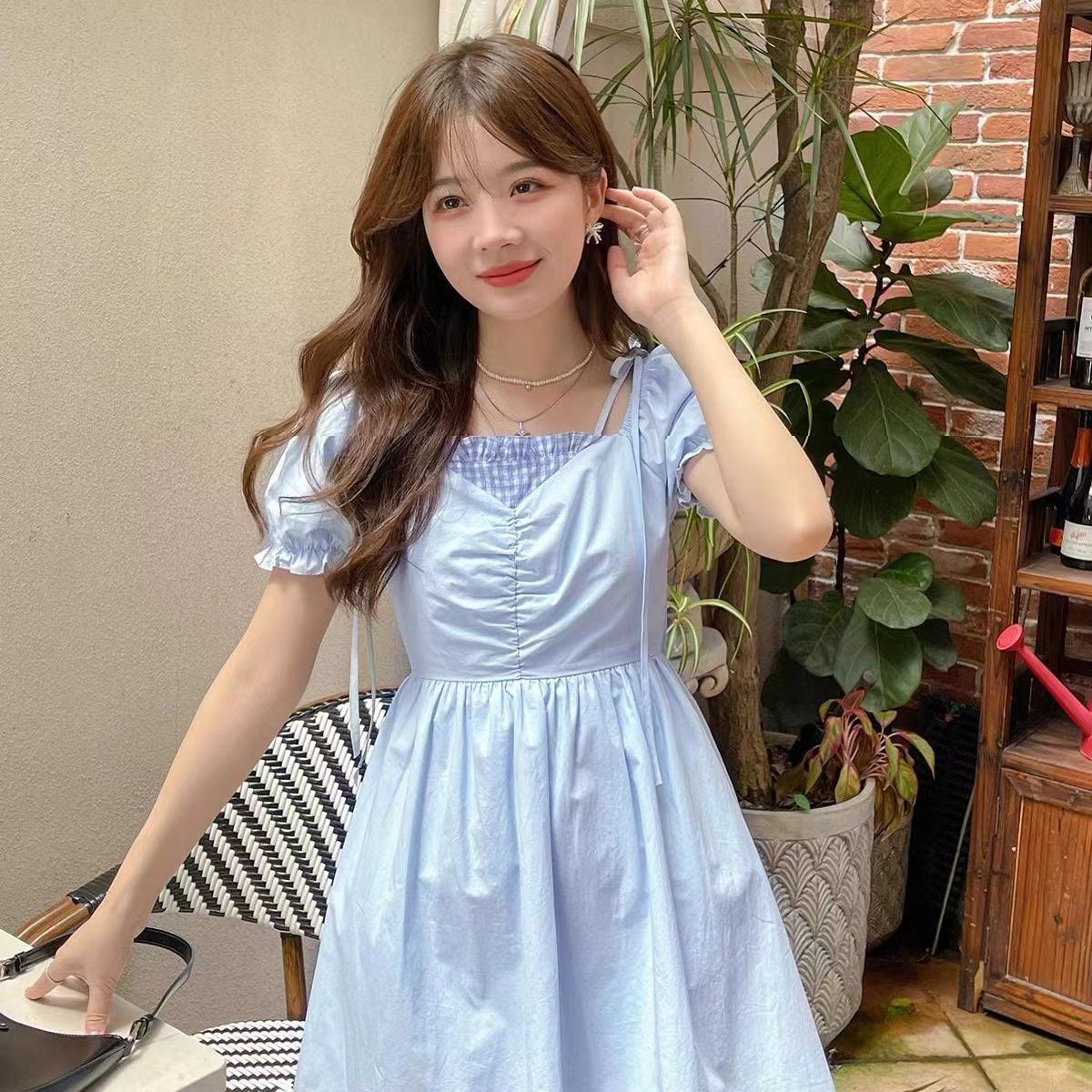 작은 대중 디자인 센스 둘 착용 파란색 체크무늬 반신 스커트 여성 여름 프랑스식 품격 튜브탑 조끼 스커트 한 마디 우산 치마