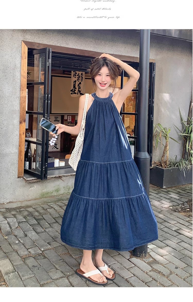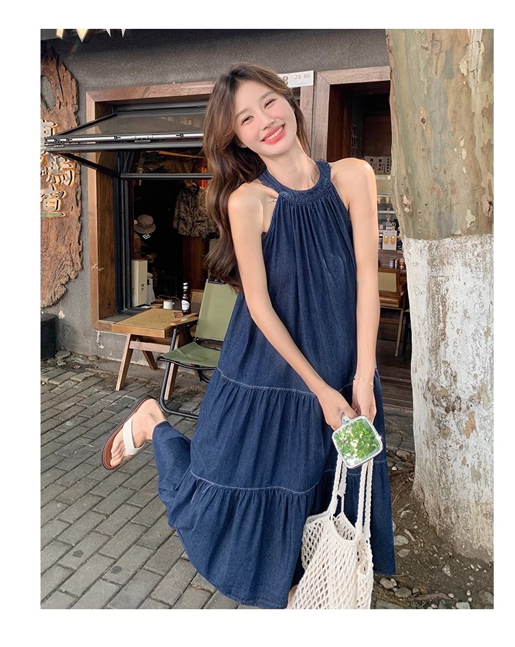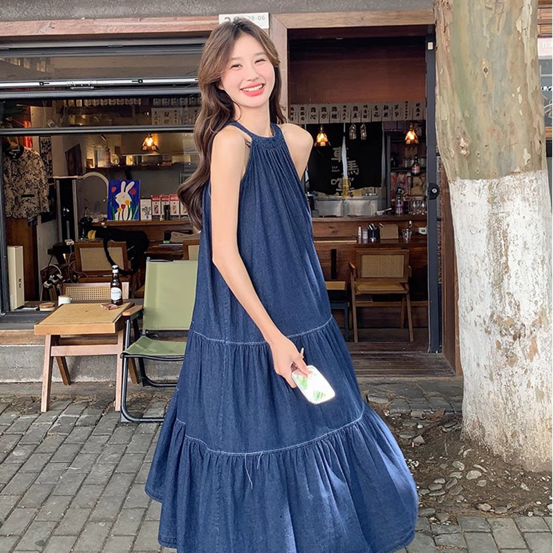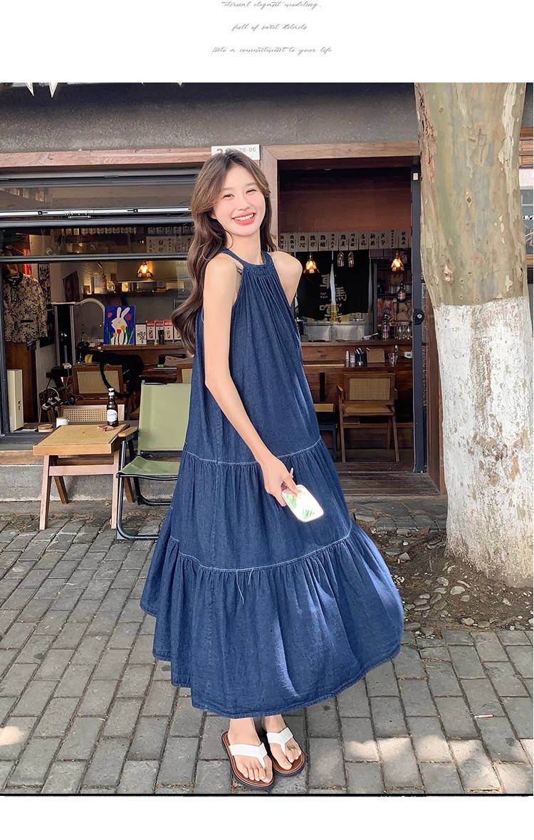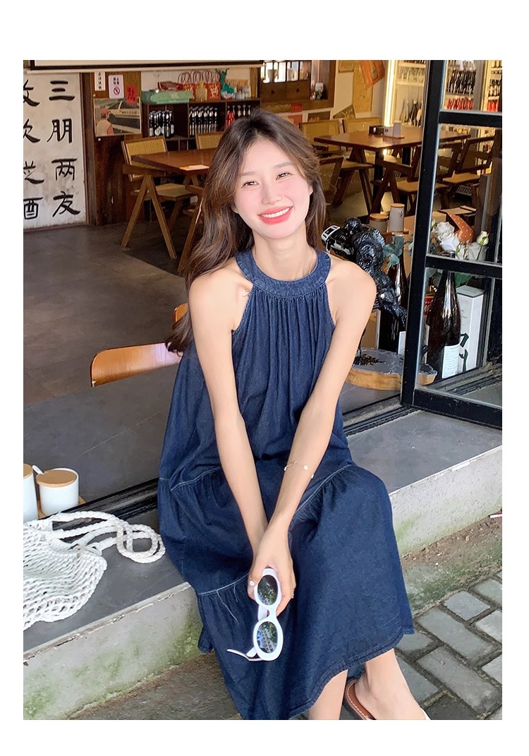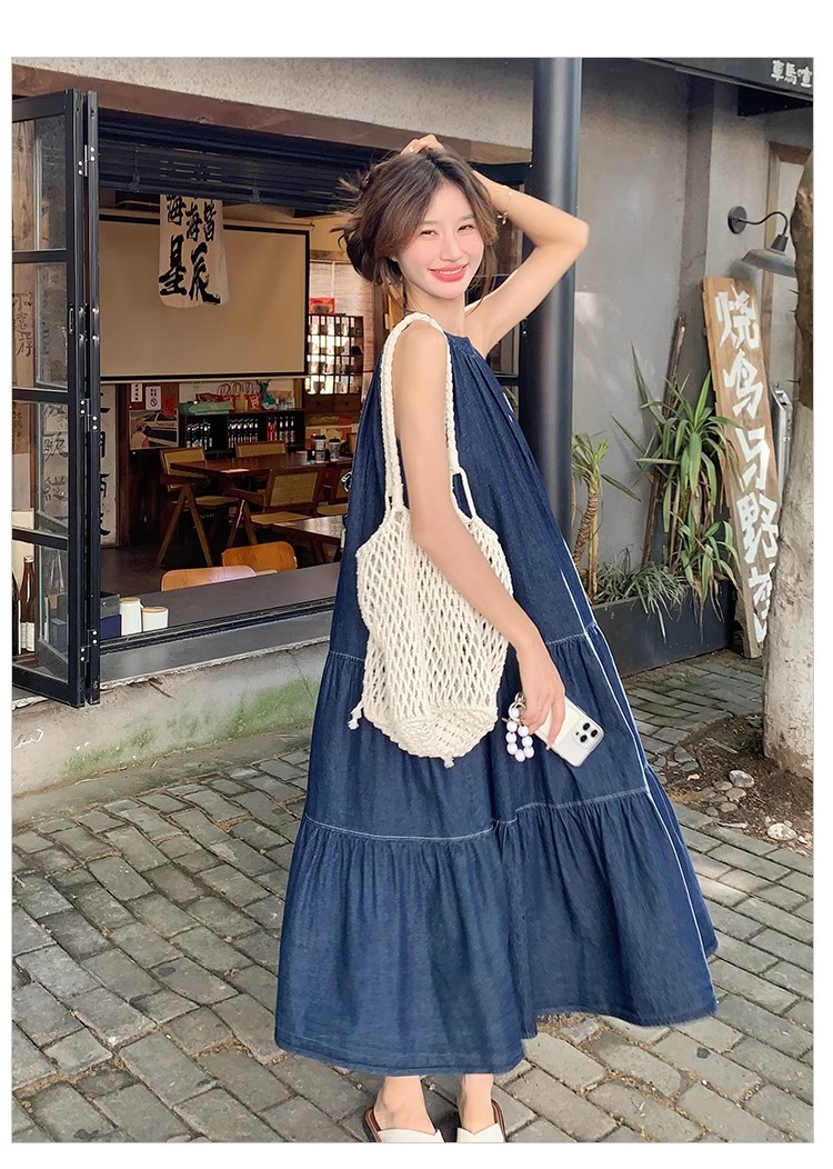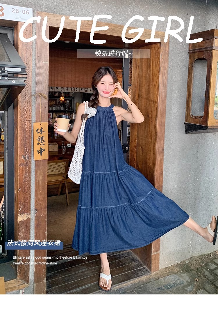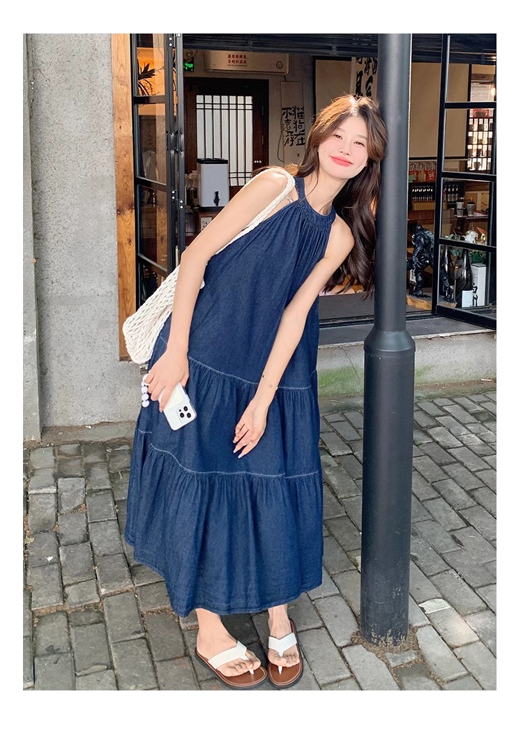 파란색 민소매 행침 목 여성 드레스 중간 길이 2025 여름 새로운 데님 레트로 미니멀리즘 디자인 센스 조끼 스커트