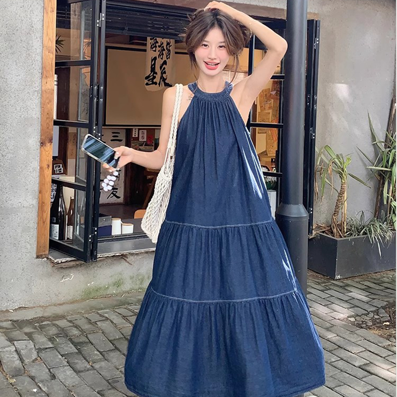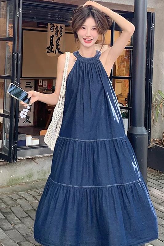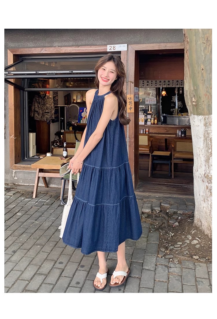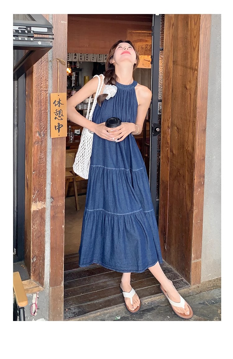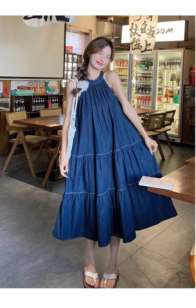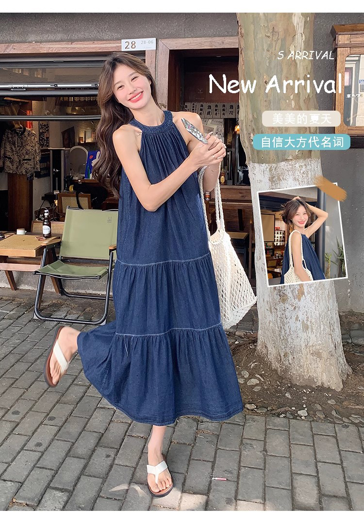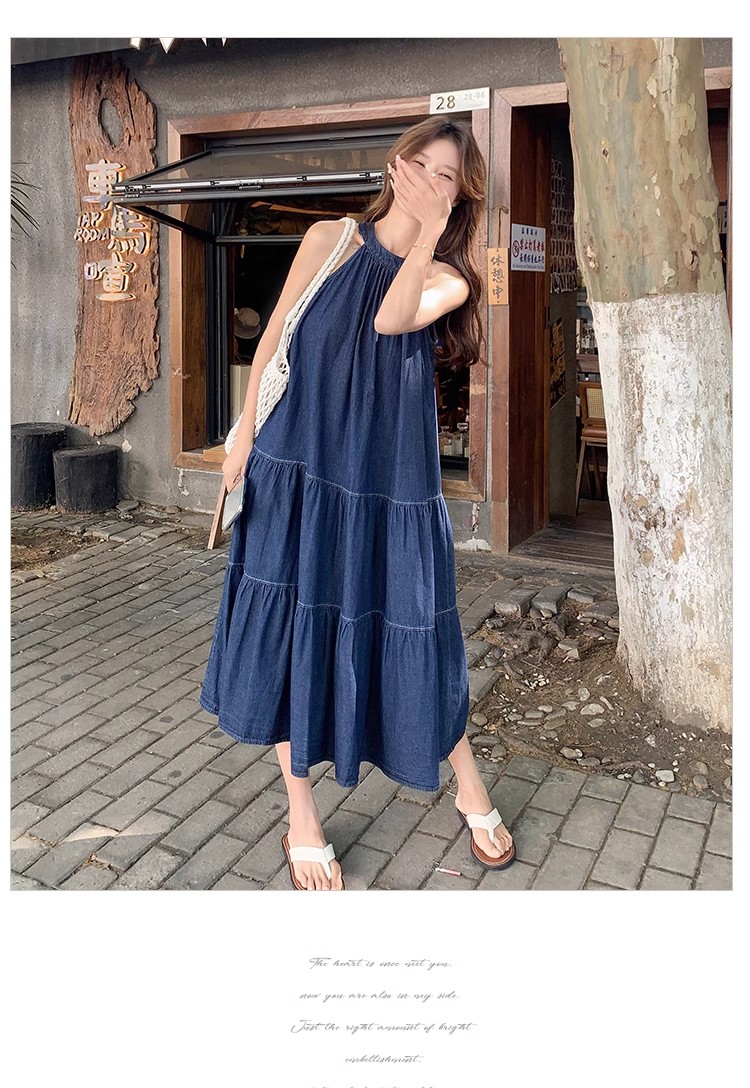 파란색 민소매 행침 목 여성 드레스 중간 길이 2025 여름 새로운 데님 레트로 미니멀리즘 디자인 센스 조끼 스커트