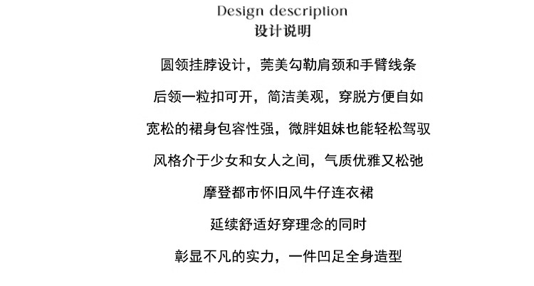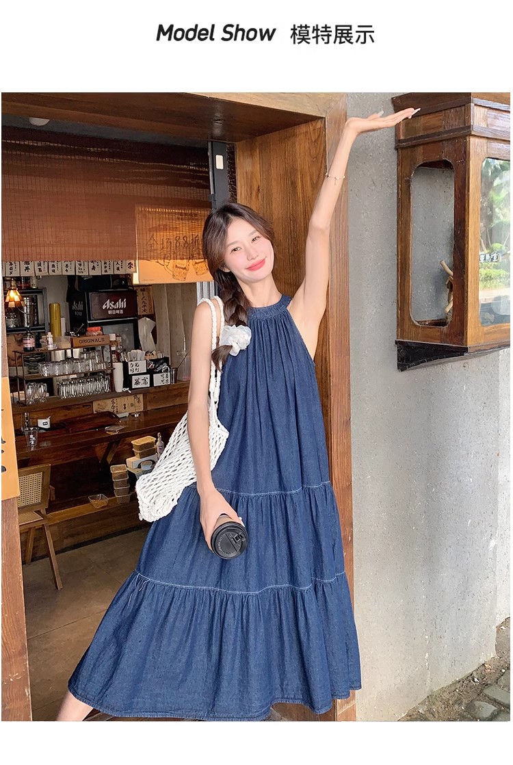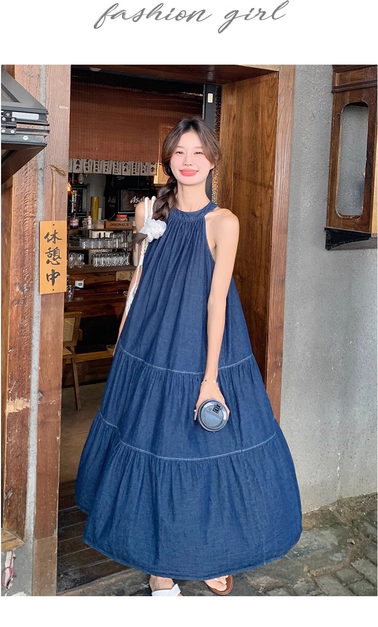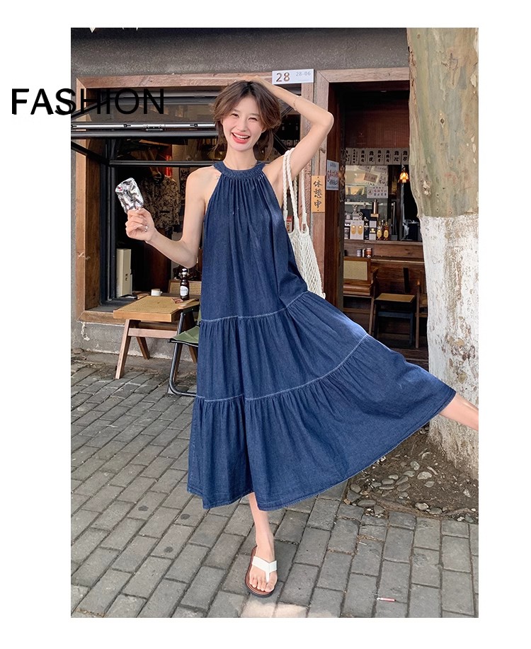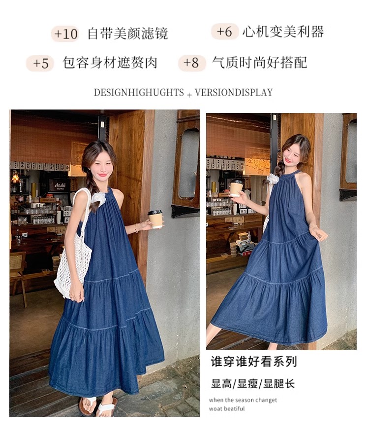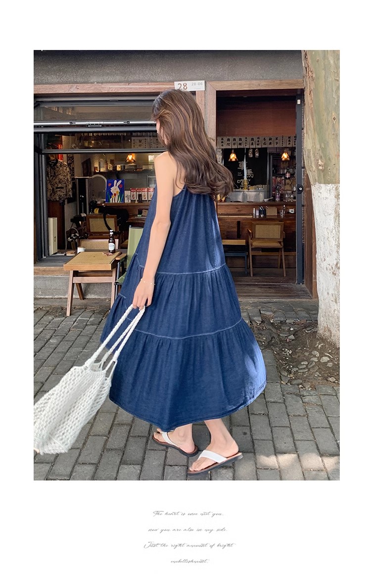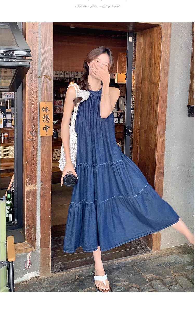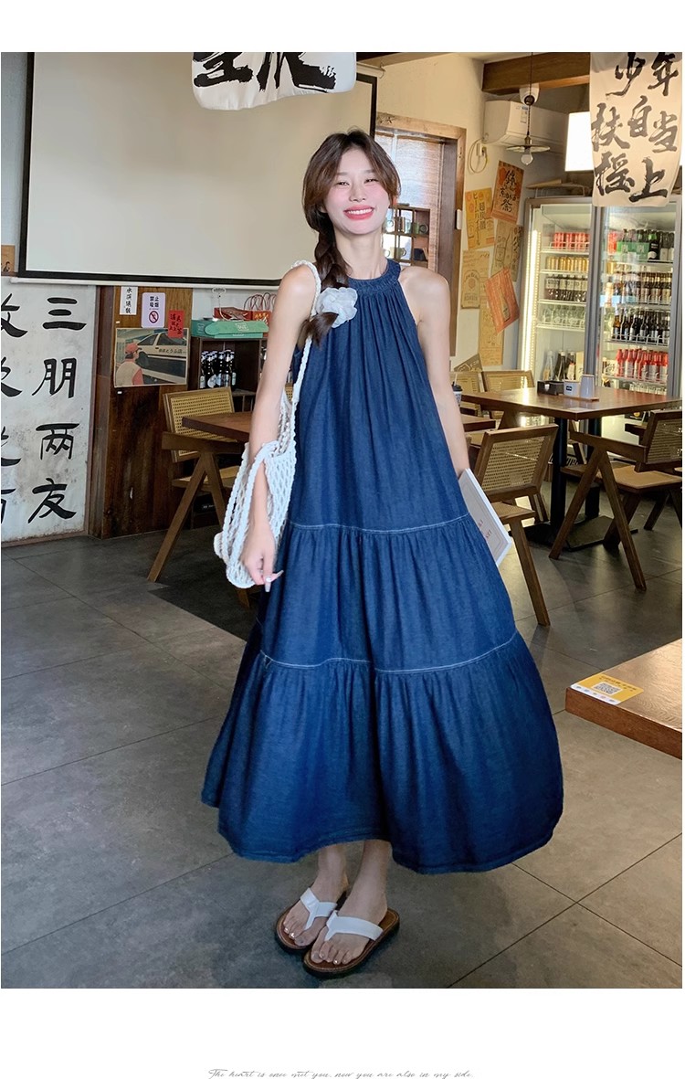 파란색 민소매 행침 목 여성 드레스 중간 길이 2025 여름 새로운 데님 레트로 미니멀리즘 디자인 센스 조끼 스커트