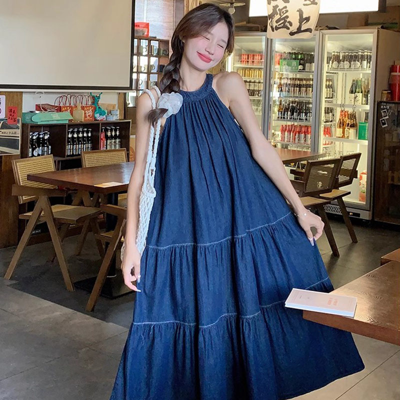 여름 프랑스식 부드러운 바람 행침 목 스타일 플리츠 조끼 여성 드레스 품격 민소매 헤일로 염색 휴가 바람 길다 치마