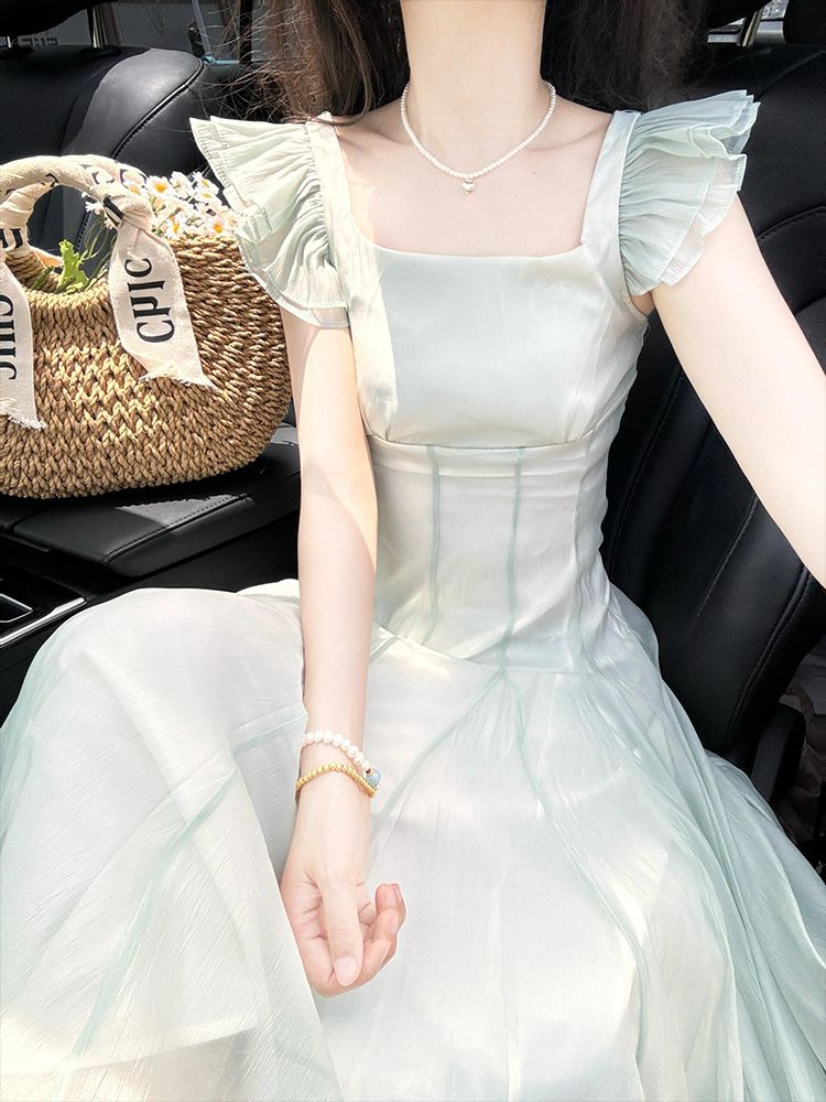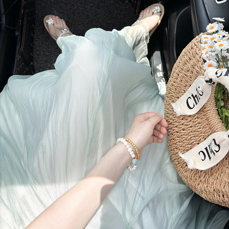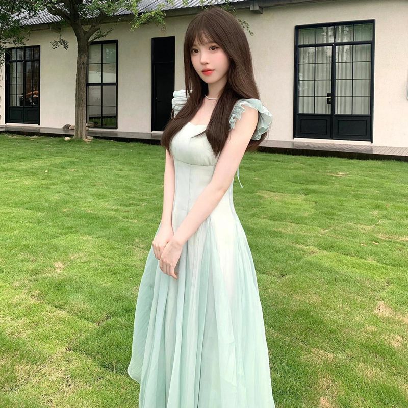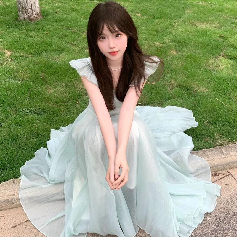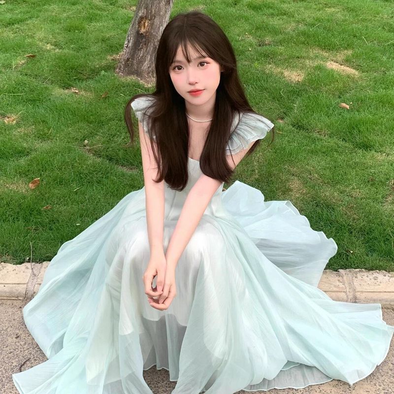 여름 프랑스식 부드러운 바람 행침 목 스타일 플리츠 조끼 여성 드레스 품격 민소매 헤일로 염색 휴가 바람 길다 치마