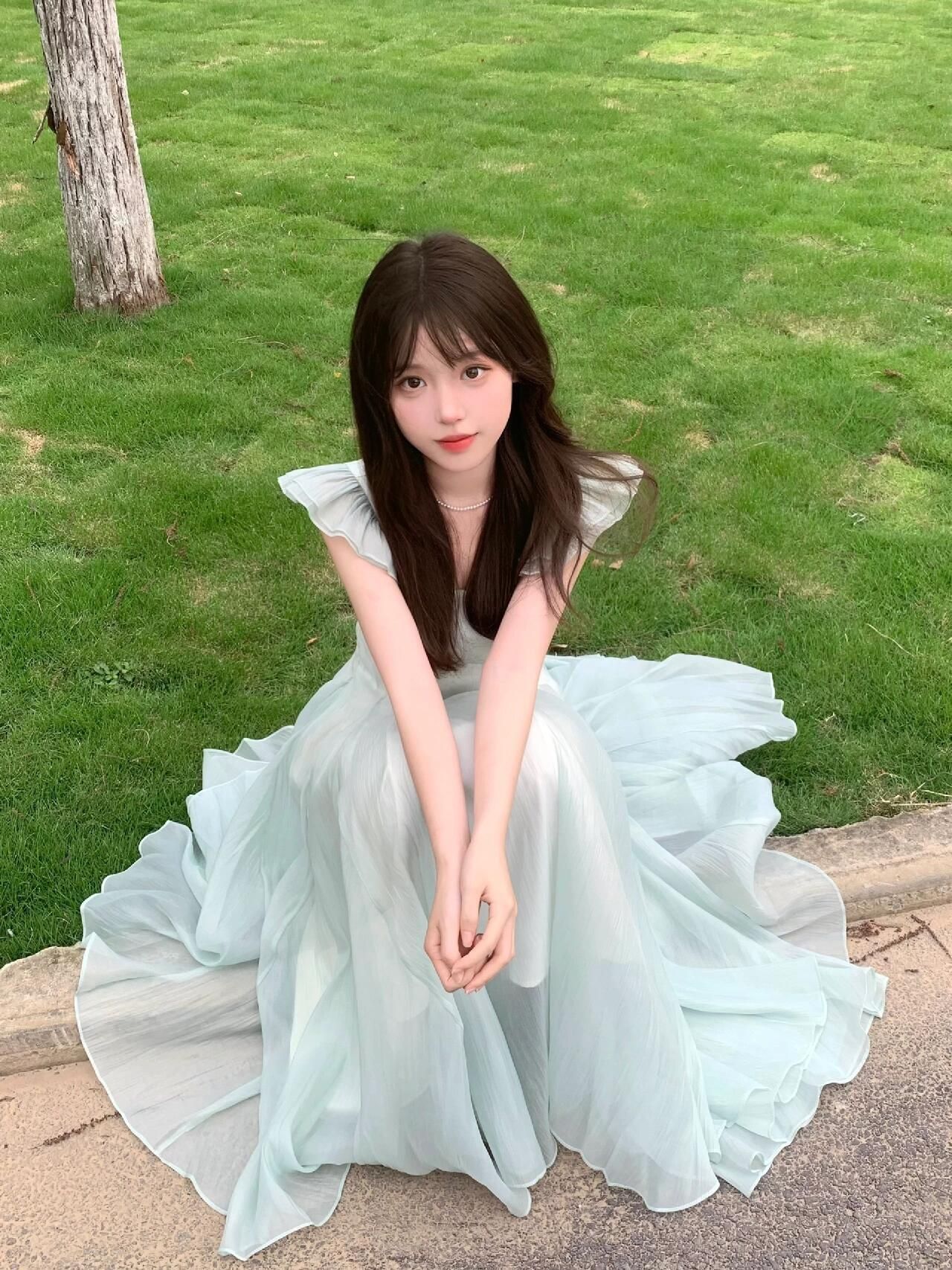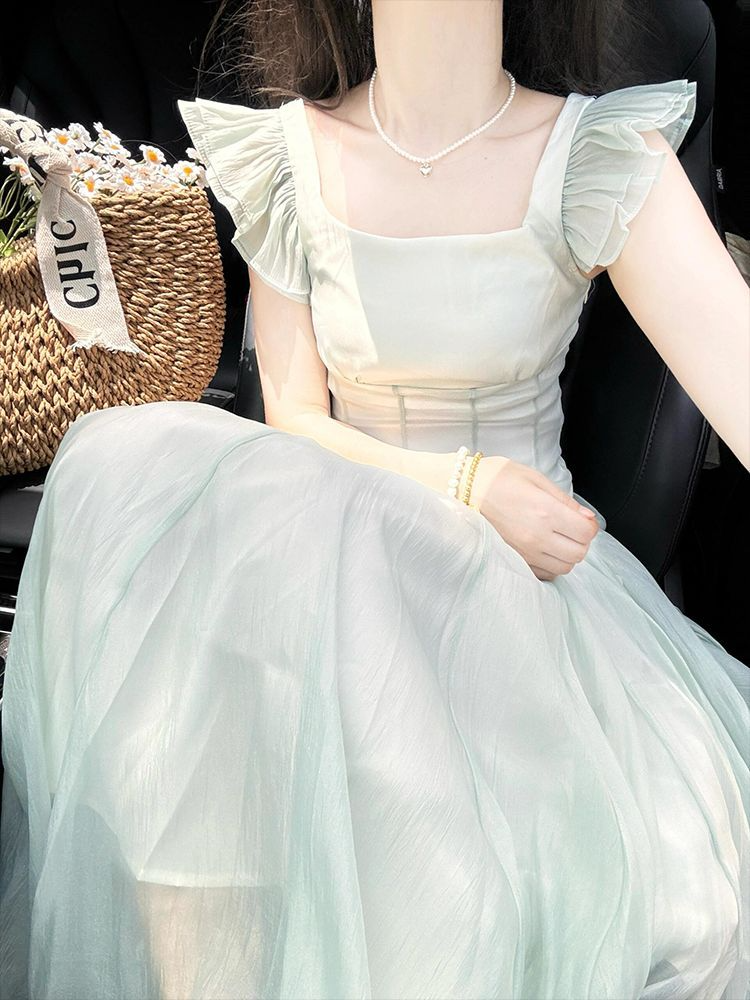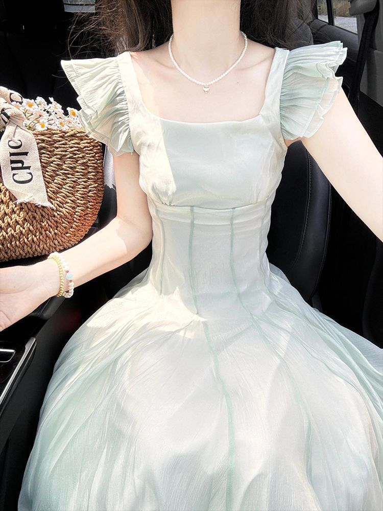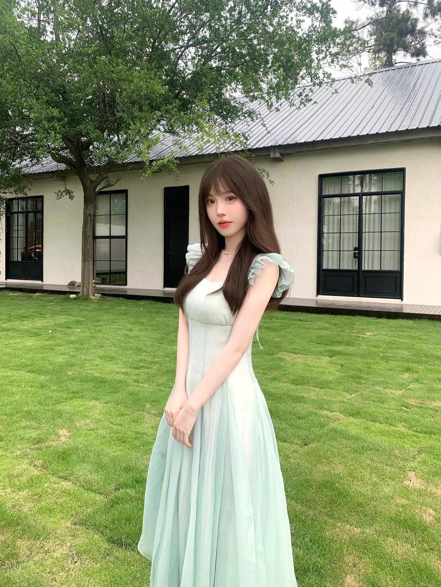 여름 프랑스식 부드러운 바람 행침 목 스타일 플리츠 조끼 여성 드레스 품격 민소매 헤일로 염색 휴가 바람 길다 치마