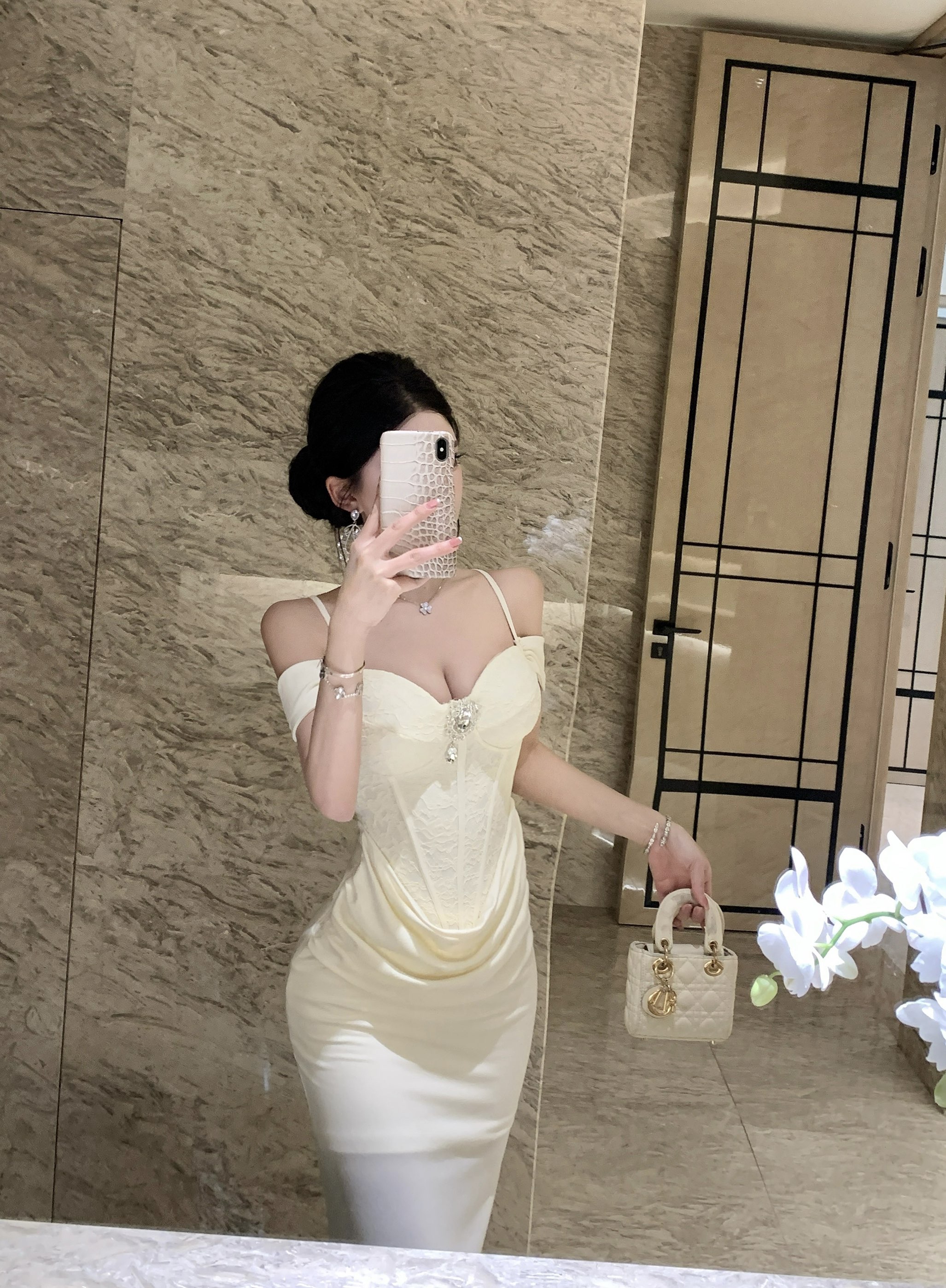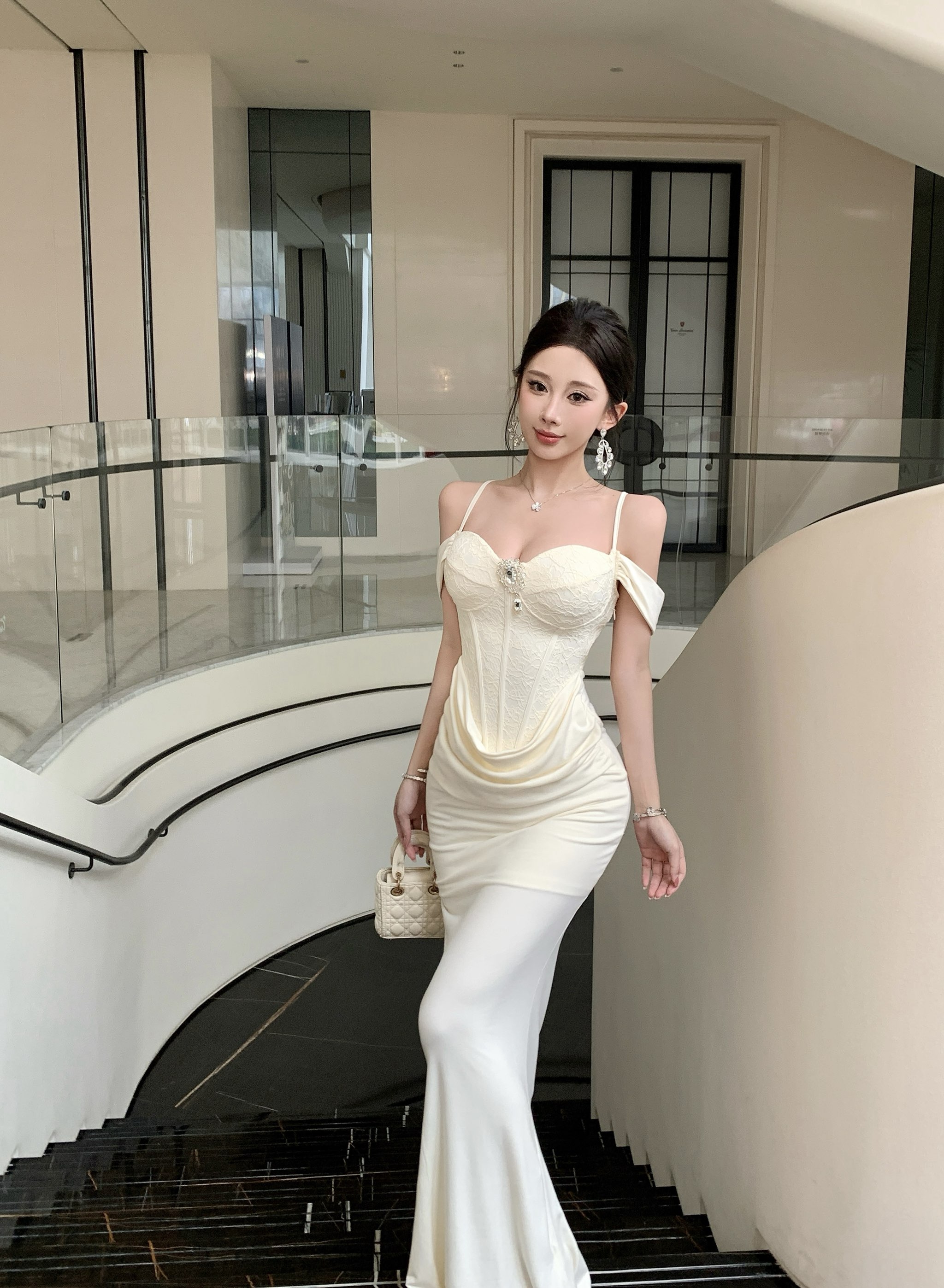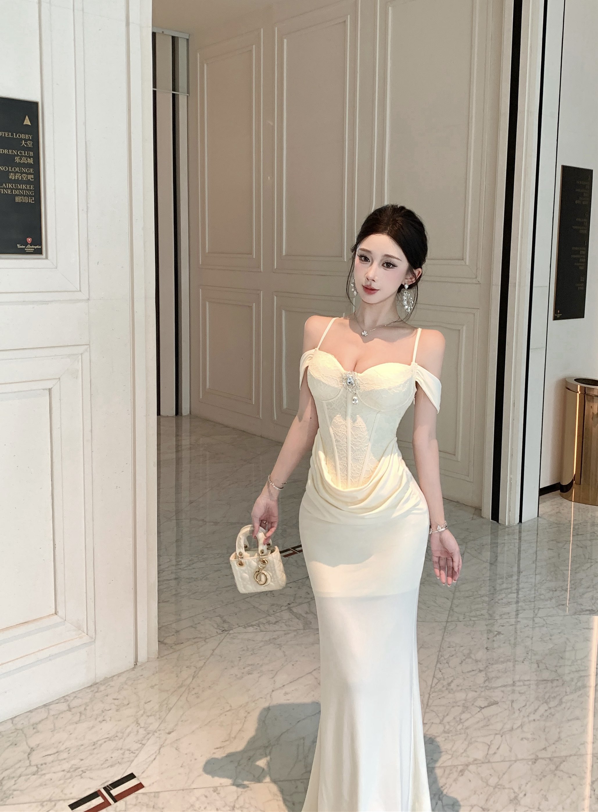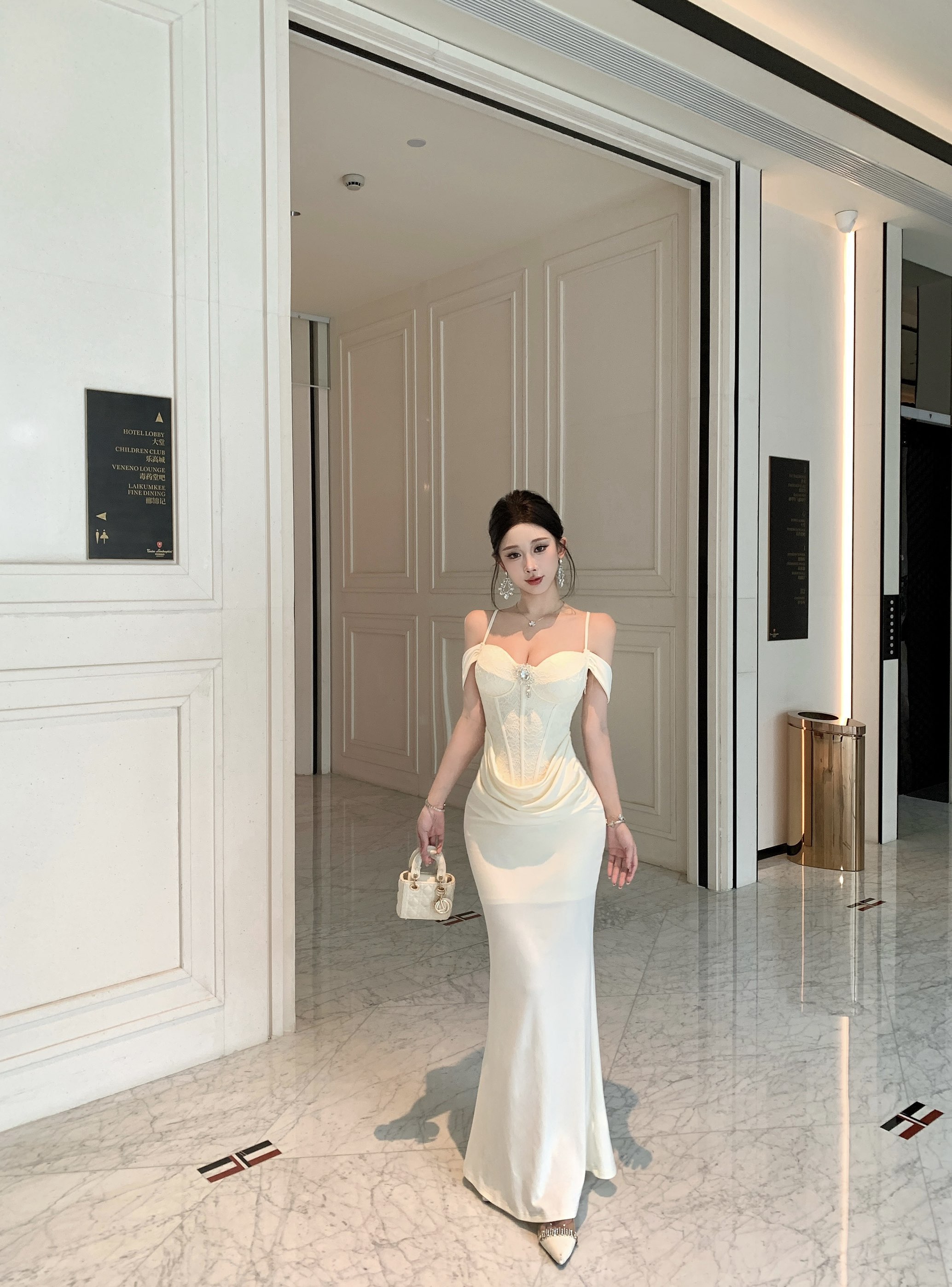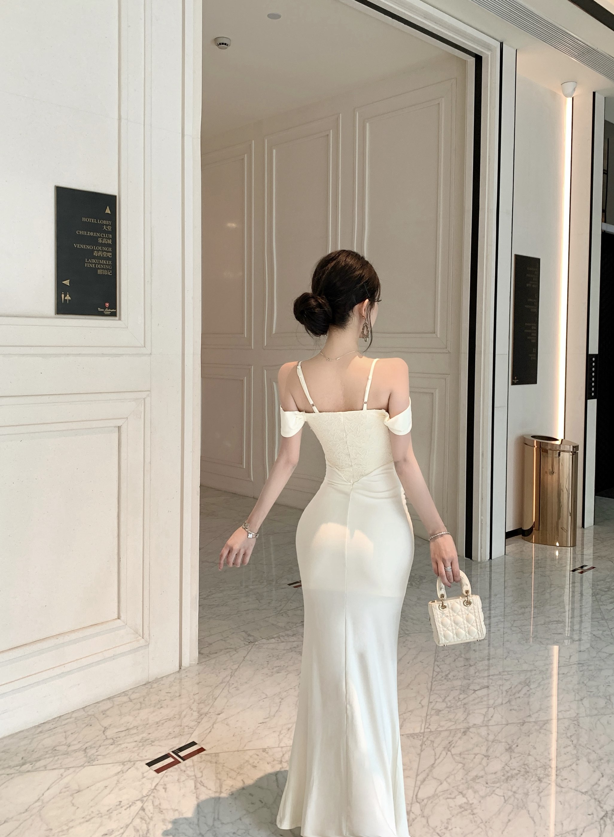 실사 정가 고급 센스 오프숄더 패치워크 예복 치마 드레스