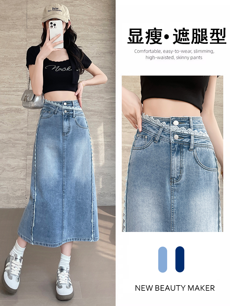 실사 레이스 데님 반신 스커트 여성 여름 2026 년 새로운 한국 스타일 하이웨이스트 슬림해 보이는 디자인 센스 중간 길이 치마