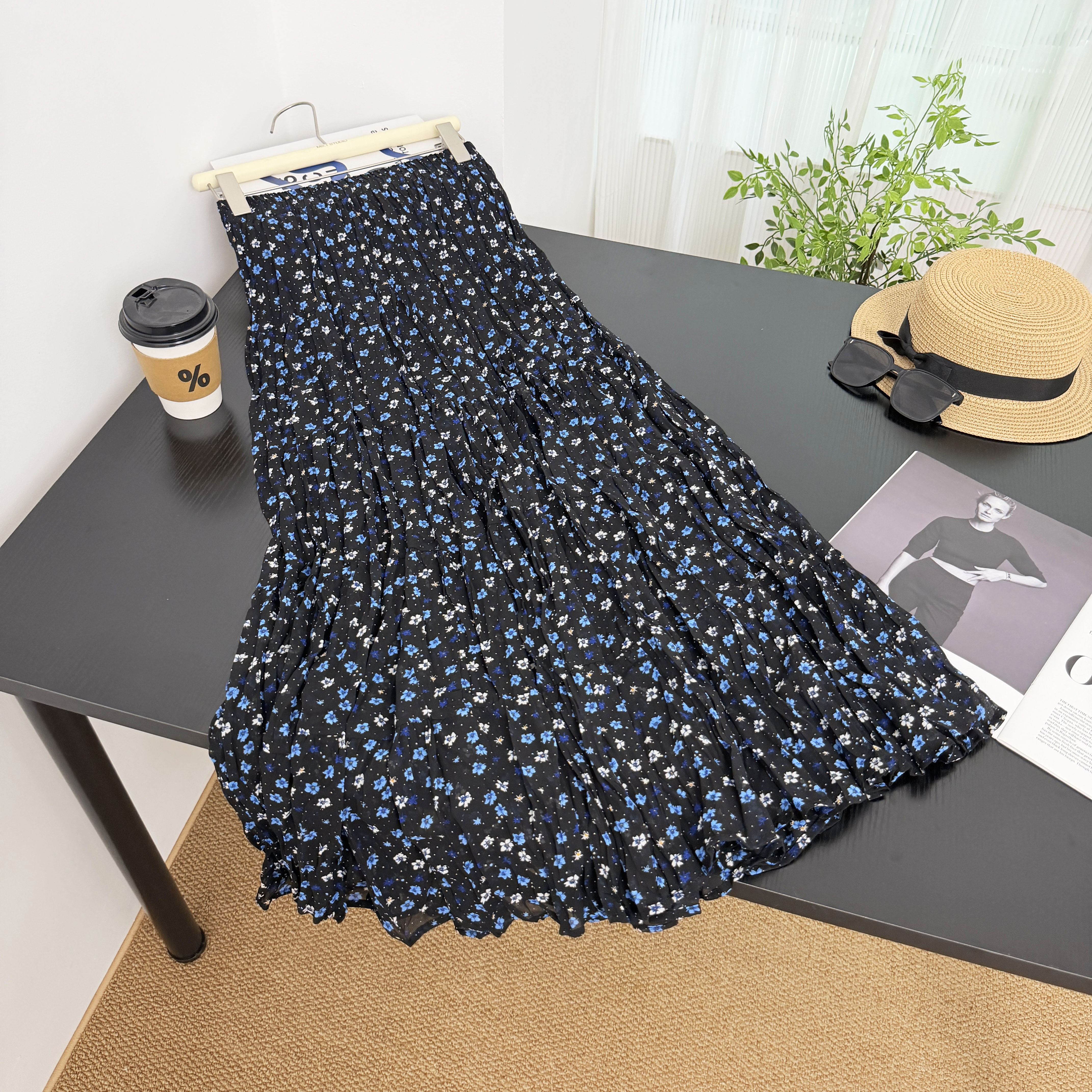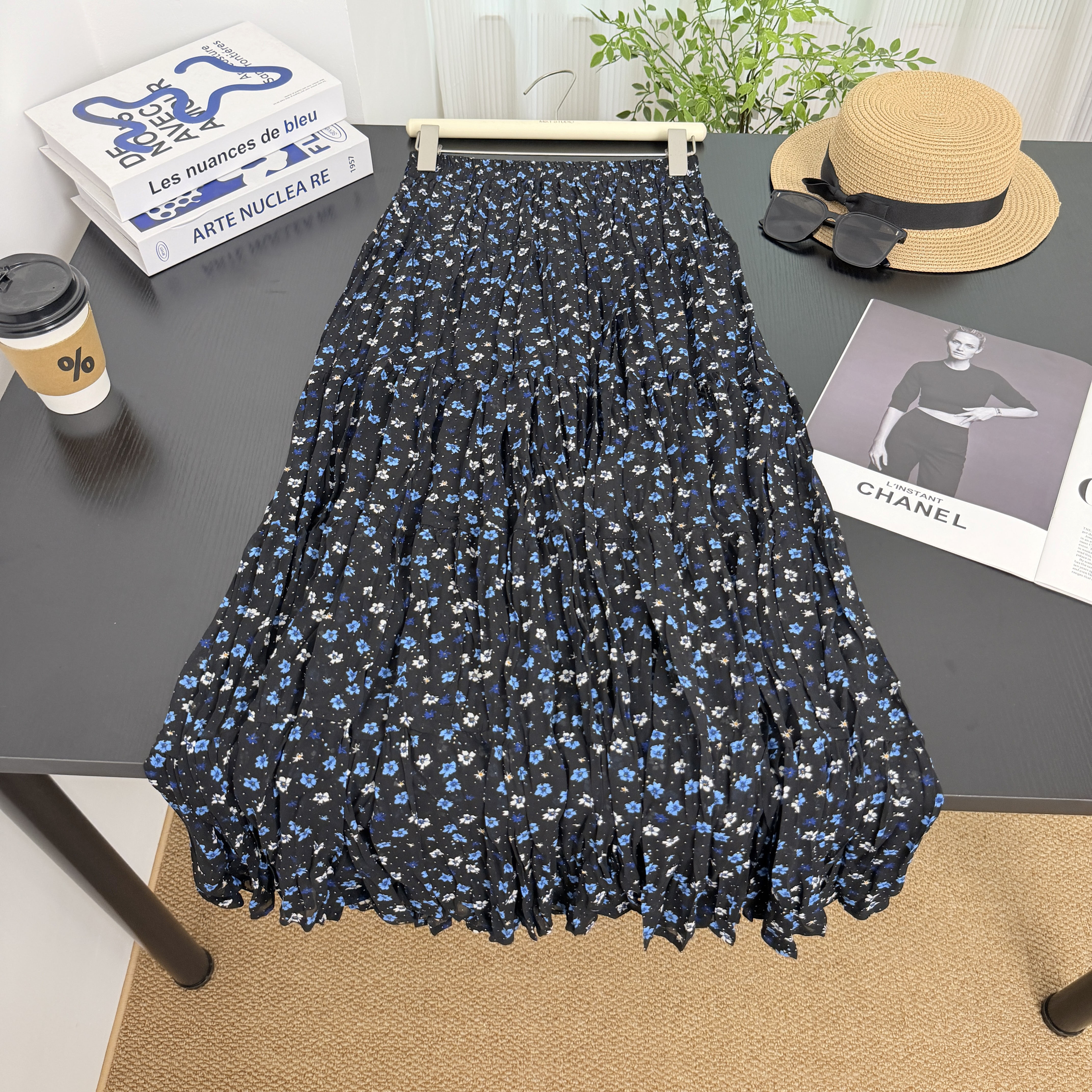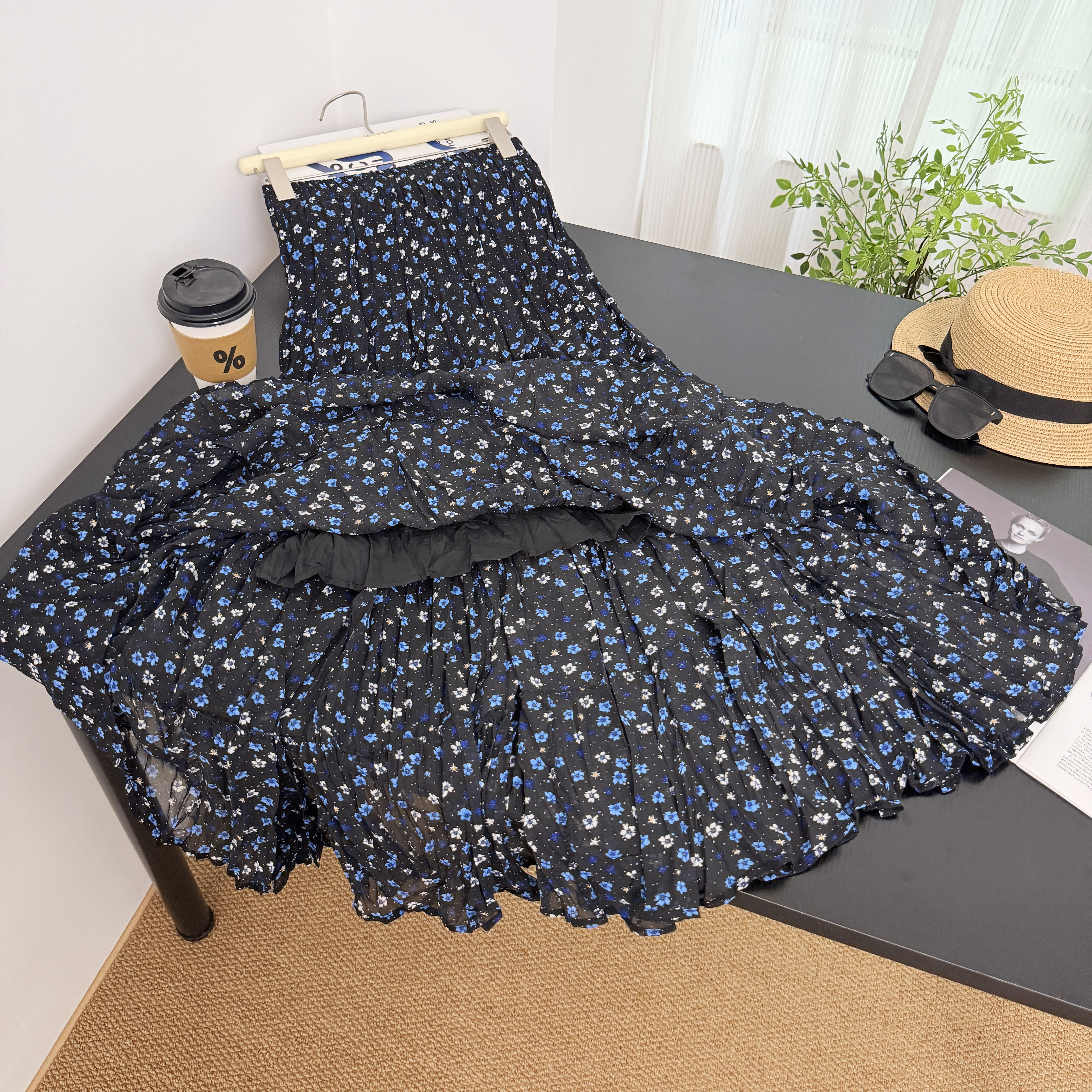 휴가 바람 프린트 쉬폰 주름 반신 스커트 여성 허리밴드 불규칙 빅 플레어 스커트 슬림해 보이는 연령 감소 꽃무늬 롱 스커트