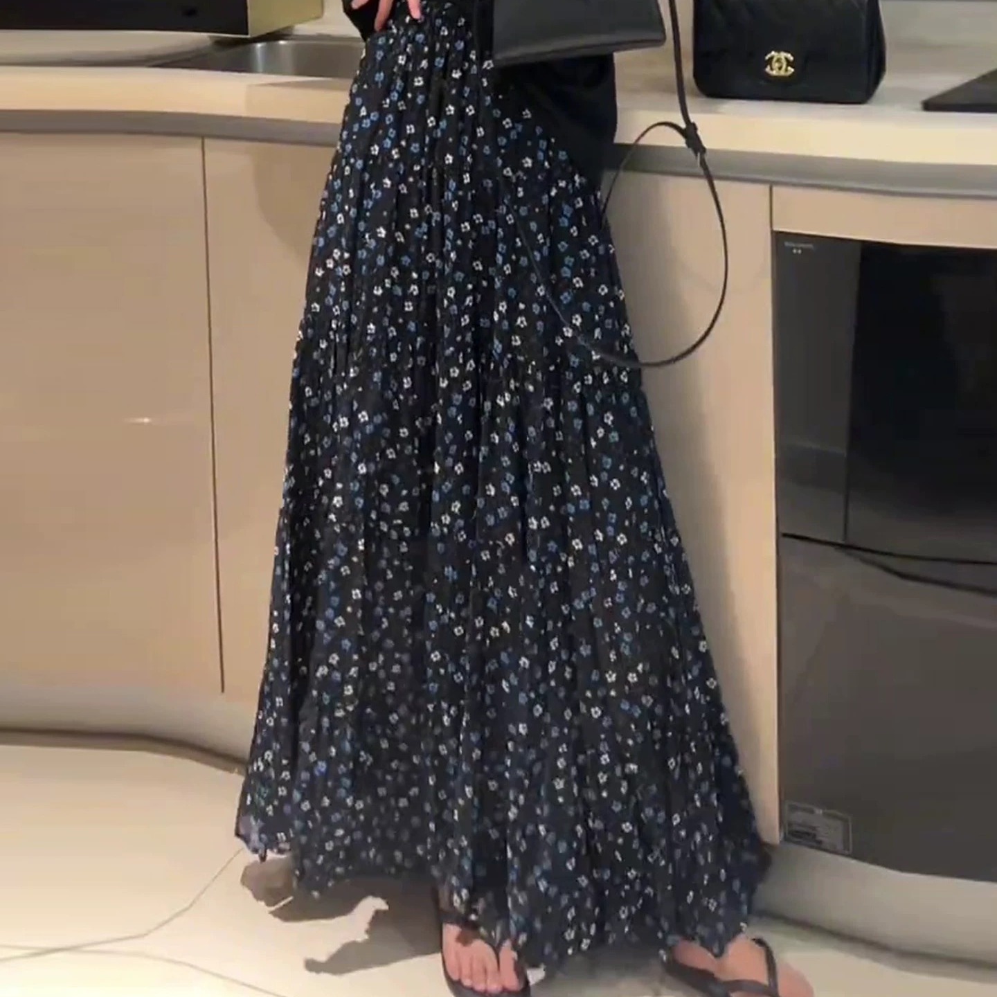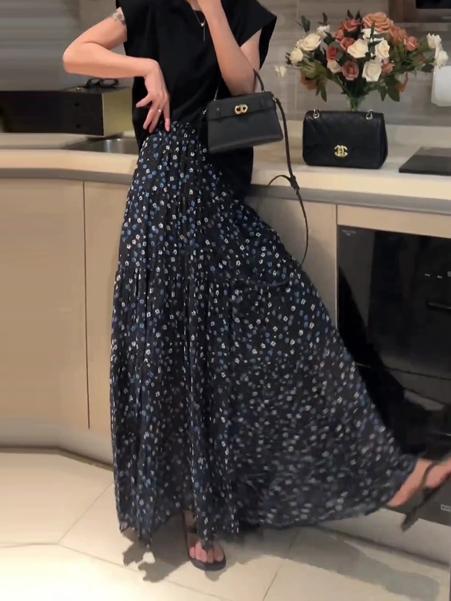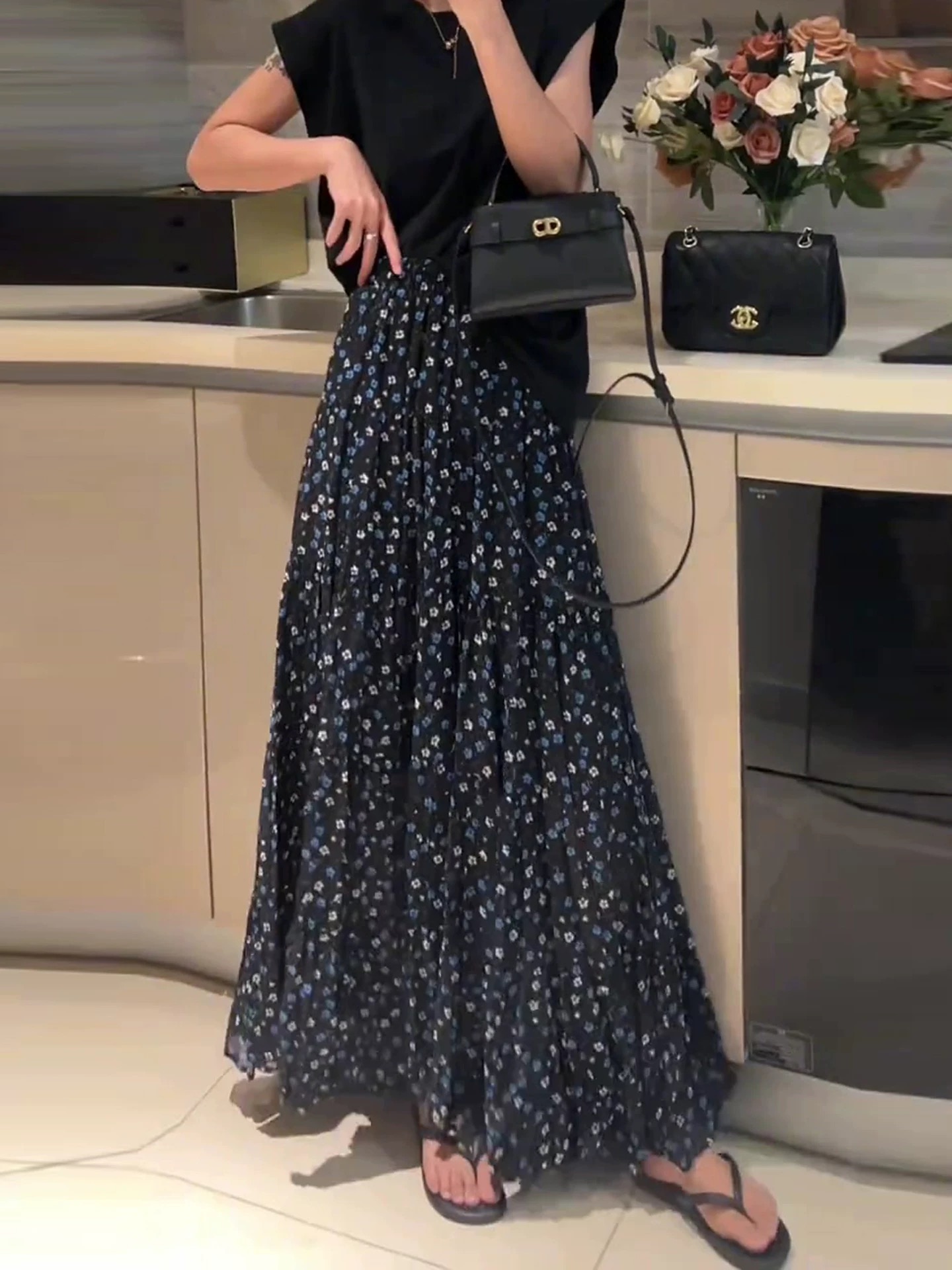 부드러운 바람 꽃무늬 쉬폰 반신 스커트 여성 2026 여름 새로운 다용도 도루 센스 큰 진자 롱 스커트 하이웨이스트 A라인 스커트