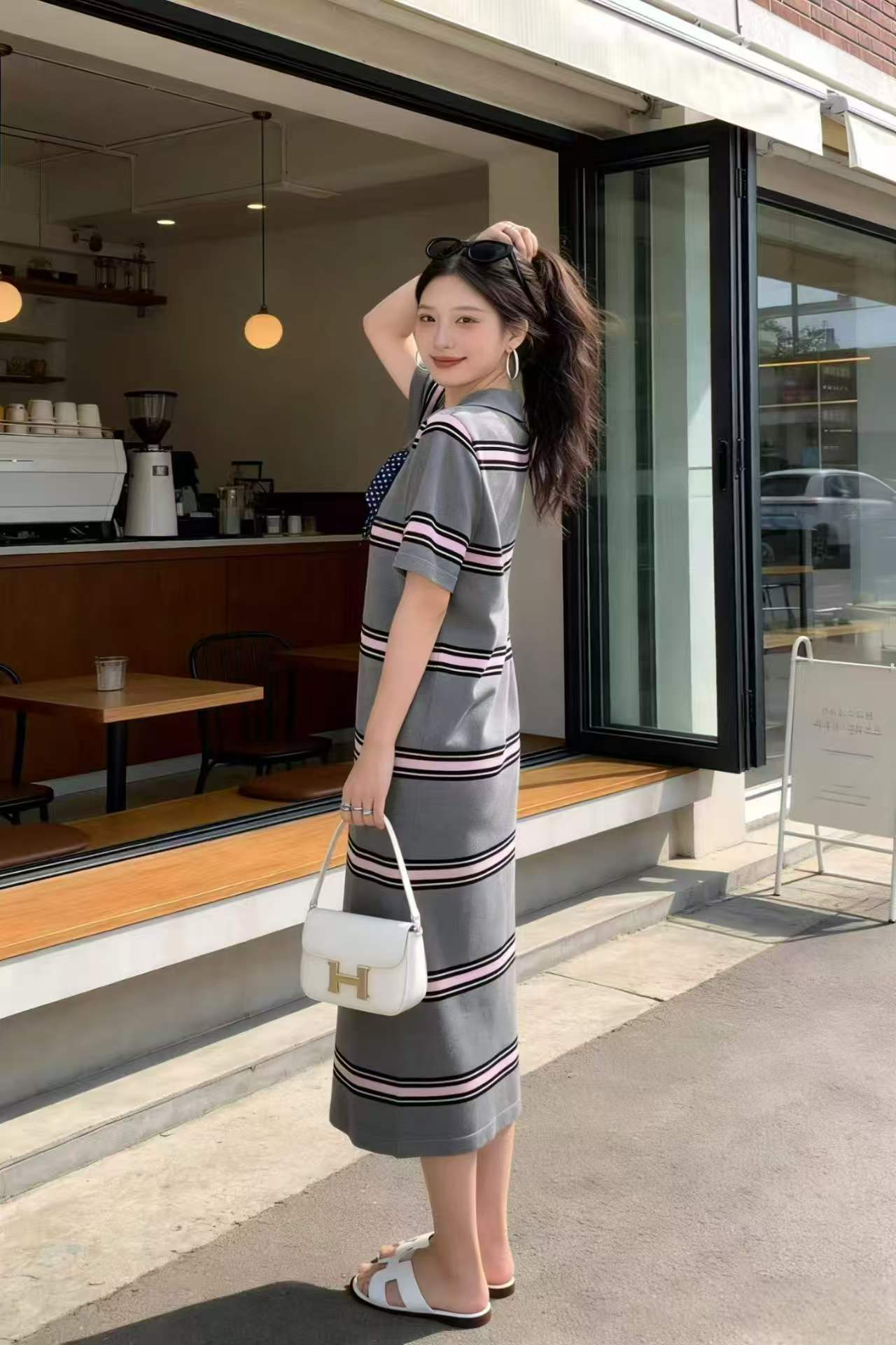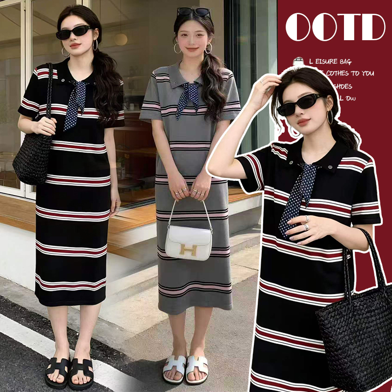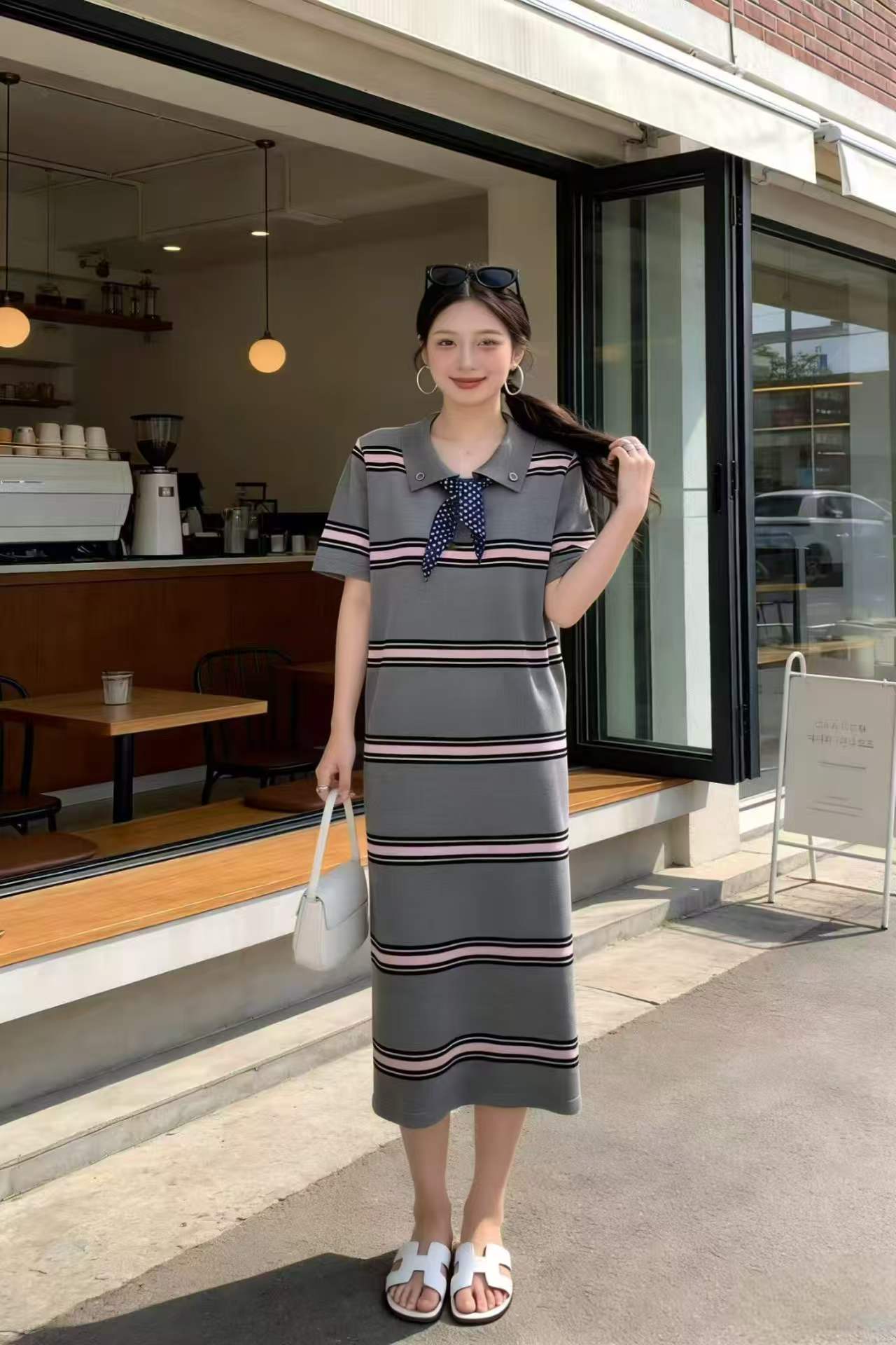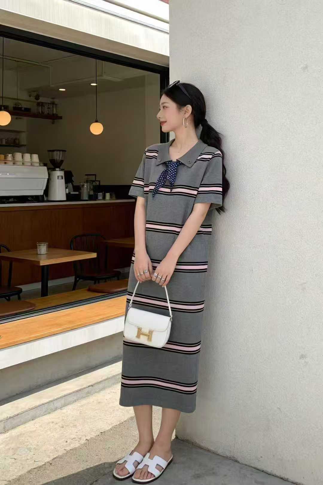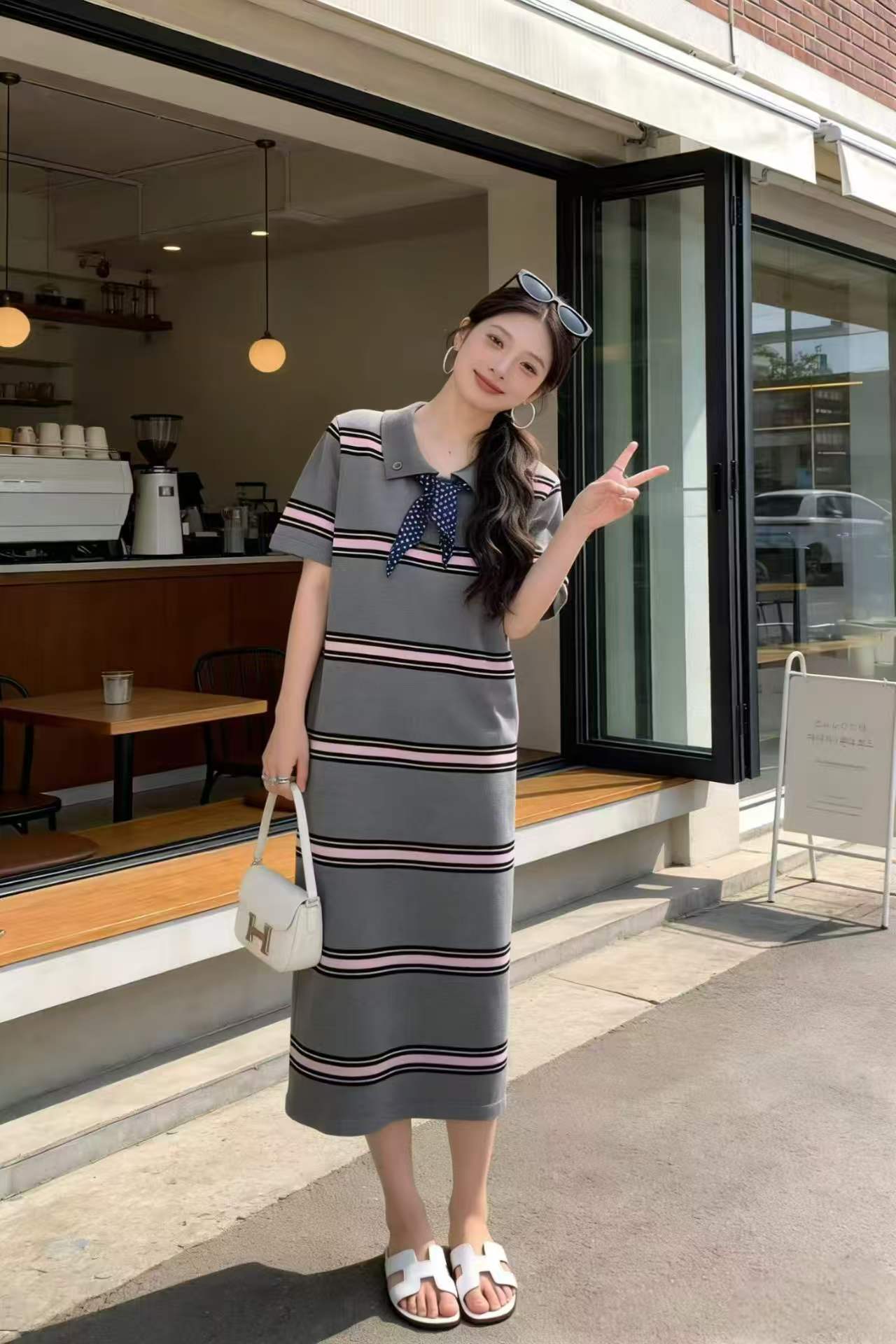 임산부 드레스 스트라이프 니트 POLO 칼라 납 축제 롱 스커트 임산부