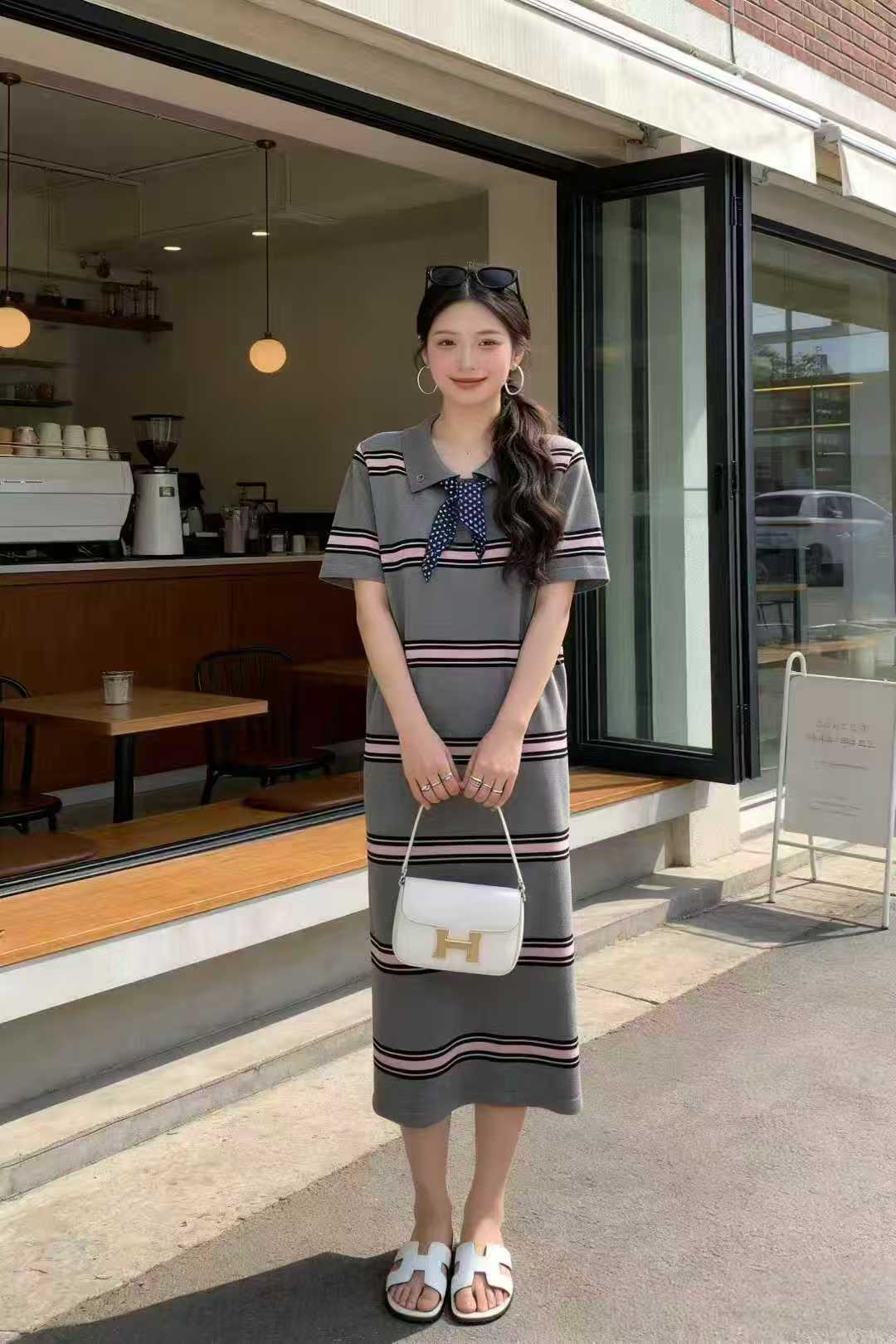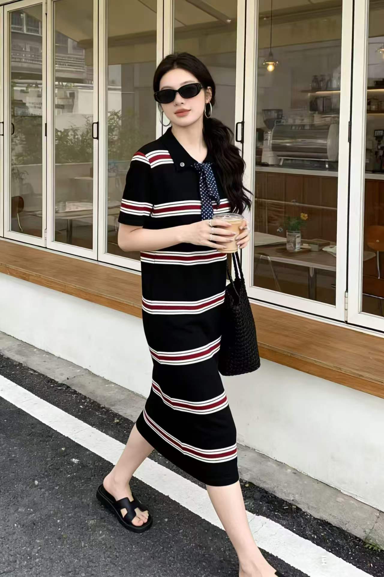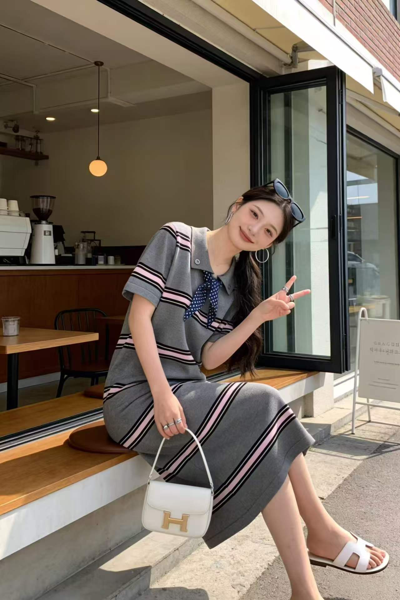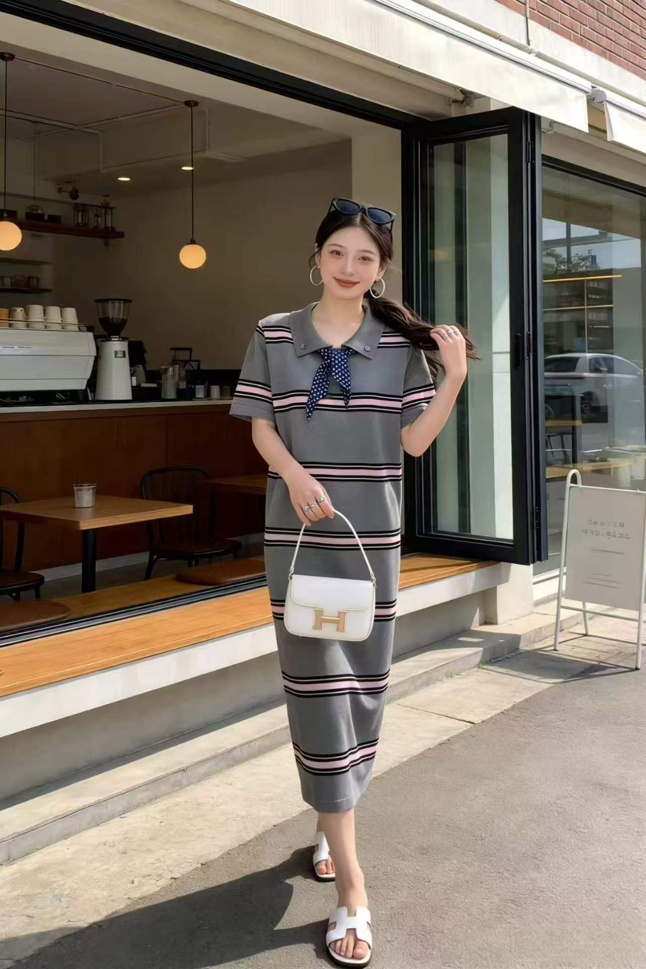 임산부 드레스 스트라이프 니트 POLO 칼라 납 축제 롱 스커트 임산부